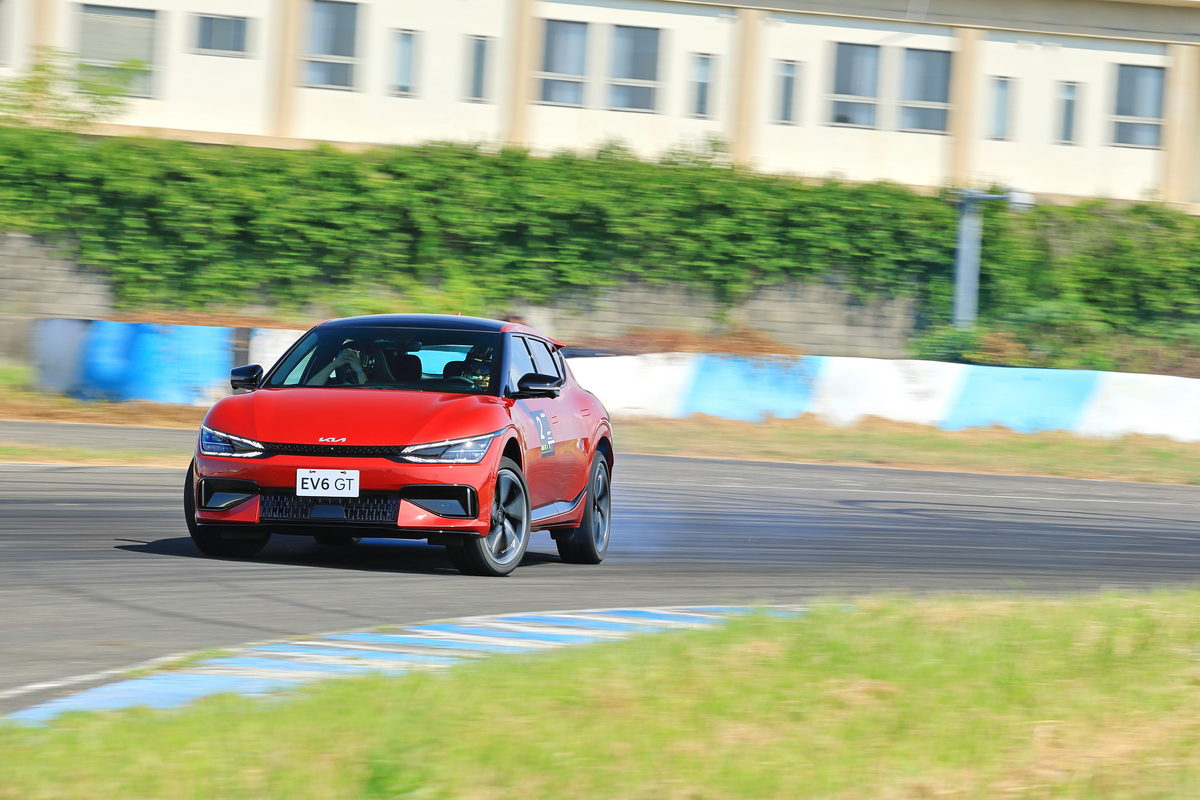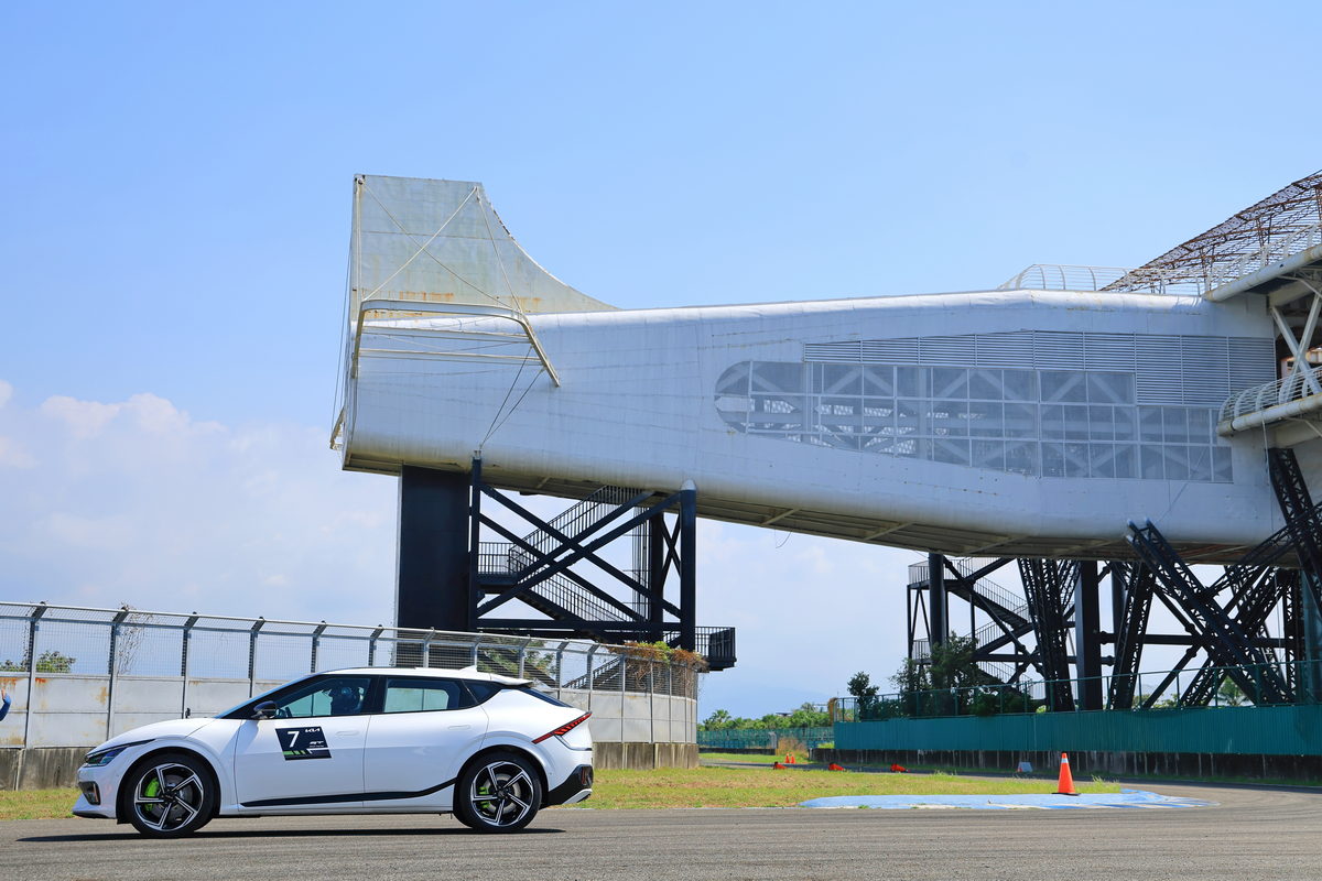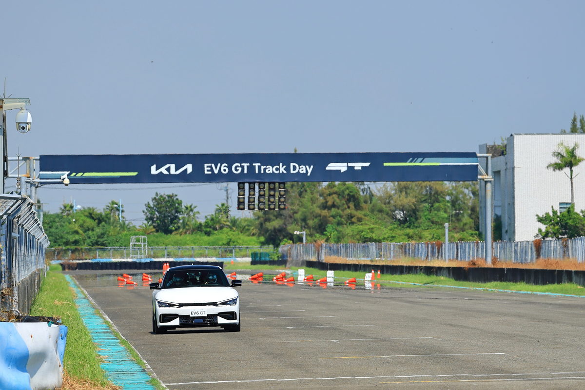 在櫃台領取進入賽道前必須戴上的安全帽後,首站我們前往第一道關卡直線加速&剎車動態體驗,在教練的提示下,我們只要按下方向盤上的GT模式按鍵,喚醒EV6 GT的585ps/75.5kg.m最大動力,接下來只要大腳踩足“電門”,感受這部0-100km/h僅3.5秒的猛烈加速貼背感,而更有趣的是,在大鵬灣的大直線路段中體驗0-100km/h加速度其實稍縱即逝,同時EV6 GT的75.kg.m飽滿加速扭力更適合在此路段體驗0-160km/h的加速測時,於是我與教練兩人坐進EV6 GT,在直線底的大飛機地標下開始起步加速至160km/h,沒想到兩個人約莫150kg的載重,0-100km/h僅4.133秒達成、0-160km/h更是飛快的9.003秒,同時通過龍門後,也不需過於重踩煞車,透過自身的動能回收系統作動下,不僅感受充滿效率的減速之外,同時也將動能轉化為電能回充至電池之中,我們這一趟連續衝刺了10多次,EV6 GT卻沒有絲毫熱衰退現象,換成是過往的汽油動力車款,不僅早已衰退,而且為了做出最佳數據,更需要關閉冷氣熱得半死,但我們在EV6 GT上,始終享受著沁涼的恆溫空調,實在太爽快了。