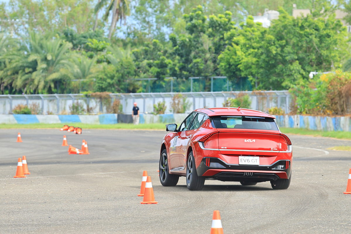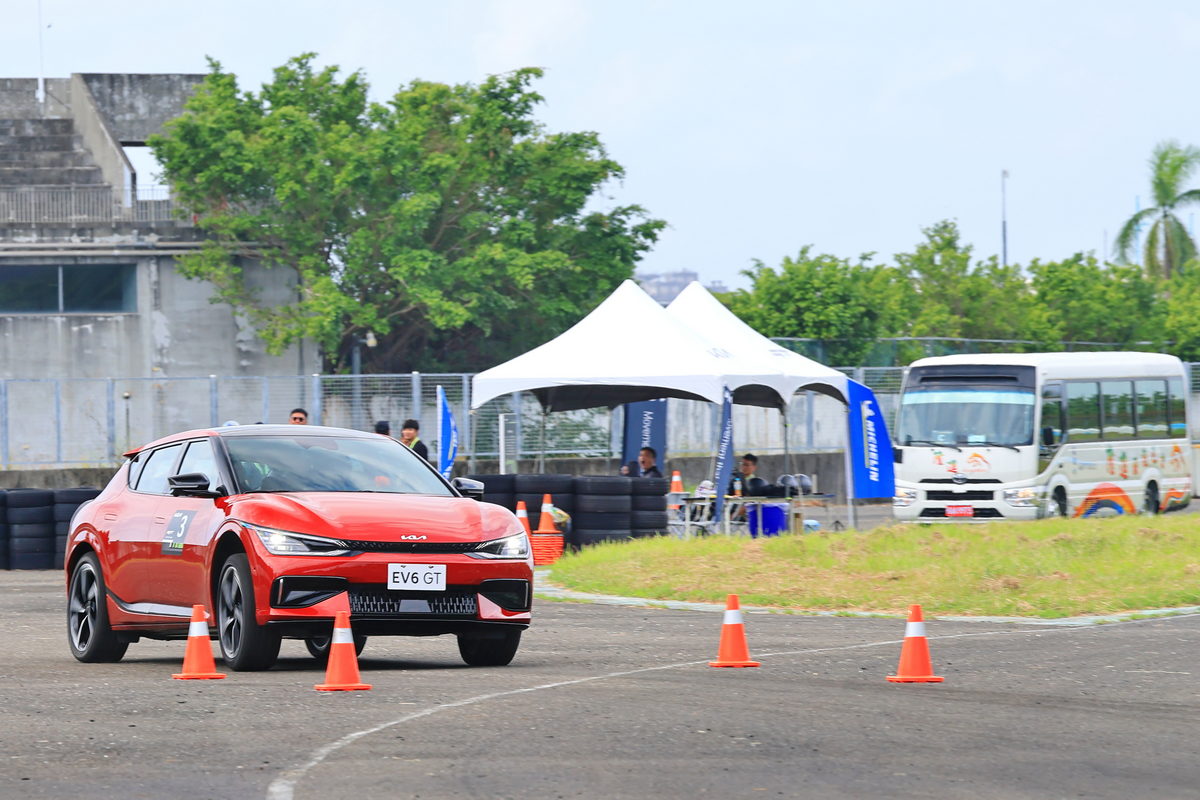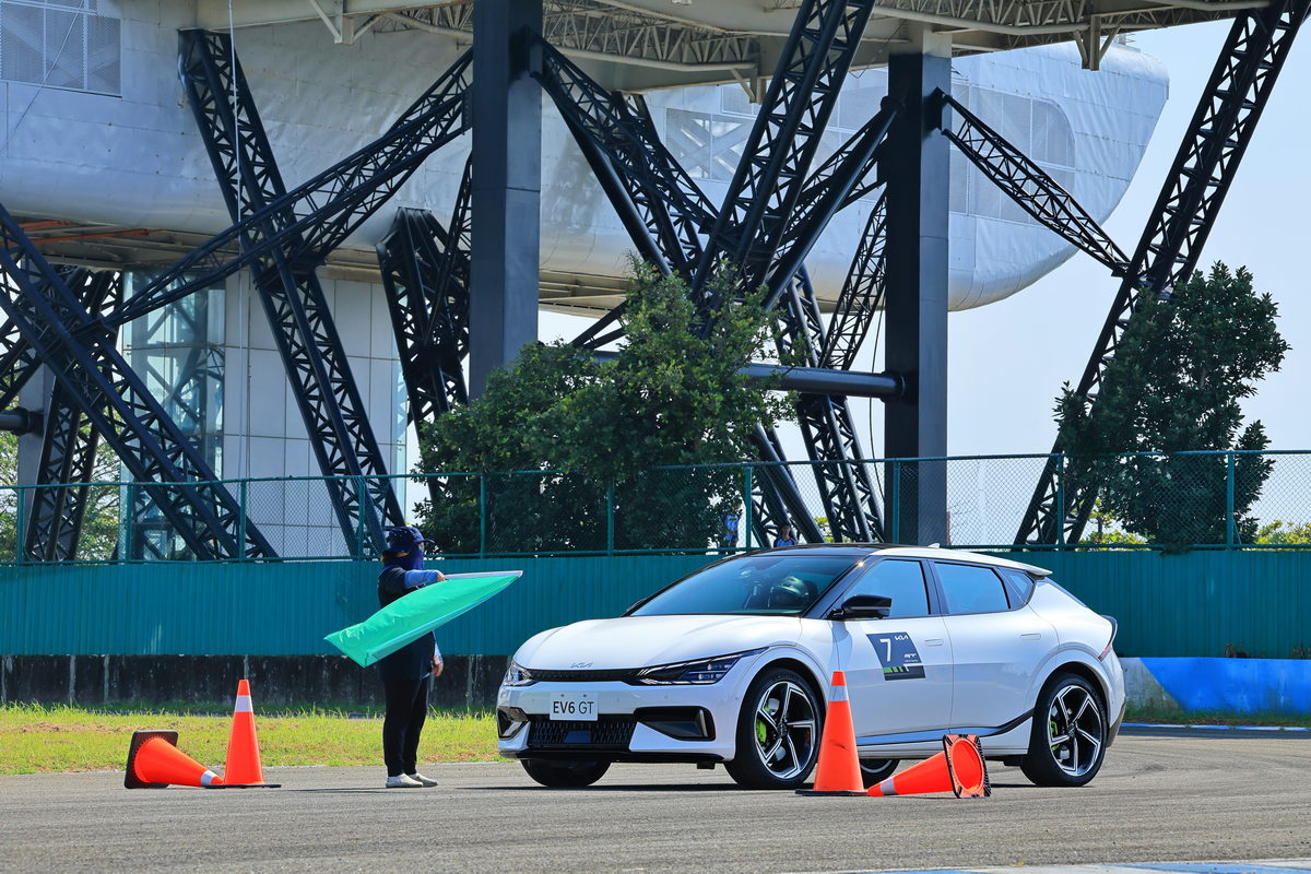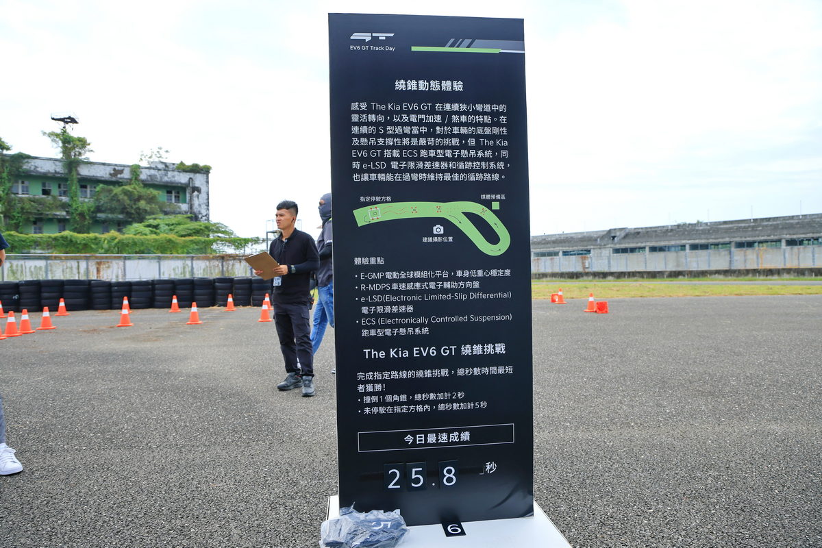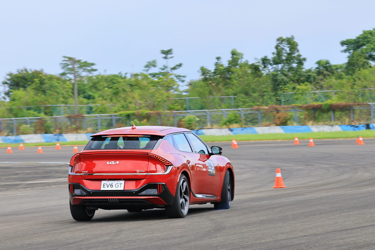 體驗完直線加速&剎車動態關卡後,緊接著我們來到以3-5號彎為設計基礎的第二道關卡繞錐動態體驗,過往透過繞錐體驗一部車輛的底盤硬朗與操控直覺,多為是在直線路段中盡情地轉動方向盤,通過筆直擺放的錐筒們。但這一次,卻不是這麼回事,這一次為了體現EV6 GT在底盤設計上,透過E-GMP電動全球模組化平台給予低重心駕馭感,以及搭配ECS跑車型電子懸吊系統在過彎時感受2.1噸重的EV6 GT能如何硬朗的俐落過彎,因此在關卡設計上,採用S型彎道為架構,搭配錐筒進行複合式的S型過彎操控體驗,當輪到我坐進駕駛艙,踩下電門,轉動方向盤進入第一個錐筒時,隨即傳達至雙手的即是R-MDPS車速感應式電子輔助方向盤協助進彎時即為銳利的直覺反應,同時接續下一個錐筒的反向彎,更有著e-LSD電子限滑差速器的輔助作動下,通過各個錐筒更是像是熱刀切奶油一般的輕鬆滑順循跡路線,而這些急加速、急過彎繞錐再急減速共三個循環的繞錐體驗中,透過其低重心的配置與硬朗的跑車型電子懸吊,駕馭這部2.1噸重的SUV,卻相當游刃有餘、輕鬆寫意的暢快呢!