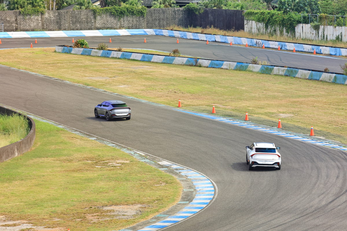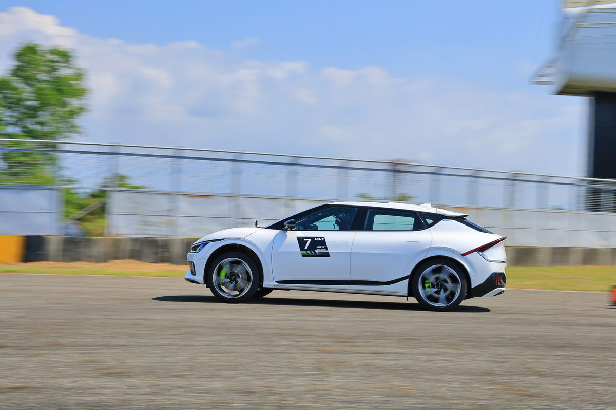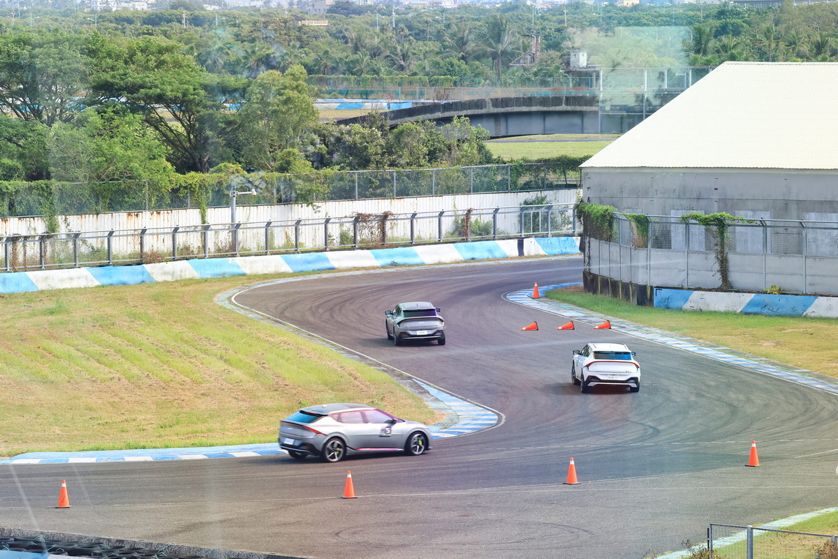 下午,準備進行大鵬灣全賽道的駕駛體驗,過往的賽道體驗中,許多因安全考量等問題,前導車教練不會開得太過 “用力”,為的是讓後方的駕駛能有著穩定的駕駛節奏進行體驗,但這一次,前車教練就是想要我們好好的感受EV6 GT對比過往汽油車在賽道上的不同,因此距離拉得相當遠,為的是讓我們能盡情的卯足全力想盡辦法跟上他,因此首圈我們從Pit出發,作為熟悉整圈賽道的體驗開始,到通過15號彎大飛機後的大直線開始,這第2圈即是全力追擊前導車教練的開始,過往開著汽油車的經驗,不外乎是進彎前確實的煞車減速進入彎道內後,看見Apex出彎點時再穩定持續加深油門擺脫彎道。但EV6 GT卻不是這麼玩的,在大直線上加足電門通過龍門後準備進入1號彎時,只是鬆開電門,隨即能感受EV6 GT動能回收系統帶來的強大制動力,因此剎車踏板踩踏的力度只能說是輕柔文雅來形容,同時這樣的狀態下,卻還能幫車輛電池進行充電,而在出彎時的再加速,更是有別於汽油車需要耐心的線性,只要看準出彎點的直線路徑後,毫不猶豫地踩足電門,EV6 GT的強大扭力即可帶你擺脫彎道的束縛,換句話說,對比汽油車在賽道上的每一個彎道油門煞車的比例不同,EV6 GT反而透過動能回收系統的效率,讓進彎的煞車時間延遲,同時保有優異的制動力,卻還能在出乎意料的極限下,透過大腳電門毫不猶豫的爽快出彎,這全新的駕馭賽道思維在幾圈下來熟悉之後,加上能在車內享受雙區恆溫冷氣與少了引擎、排氣管高頻的嘶吼,我想這樣的賽道奔馳不僅狂野,更是享受與自已對化的寂靜片刻呢!