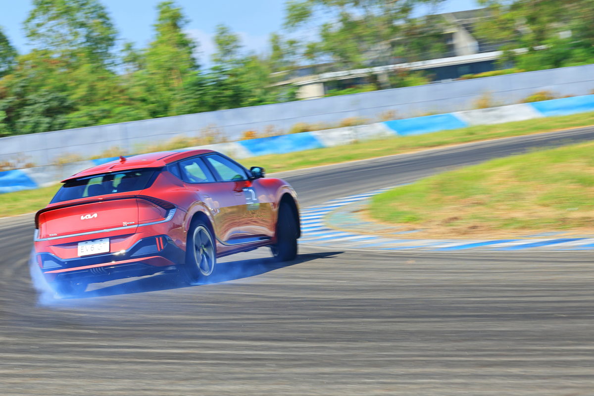 最後,早晨活動的最後一道關卡,即是我最為期待的Drift Mode飄移模式動態體驗,過往在大鵬灣拍攝賽道活動中,在這11-12號彎構築的複合彎道中,更是許多車手在此表演甩尾飄移的最佳體現路段,首先要進入可甩尾的Drift Mode飄移模式,必須將檔位處於P檔狀態下,接著按下方向盤上霓紅綠的GT按鍵,再踩住煞車長按ESC令其完全關閉後,最後雙手於方向盤後的動能回收撥片同時長按3秒以上,這充滿儀式感的熱血Drift Mode即可喚醒EV6 GT最完整的戰鬥力,而這一段體驗,其實對於不熟悉甩尾技巧的我來說,還是坐進副駕駛座,感受教練完美的示範甩尾俐落的白煙番長動態,以及側向G力的轉移即是最爽快又安全的體驗了,而對我來說,最新鮮的感受不是EV6 GT能透過強大的動力輸出享受著飄移於賽道中的曼妙舞步,而是在飄移的過程中,賽道上除了視覺上的白煙瀰漫的華麗舞姿之外,現場只有輪胎與路面對抗嘶吼的聽覺饗宴,這少了過往常見的引擎與排氣聲浪,電動車甩尾凸顯的寧靜雅緻感更是相當獨特的體驗呢。