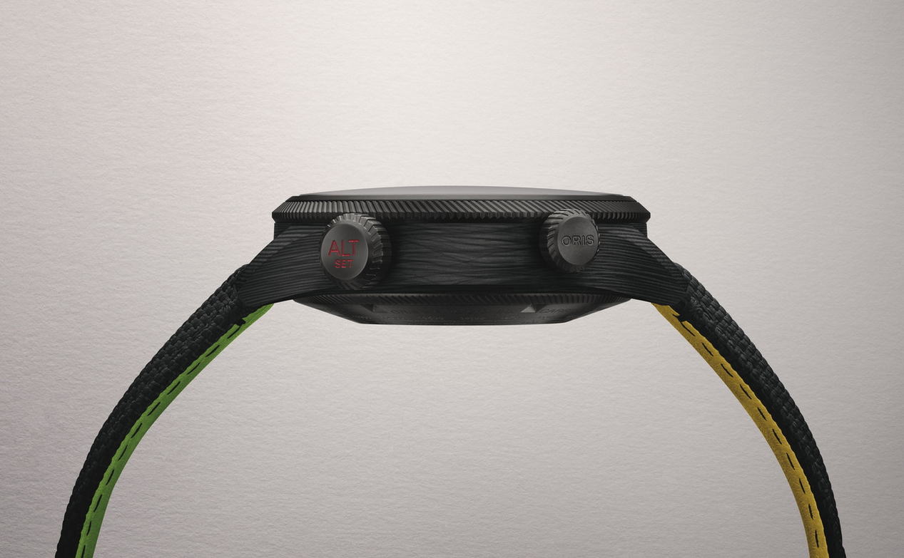 直徑47mm的錶殼由Oris與瑞士9T Labs合作研發的碳纖維複合材質製成,重量僅為鈦金屬的三分之二,卻更加堅固。每只錶殼的紋理皆獨一無二,宛如樹木年輪。腕錶搭載升級版的 Calibre 793自動上鍊機芯,提供56小時動力儲存。搭配黑色織物錶帶與亮色皮革內襯,並配備灰色PVD鈦金屬摺疊扣;10 bar防水及底蓋換算刻度,更提升了實用性。