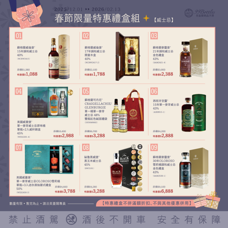 農曆新年將至,英蓋爾精品洋酒隆重推出「2026新春精選禮盒」,嚴選世界頂級威士忌、紅白葡萄酒與特色烈酒,搭配限量精美包裝,為親友團聚與新春賀禮增添格調與祝福。