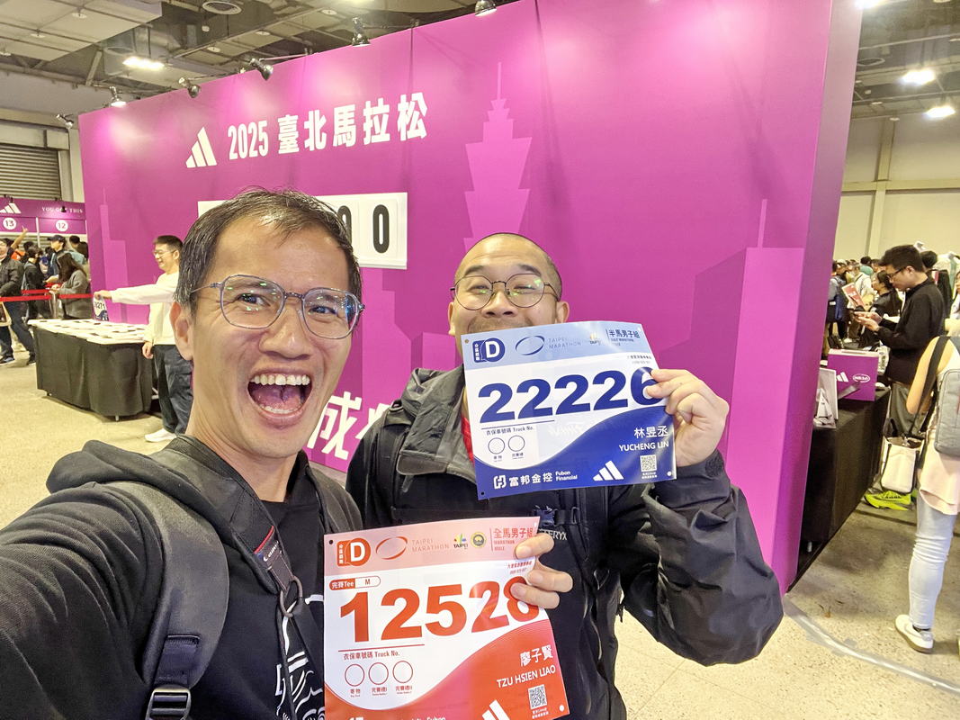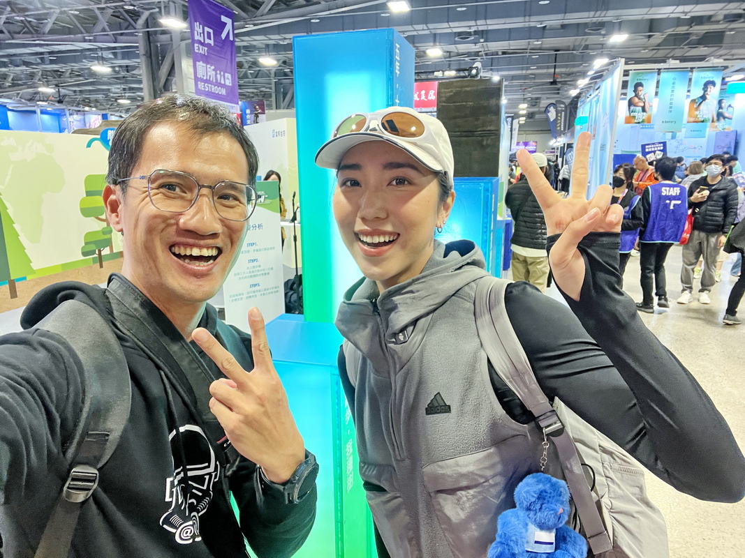 領好這次參賽號碼布,在櫃檯確認晶片感應一切正常後,跟網猴於一旁完賽時間牆拍張期盼這次全馬完賽的目標時間,在路跑練習過程中,提供我許多訓練、補給上相當有成效建議的練跑明燈“匡寓哥”、在長榮馬不解為何又發生抽筋狀況,而後分享以及讓我更了解電解質流失與補充策略的“豹大王”、在網路上常彼此加油與分享訓練過程的“Hi Cindy”,以及在排隊過程中與跑友一同等待的閒聊,卻發現是族譜上遠親的新朋友“信源哥”,一起在這場熱鬧的臺北馬EXPO相聚拍張紀念照後,正式開啟這場10周年的臺北馬EXPO展場巡禮啦!