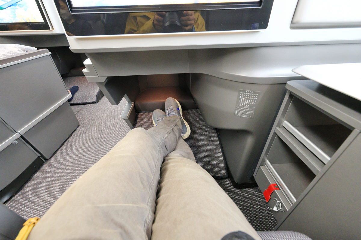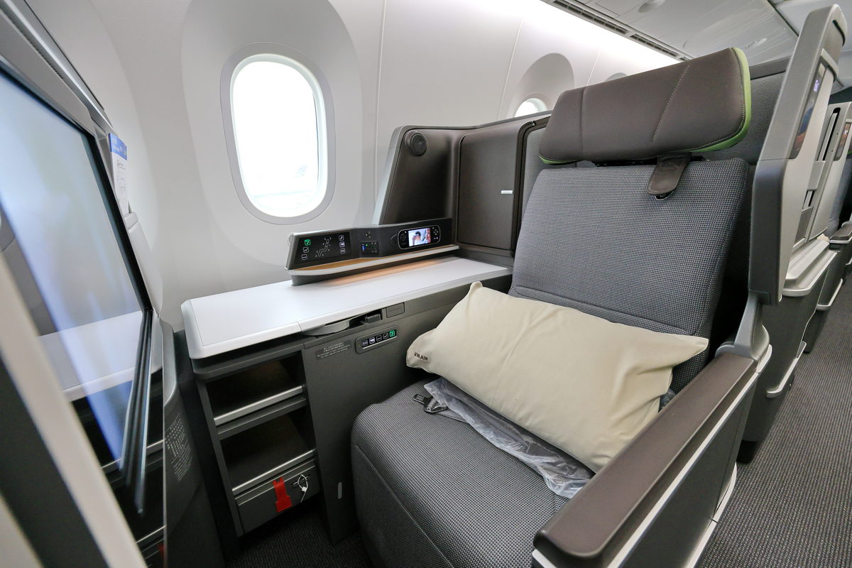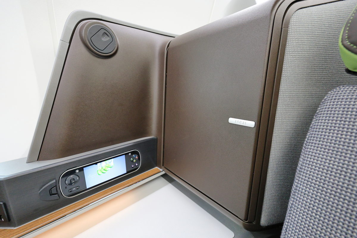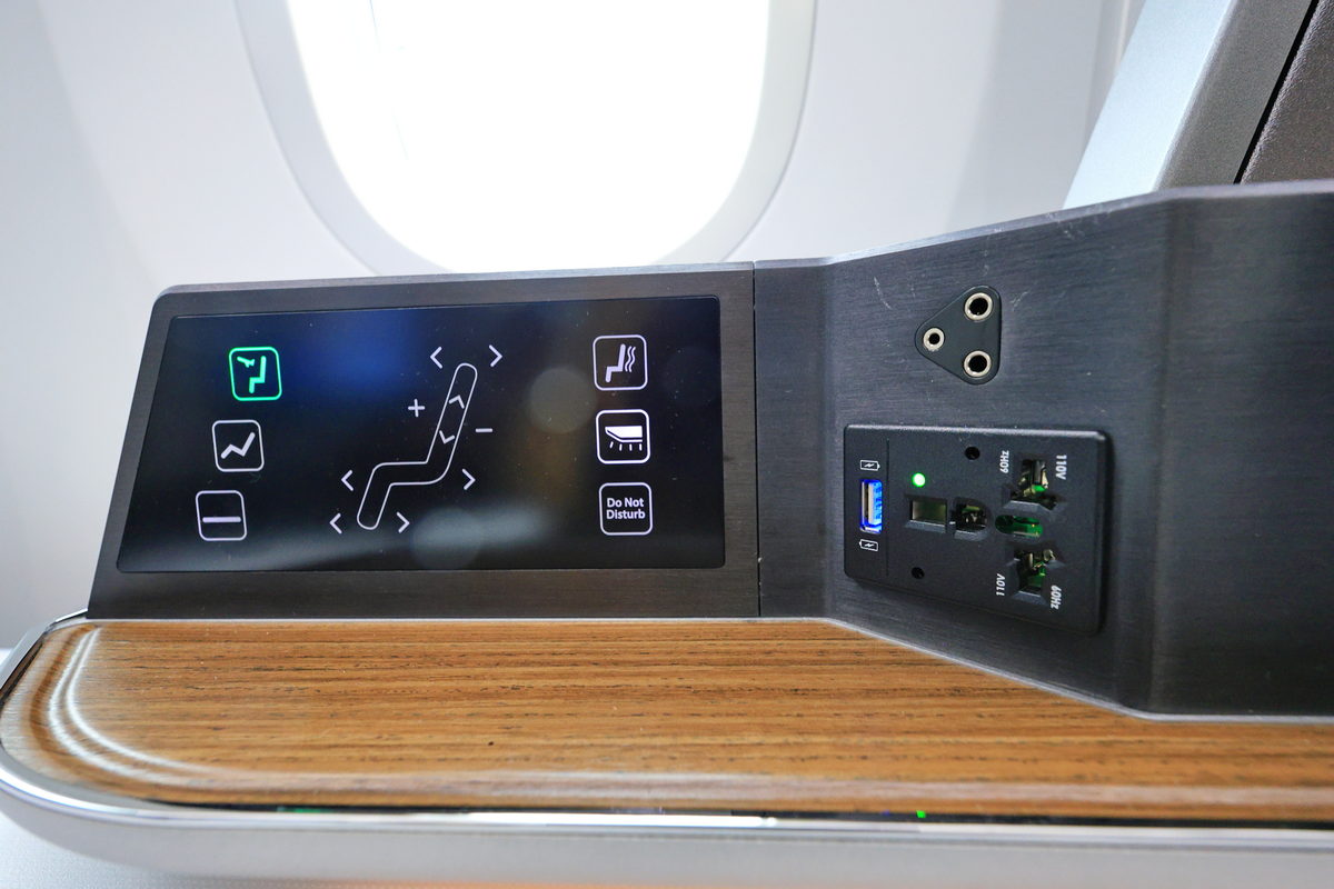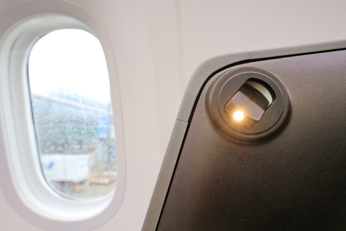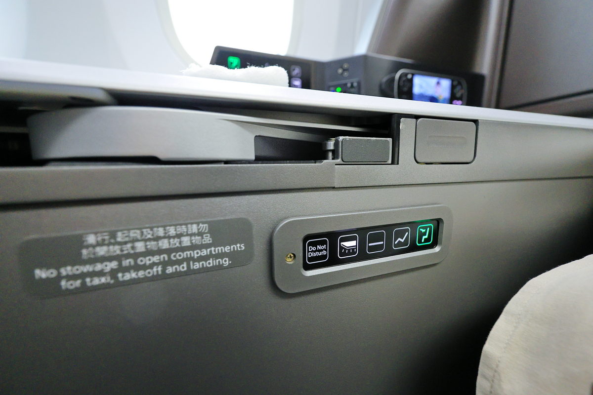 坐進椅子後,首先安全帶配置像是乘坐汽車的3點式安全帶,在椅背需豎直乘坐的起降狀態下,頭枕、椅背以及相當令人在意的椅墊至大腿支撐性,皆有著相當服貼身形的舒適表現,再加上能完全伸直腿部的椅距空間,實在暢快。起飛進入巡航高度後,右側扶手上的座椅控制面板不僅提供起降豎直椅背、長達193cm平躺的床鋪模式等快速調整之外,同時附有依照自己身形需求進行細微調整甚至是按摩功能的舒適享受。此外在座椅控制面板右側,配置耳機孔、萬國插座以及USB充電孔的服務設計,更滿足商務辦公時需要多個3C裝置充電的實用需求。