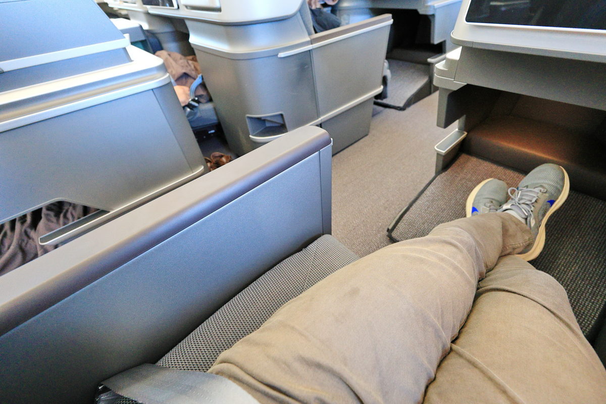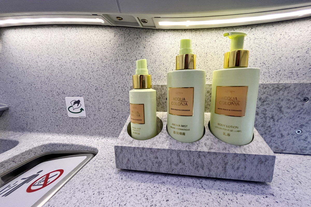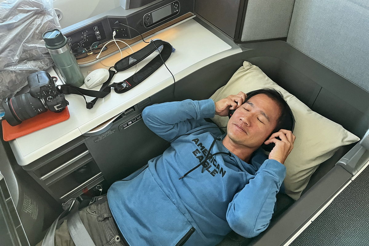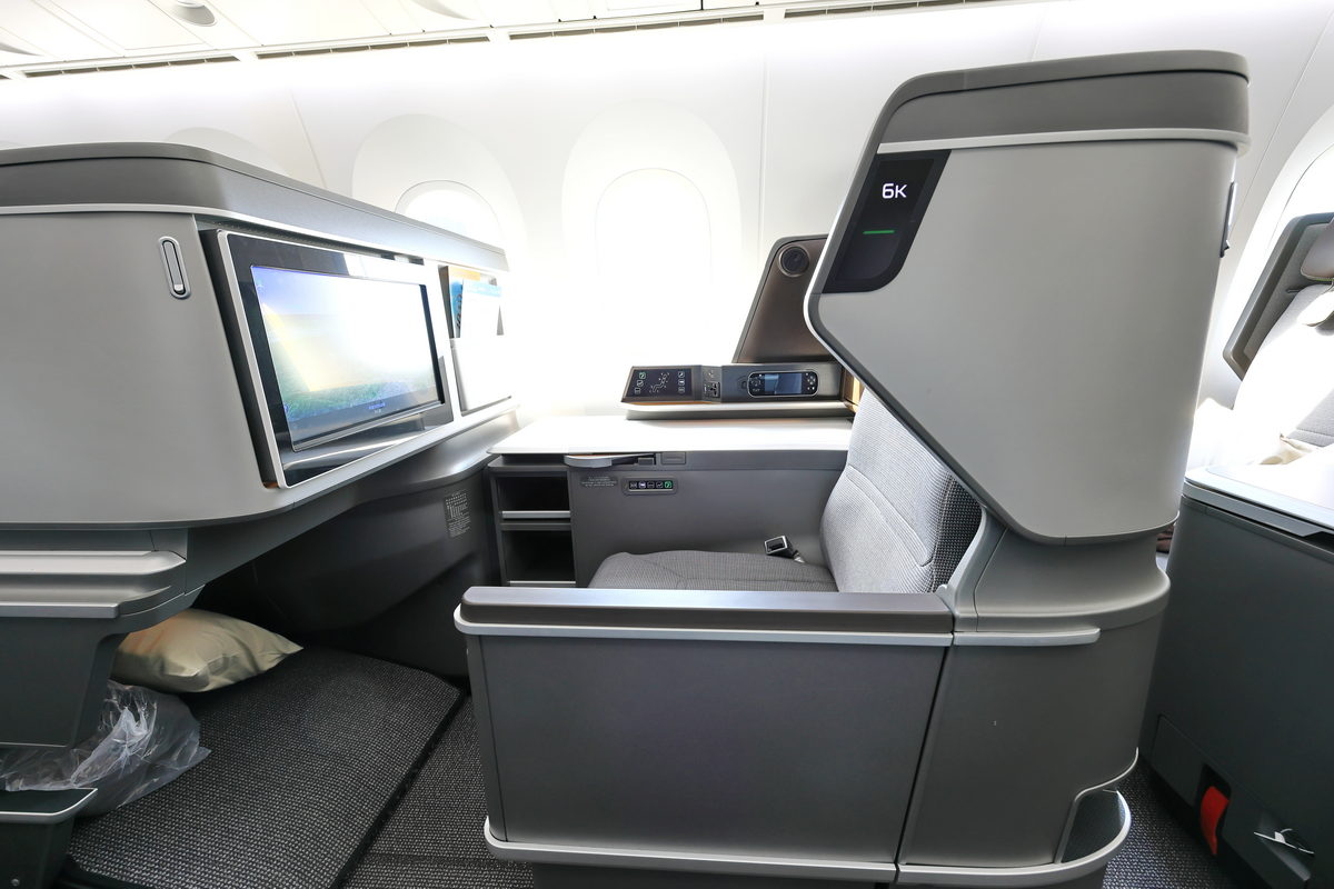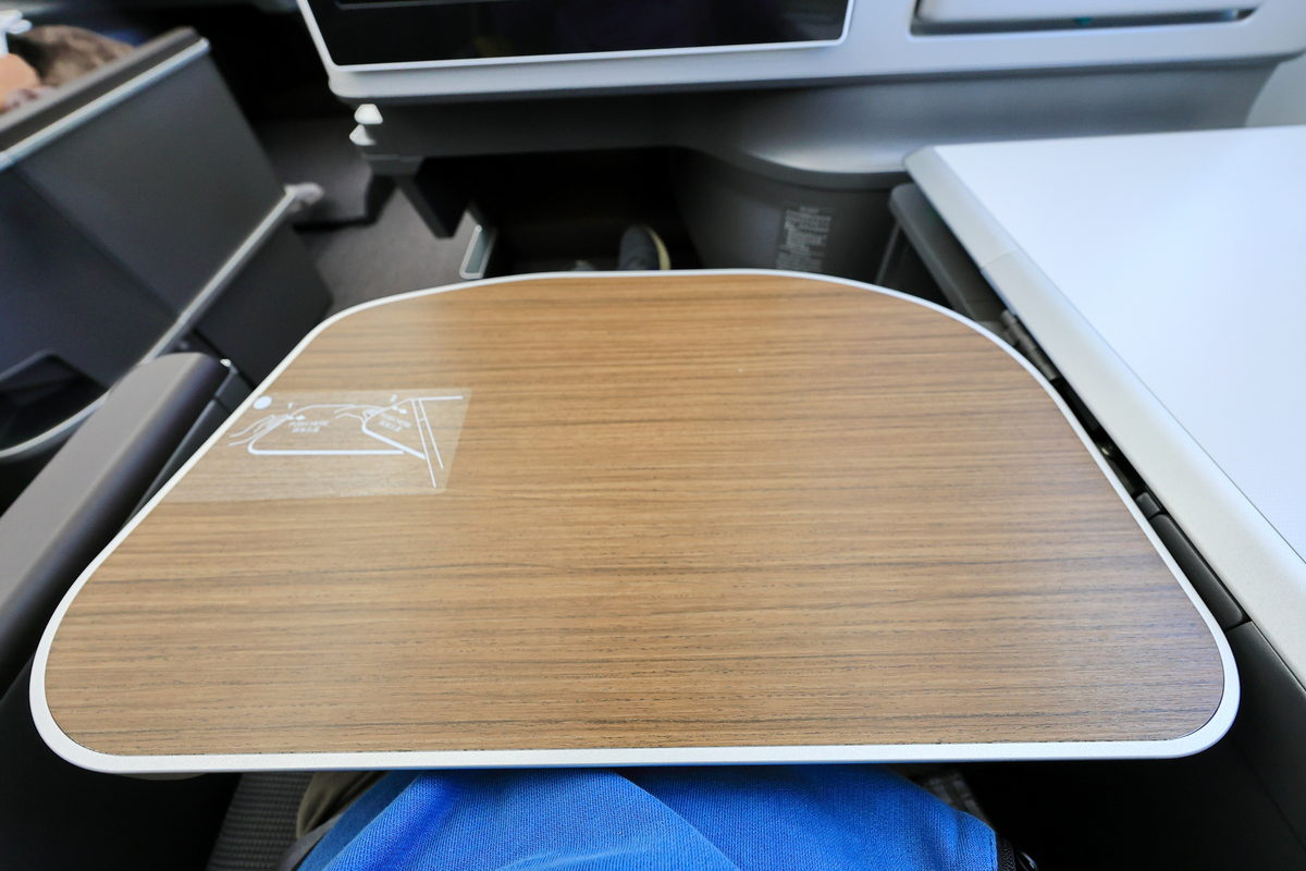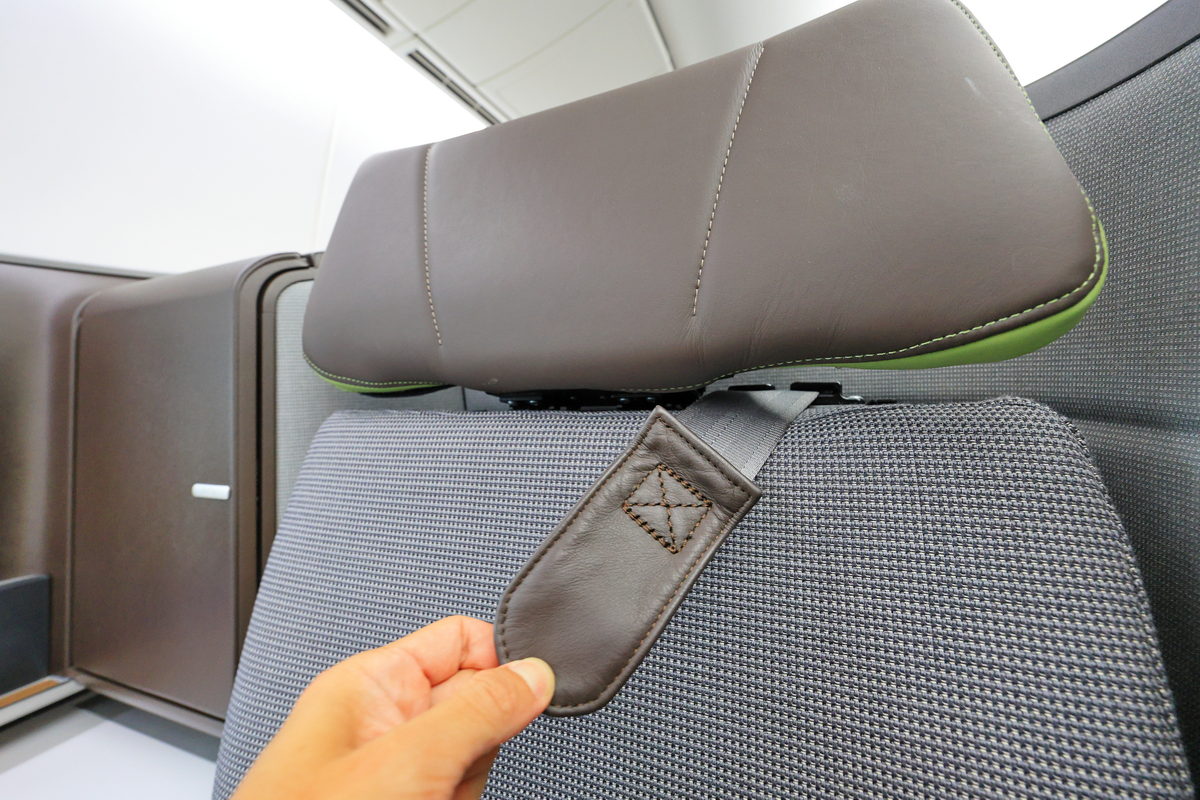 坐進椅子後,首先安全帶配置像是乘坐汽車的3點式安全帶,在椅背需豎直乘坐的起降狀態下,頭枕、椅背以及相當令人在意的椅墊至大腿支撐性,皆有著相當服貼身形的舒適表現,再加上能完全伸直腿部的椅距空間,實在暢快。起飛進入巡航高度後,右側扶手上的座椅控制面板不僅提供起降豎直椅背、長達193cm平躺的床鋪模式等快速調整之外,同時附有依照自己身形需求進行細微調整甚至是按摩功能的舒適享受。此外在座椅控制面板右側,配置耳機孔、萬國插座以及USB充電孔的服務設計,更滿足商務辦公時需要多個3C裝置充電的實用需求。