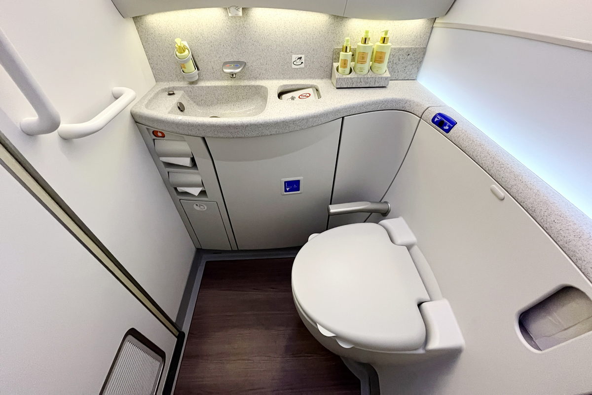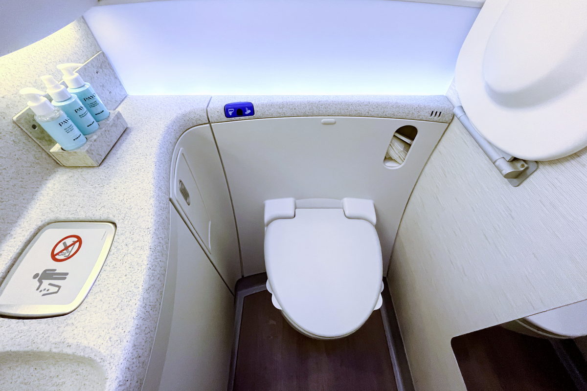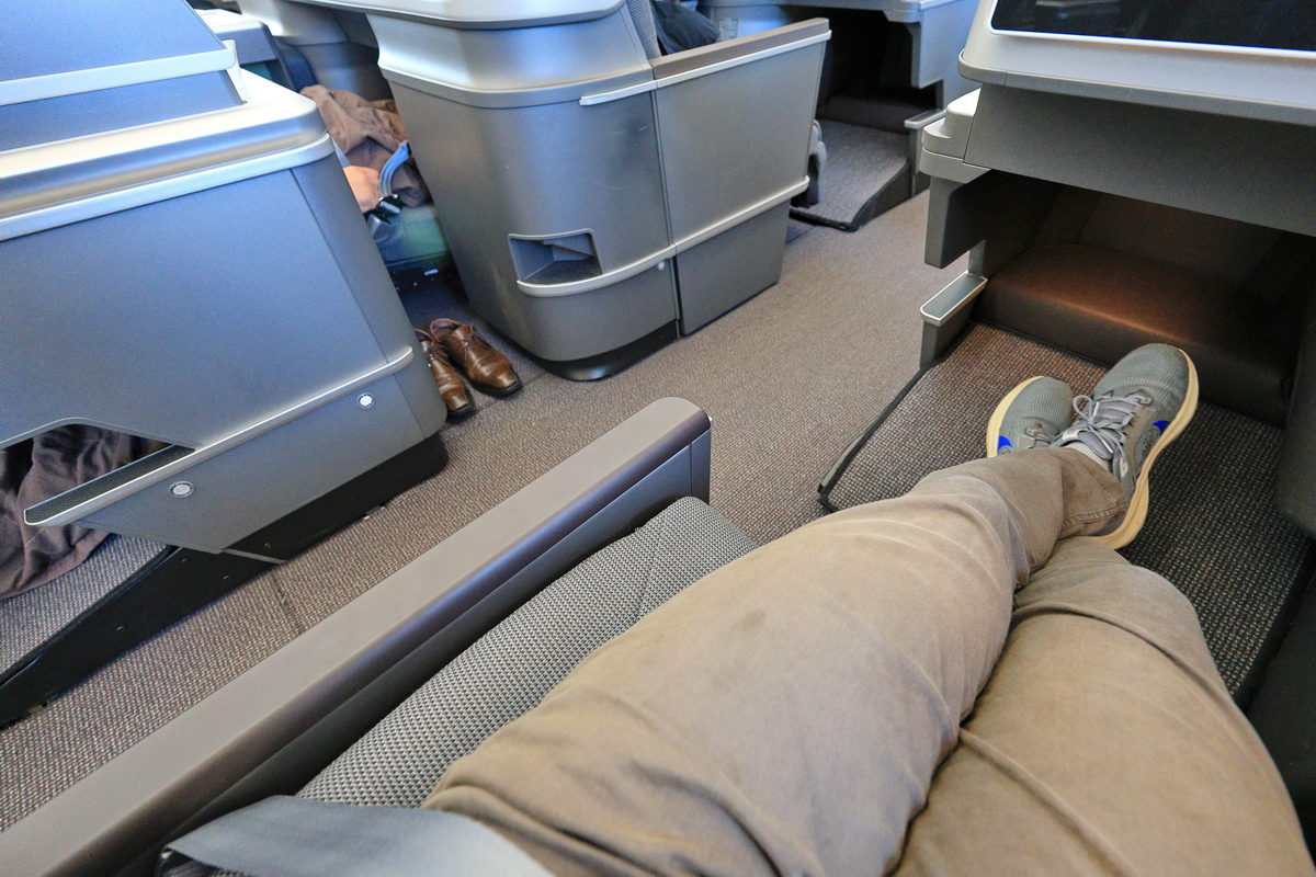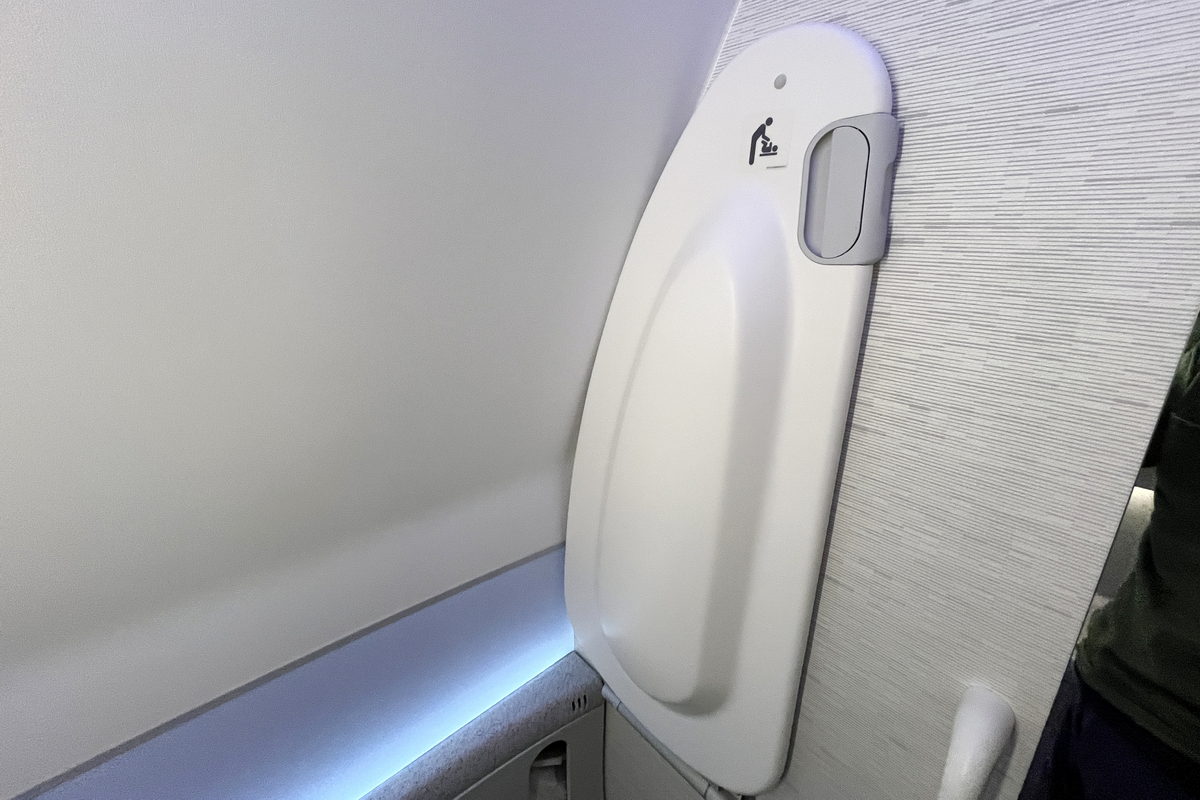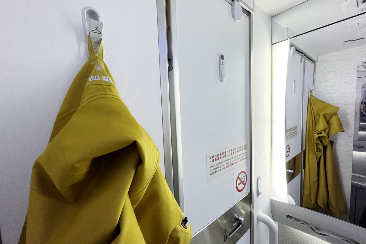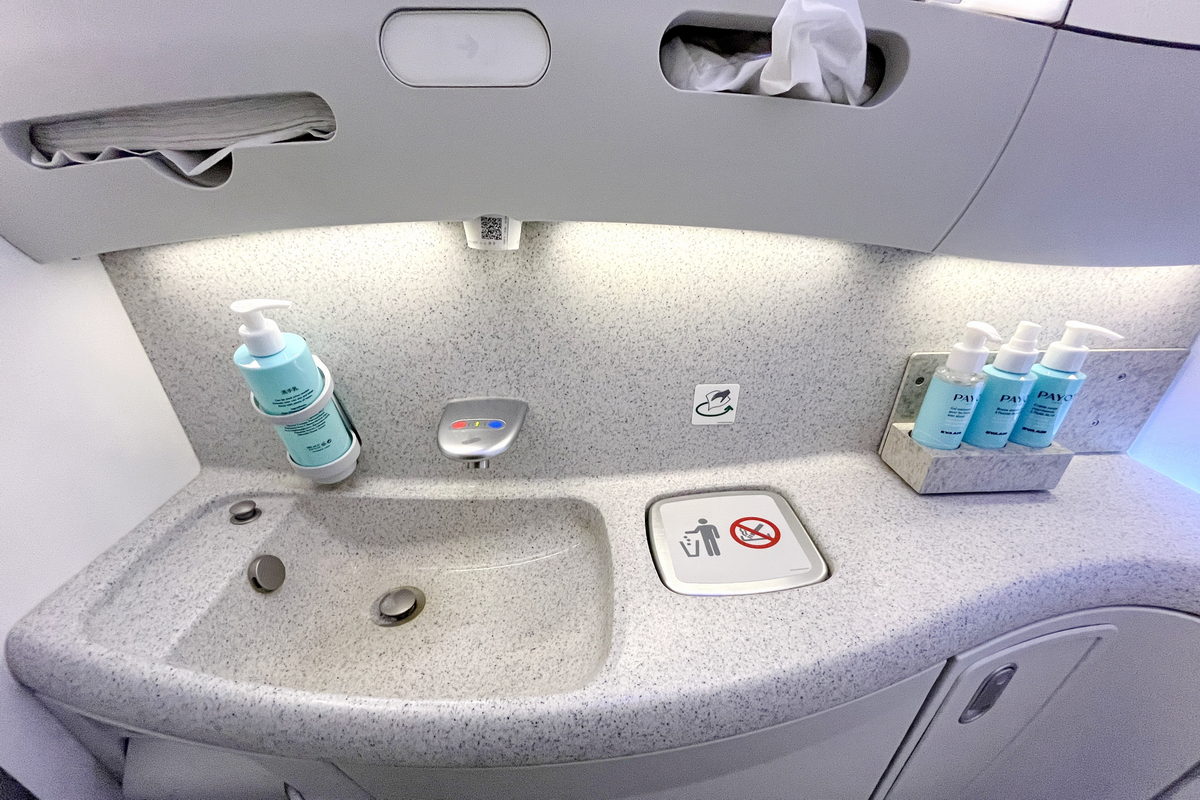 坐進椅子後,首先安全帶配置像是乘坐汽車的3點式安全帶,在椅背需豎直乘坐的起降狀態下,頭枕、椅背以及相當令人在意的椅墊至大腿支撐性,皆有著相當服貼身形的舒適表現,再加上能完全伸直腿部的椅距空間,實在暢快。起飛進入巡航高度後,右側扶手上的座椅控制面板不僅提供起降豎直椅背、長達193cm平躺的床鋪模式等快速調整之外,同時附有依照自己身形需求進行細微調整甚至是按摩功能的舒適享受。此外在座椅控制面板右側,配置耳機孔、萬國插座以及USB充電孔的服務設計,更滿足商務辦公時需要多個3C裝置充電的實用需求。