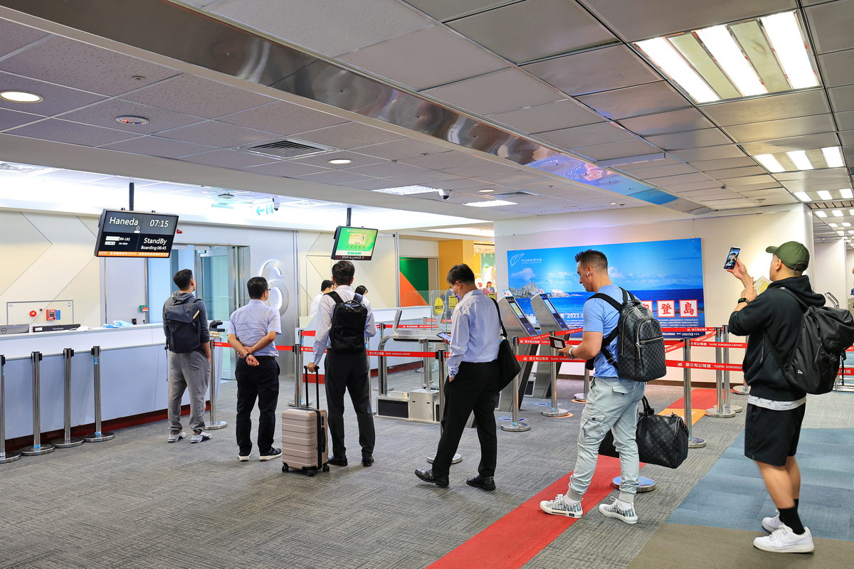 到了從東京羽田機場搭機返回台北松山機場的日子,抵達熟悉的羽田機場第3航廈,走進鋪設地毯的皇璽桂冠艙專屬通道,隨著地勤人員將行李繫上抵達台北松山機場後,能優先提領行李的Priorty標籤後,不到5分鐘的時間,已經完成行李托運與領取登機證的報到手續了,實在輕鬆快意。