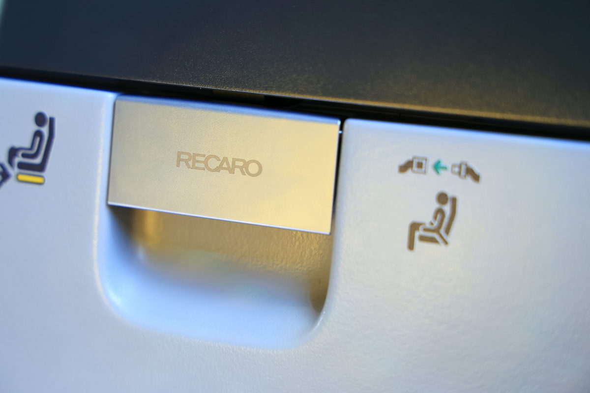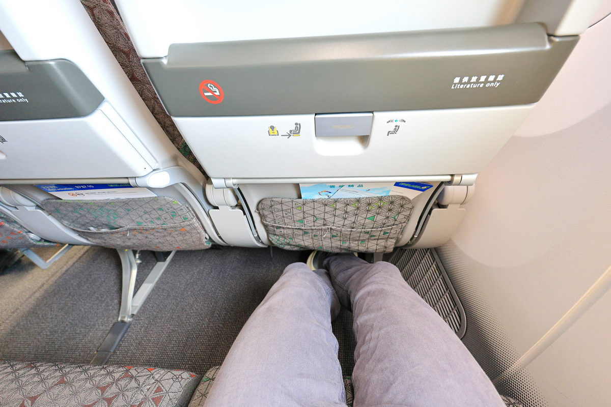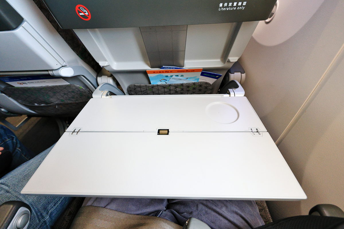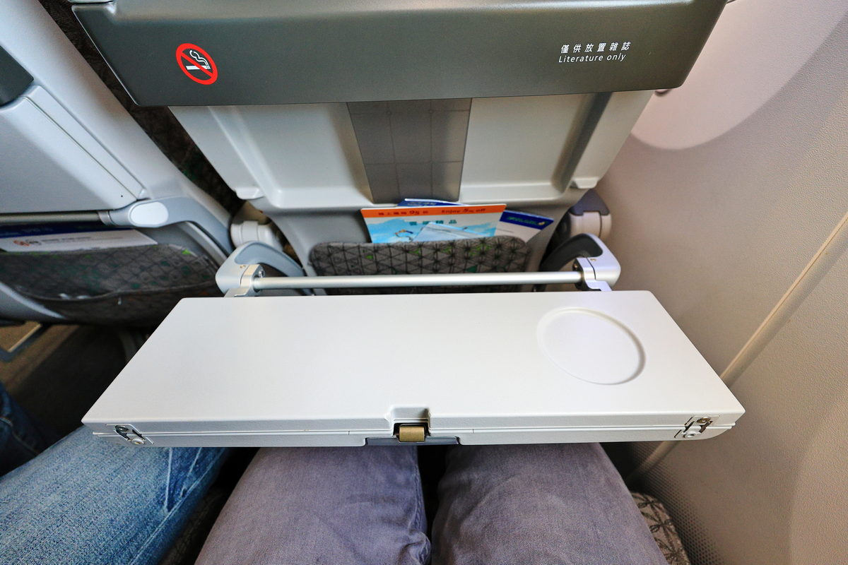 不過進入經濟艙座椅坐下後,前方椅背上桌板固定扣環顯示斗大的RECARO這德國知名座椅品牌,已彰顯飛機座椅有著相當優異的人體工學設計,而這張座椅不僅提供背部與大腿的服貼支撐性之外,同時可調整曲度的蝴蝶枕設計、軟硬適中的泡棉材質,搭配17.7吋寬度以及31-32吋的椅距空間,對於173cm、65kg的我來說,有著雙腿可以愜意交換交叉的空間,已是相當寬敞舒適。