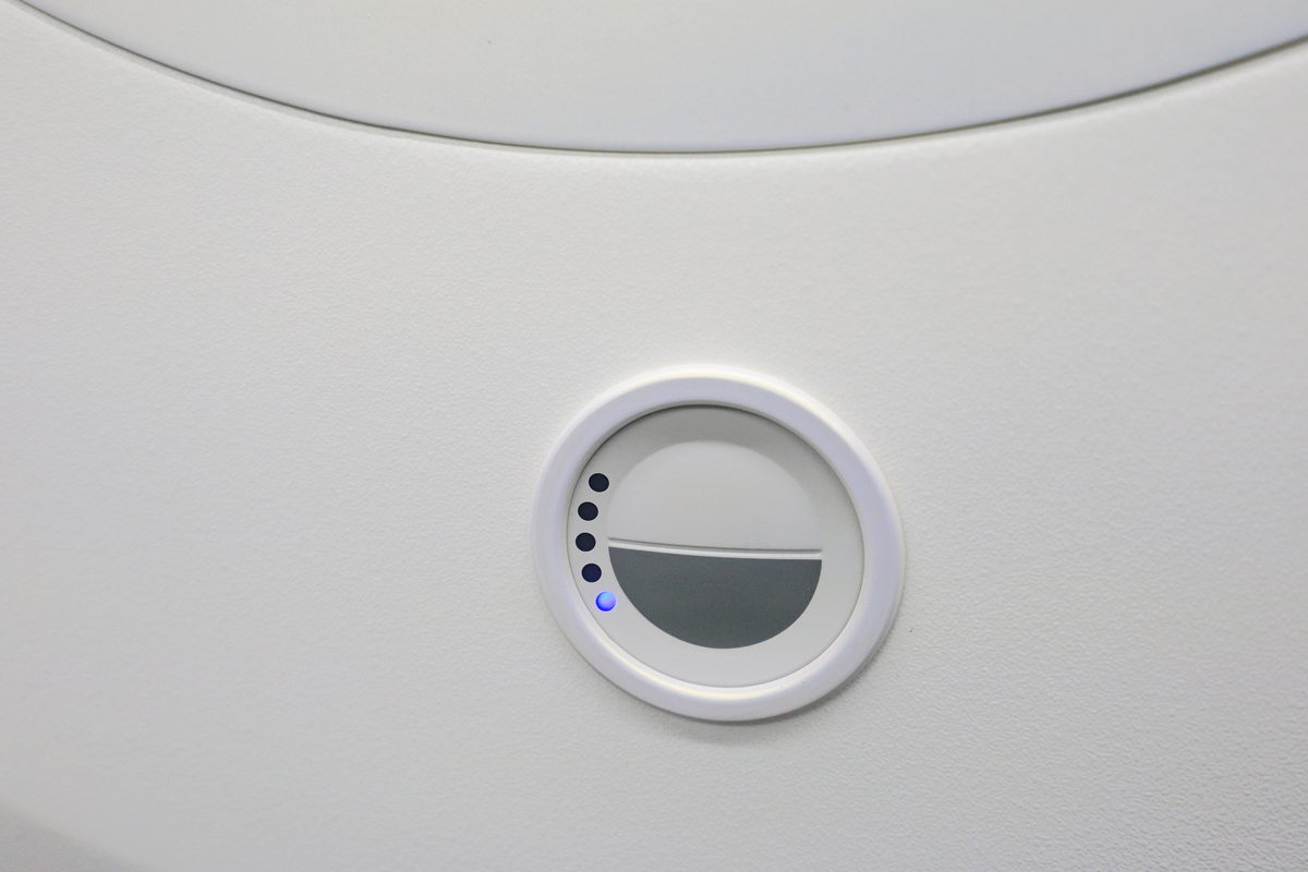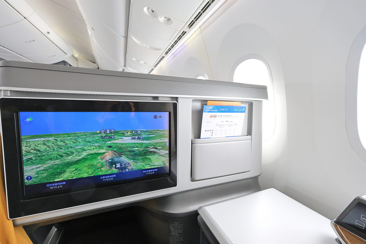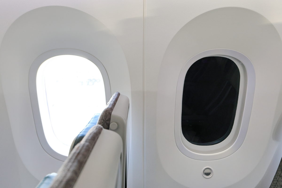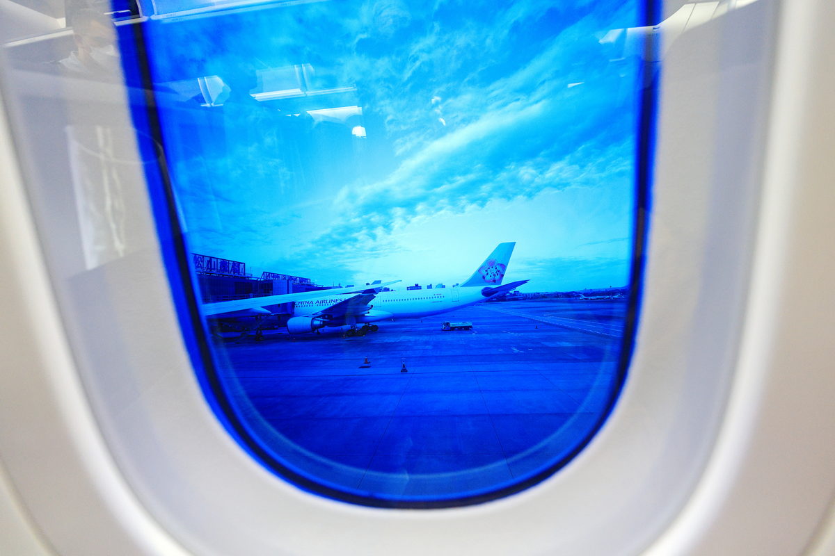 隨著飛機起飛一路攀升至4萬英呎巡航高度以及抵達東京降落後,一路欣賞著窗外的碳纖維複合材質機翼隨著氣流向上呈現微笑曲線姿態,並映襯著沿途台北盆地、高低雲層,以及突破雲層後旭麗的陽光照耀於台灣東北角海岸、有著醒目晴空塔地標的日本東京市區景色,實在令人心曠神怡,相當舒暢。而在面對這樣的艷陽下,有時候難免會覺得相當刺眼,但又想欣賞窗外雲海景色時,787-10的窗戶可進行有如電子式漸層減光濾鏡的5段式明暗調整,因此可調整出不刺眼又能欣賞窗外景色的深度,而當想要小歇片刻需要完全屏蔽戶外光線時,窗戶從最為明亮轉為完全不透光的狀態下僅需50秒左右即可完成!
