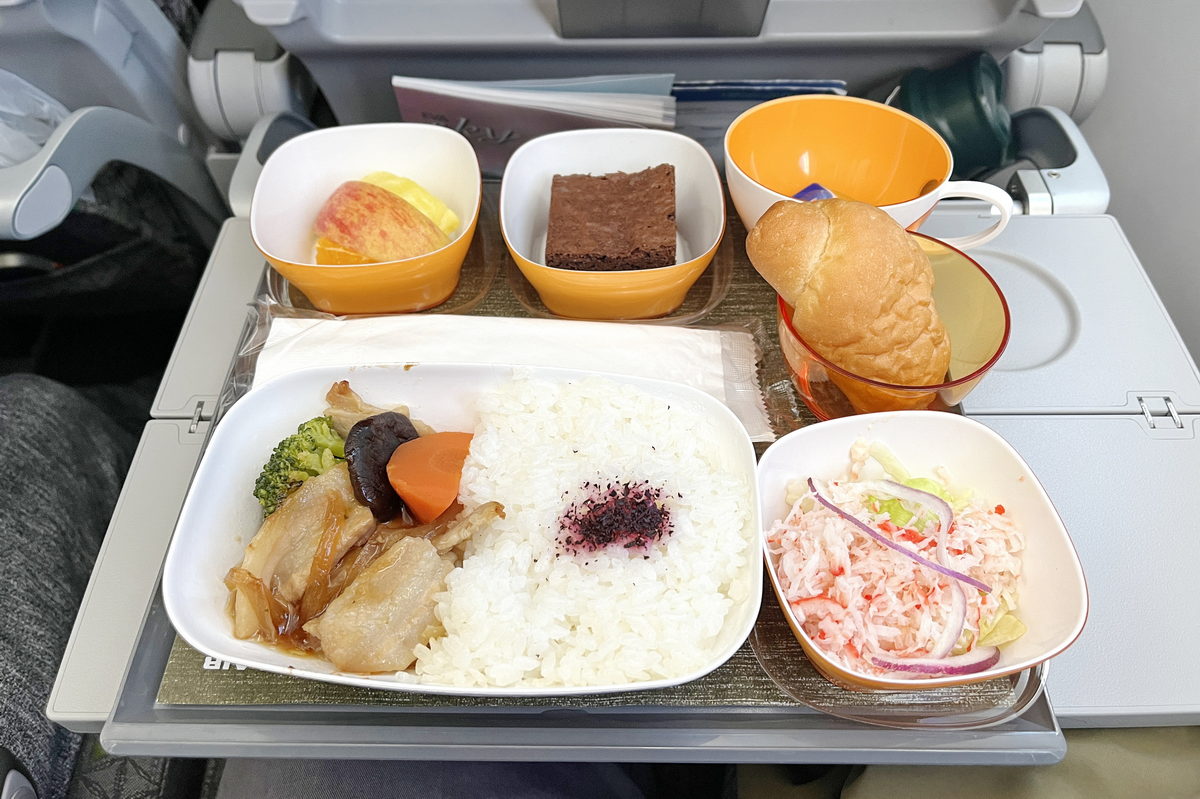 而在用餐的時刻,前往東京的去程我選擇打拋豬肉飯,回程薑燒豬肉佐白飯為這兩次出差時搭乘經濟艙的餐點,這兩道豬肉餐點搭配白飯時,由於醬汁相當豐厚,因此與白飯一同品嚐時相當濕潤可口,用餐過後再品嘗水果讓味蕾回到清爽的搭配更是相當到位呢!
