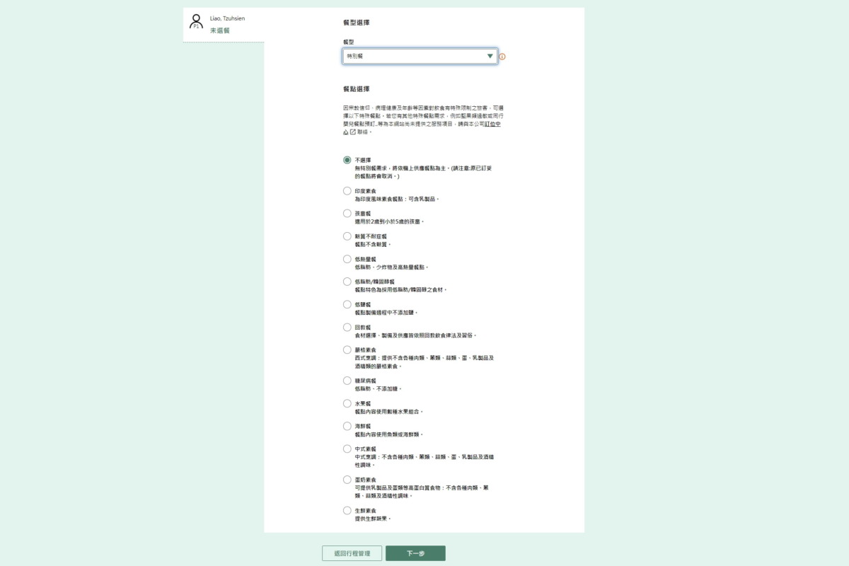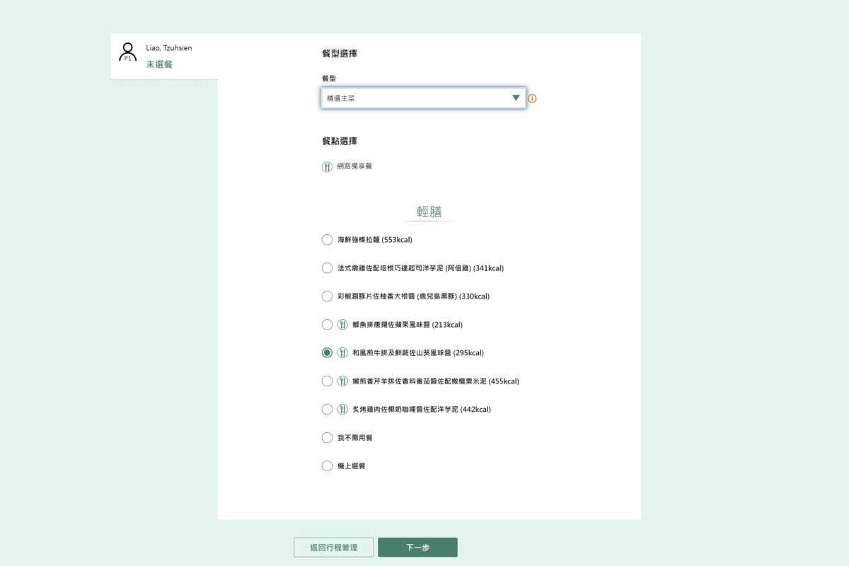 在網站上很快的完成升等手續後,接著選擇回程喜歡坐在能一覽富士山的機艙右側“K排”座位,而在餐點選擇的部分,特別推薦預先至網路選餐,因為此時菜單從既定的三種餐點,更新增四種僅網路預訂才能品嚐的主餐,特別是這次是第一次搭乘短程航班從日本返台,再加上僅日本航線才提供的獺祭純米大吟釀清酒,因此我選擇“和風煎牛排及鮮蔬佐山葵風味醬”為這次極日式的餐酒搭配體驗。