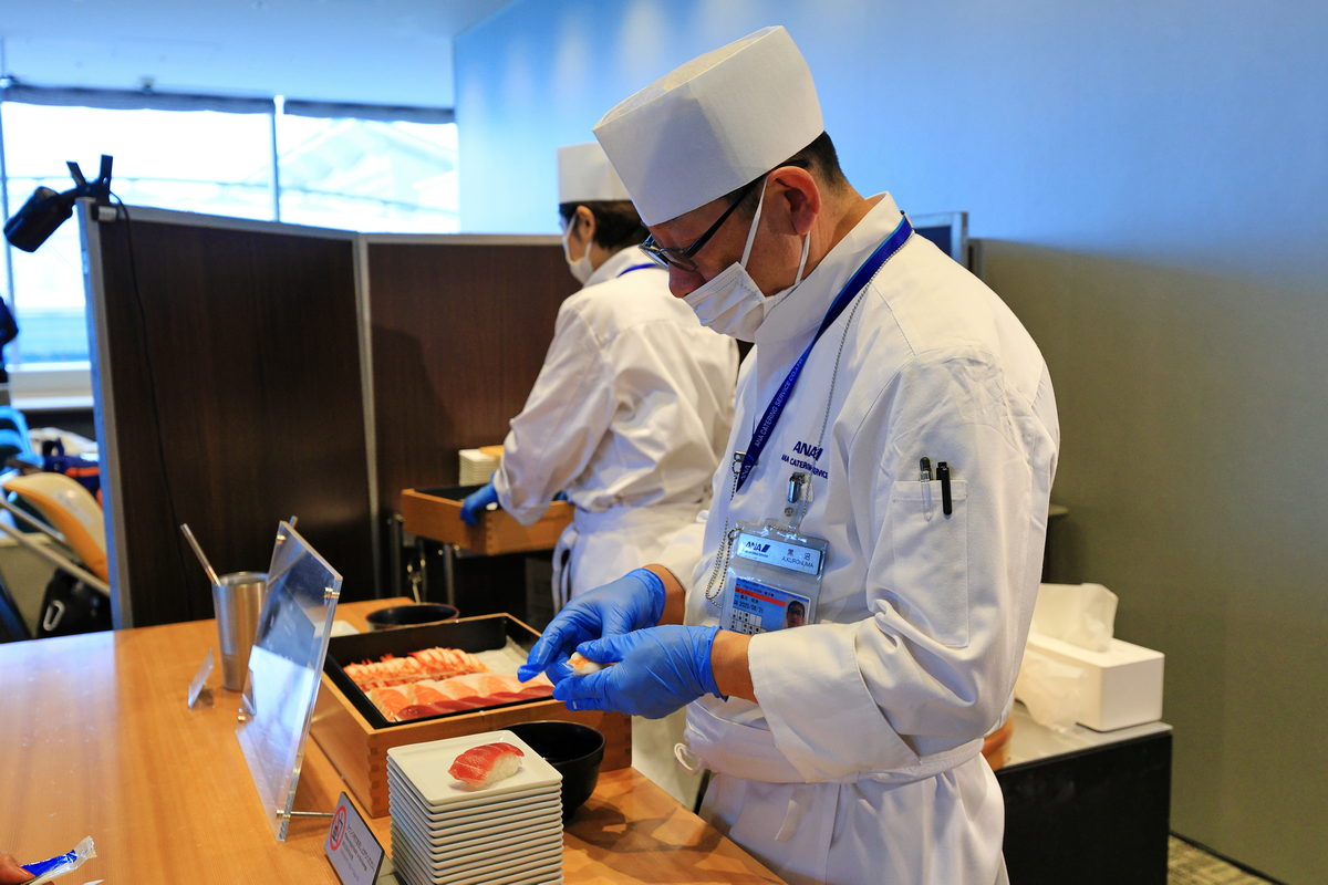 走進全日空貴賓室,果然是日系航空公司的主場,即便休憩空間相當寬敞,還是有著絡繹不絕的旅人在此休息等待登機,而在餐食的部分除了貴賓是常見的西式與日式餐點之外,最令我感到特別的是,貴賓室裡提供現場製作的鮪魚、甜蝦以及鮭魚三種樣式的握壽司,我想在此品嚐新鮮甜美握壽司,更是體驗日本貴賓室獨有的特別體驗呢!