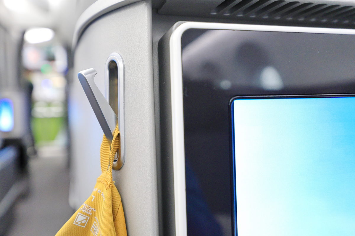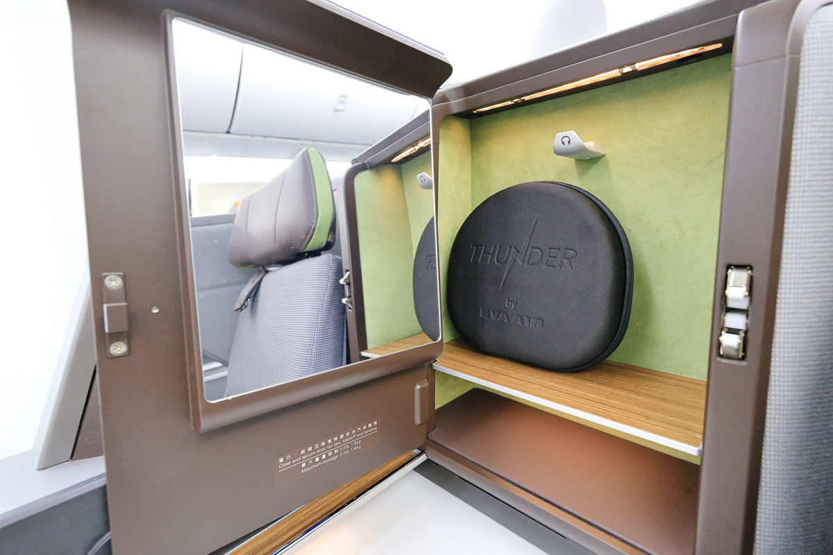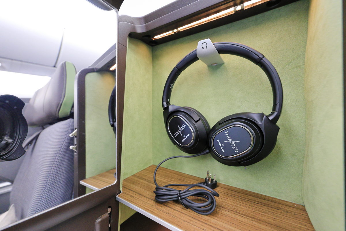 而在舒適配備上,首先最為醒目的即是前方椅背中的18吋超大觸控螢幕,其極靈敏的觸控手感以及銳利清晰的對比度,搭配著收納於置物空間的Thunder抗噪耳機,更是提供相當優異的娛樂系統品質,同時這副抗噪耳機在面對空服員進行交談時,提供一鍵解除抗噪的功能,不須拿下耳機即可交談的便利性呢!