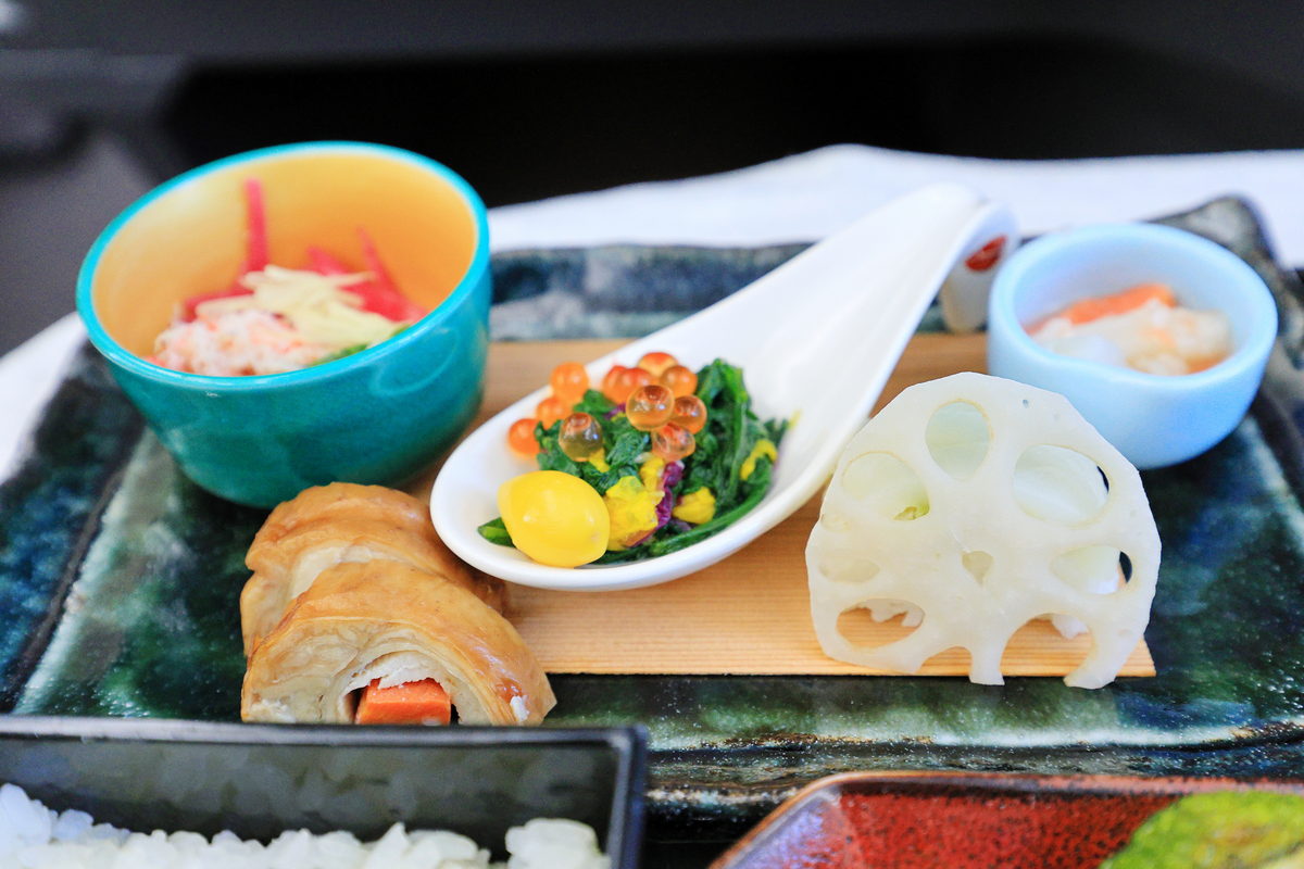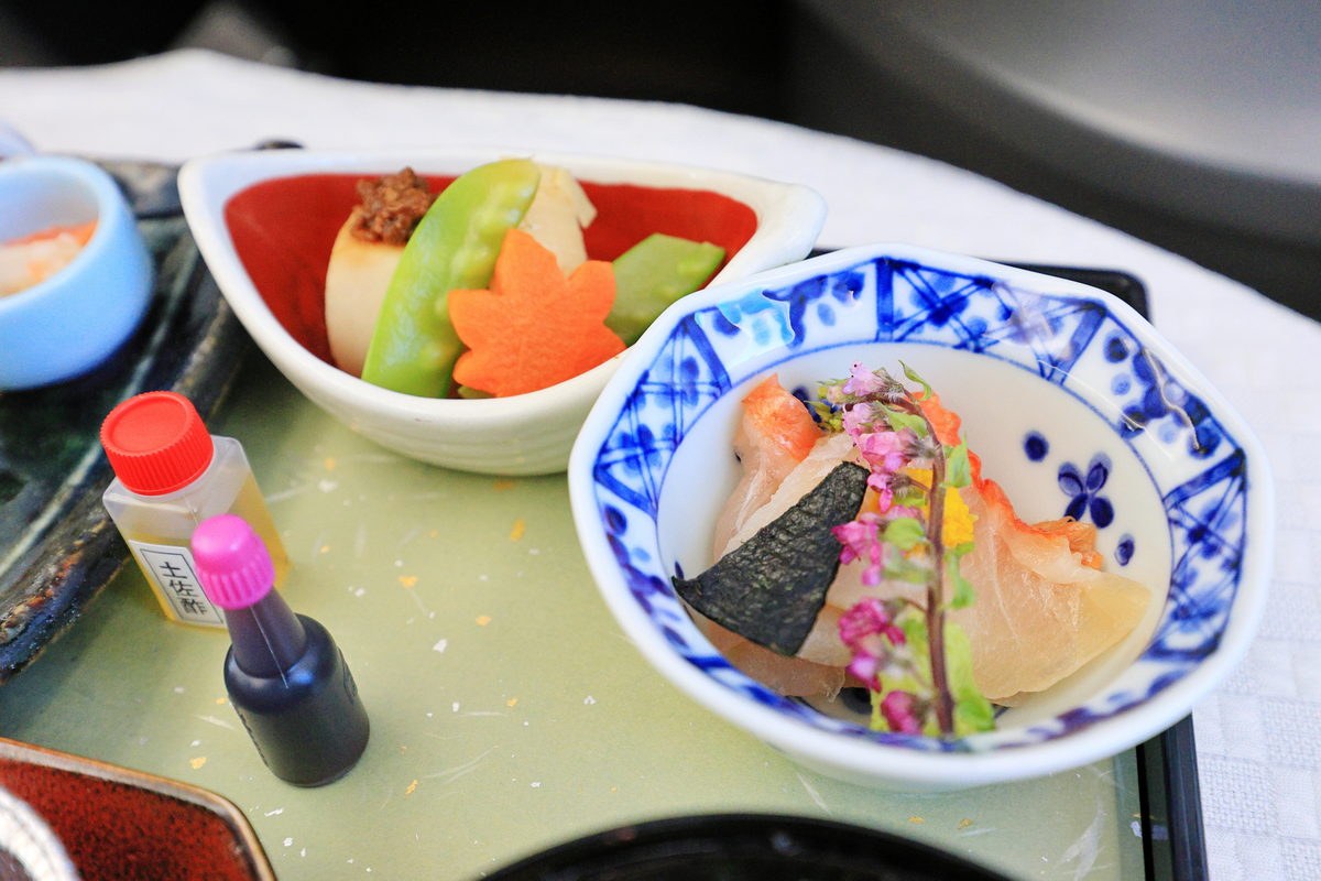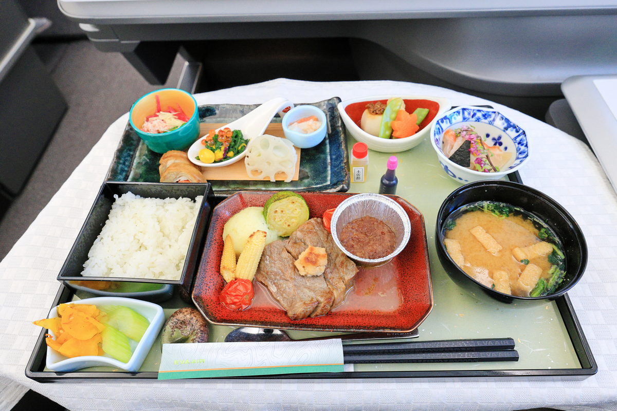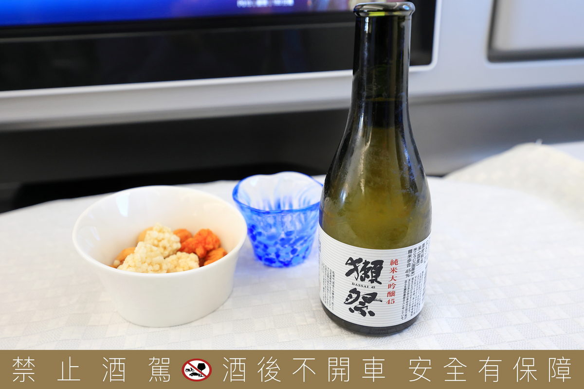 終於進入最為期待的用餐體驗,從進入機艙時迎賓飲料我選擇相當喜愛的王德傳阿里山金萱茶開始,進入巡航高度後,空服人員協助將適合在飛行過程中以平板電腦進行工作的大面積餐桌鋪設好桌布後,事先從網路預訂的“和風煎牛排及鮮蔬佐山葵風味醬”日式餐點隨即端上桌,而整個套餐的擺設猶如懷石料理風格的小缽配置組合,從鮮甜爽口的金目鯛生魚片、蟹肉黃瓜與鮭魚卵搭配雞肉卷的時蔬做為前菜開端,到軟嫩多汁牛排搭配著山葵特有清香卻不嗆辣的醬汁,這一系列味蕾不斷層層堆疊的體驗,已是過往搭機用餐時不能有過的美味享受,再加上軟Q的白飯與味噌湯,搭配著日本航班才供應的獺祭純米大吟釀清酒,這樣的享受更讓自己覺得這趟里程升等實在超值的舒爽呢!