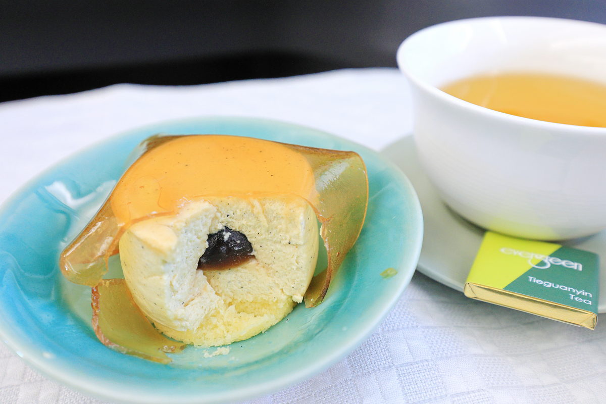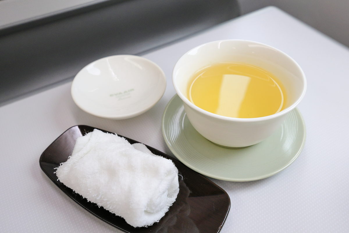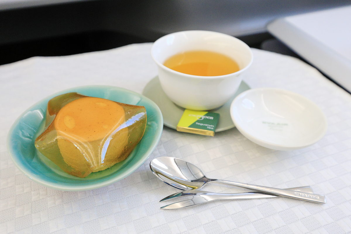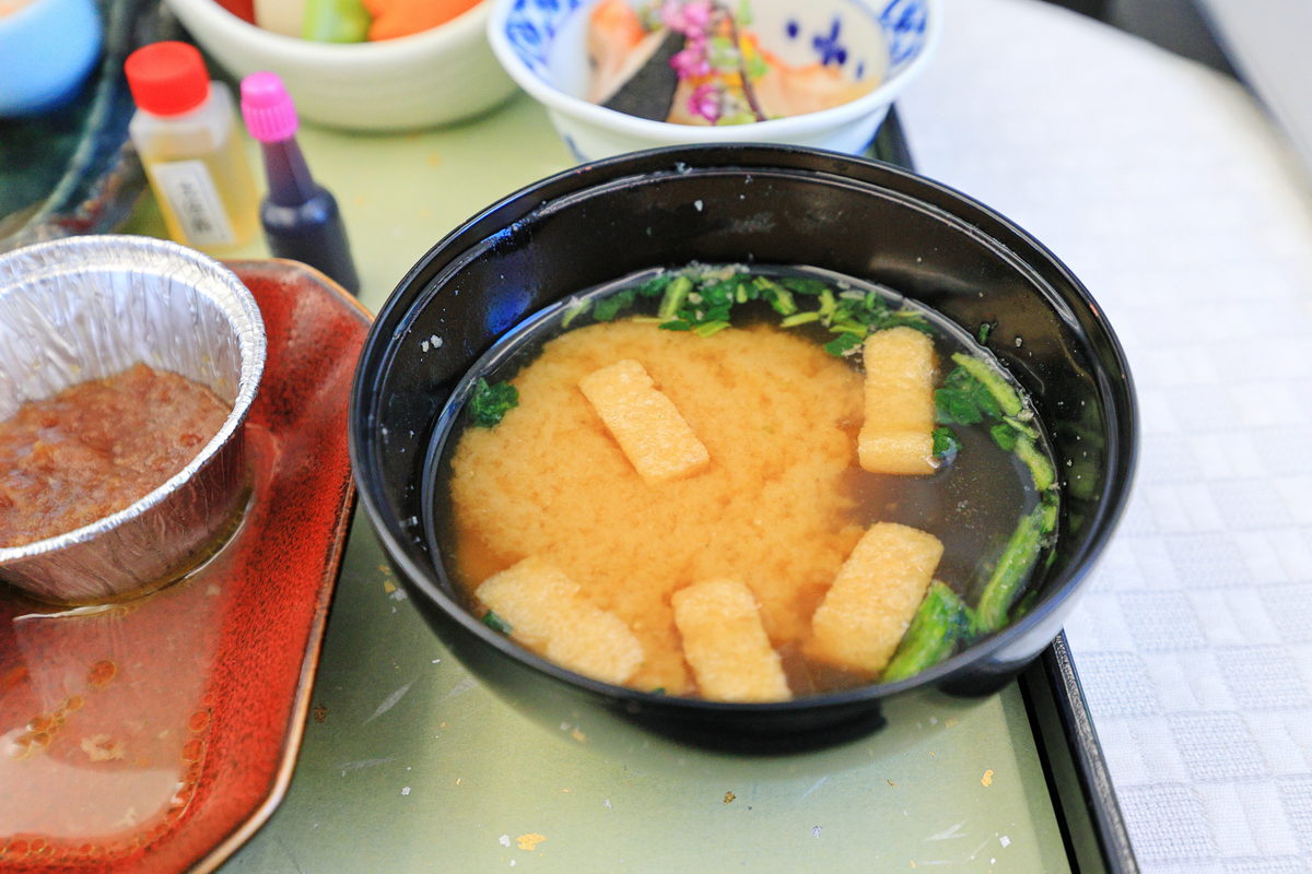 終於進入最為期待的用餐體驗,從進入機艙時迎賓飲料我選擇相當喜愛的王德傳阿里山金萱茶開始,進入巡航高度後,空服人員協助將適合在飛行過程中以平板電腦進行工作的大面積餐桌鋪設好桌布後,事先從網路預訂的“和風煎牛排及鮮蔬佐山葵風味醬”日式餐點隨即端上桌,而整個套餐的擺設猶如懷石料理風格的小缽配置組合,從鮮甜爽口的金目鯛生魚片、蟹肉黃瓜與鮭魚卵搭配雞肉卷的時蔬做為前菜開端,到軟嫩多汁牛排搭配著山葵特有清香卻不嗆辣的醬汁,這一系列味蕾不斷層層堆疊的體驗,已是過往搭機用餐時不能有過的美味享受,再加上軟Q的白飯與味噌湯,搭配著日本航班才供應的獺祭純米大吟釀清酒,這樣的享受更讓自己覺得這趟里程升等實在超值的舒爽呢!