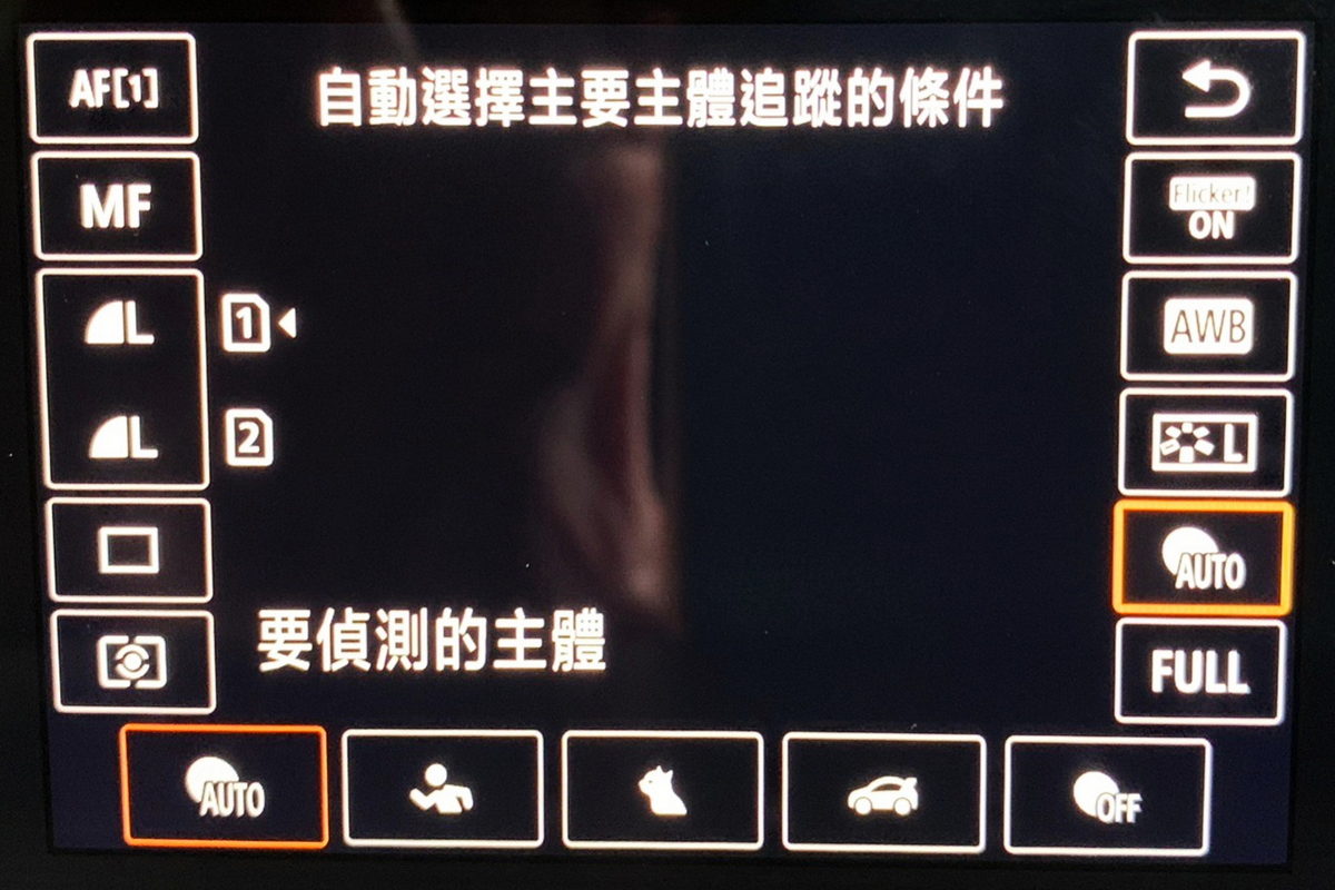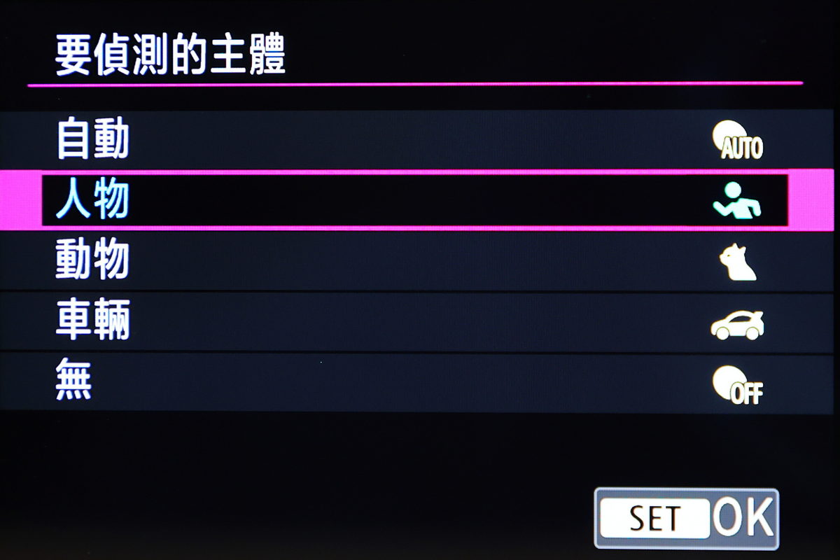 而開機後,螢幕的速控選單則是變的更為直覺好用,右下方直接能進行人物、動物、車輛對焦的偵測切換。