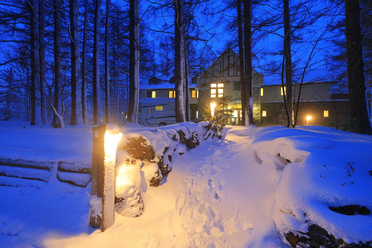 Blue Hour下點起燈火的民宿雪景,更是童話故事般的浪漫。