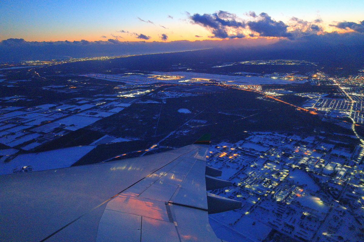 此外在微光的夜裡搭配光圈不大的KIT鏡RF24-105mm F4-7.1 IS STM,更能放膽的拉高ISO吧,從ISO 4000下嶄露水之教堂在夜裡的靜謐層次的同時,保有純淨能一窺教堂內遊客的神情之外,甚至是離開北海道時,在飛機上將ISO拉高到10000俯瞰傍晚的北海道城市夜景,亦能嶄露微光下相當純淨的相片品質,進而享受輕巧袖珍的KIT在飛機狹小的櫥窗中,帶給我輕鬆拍攝機翼與城市燈火的最佳構圖。