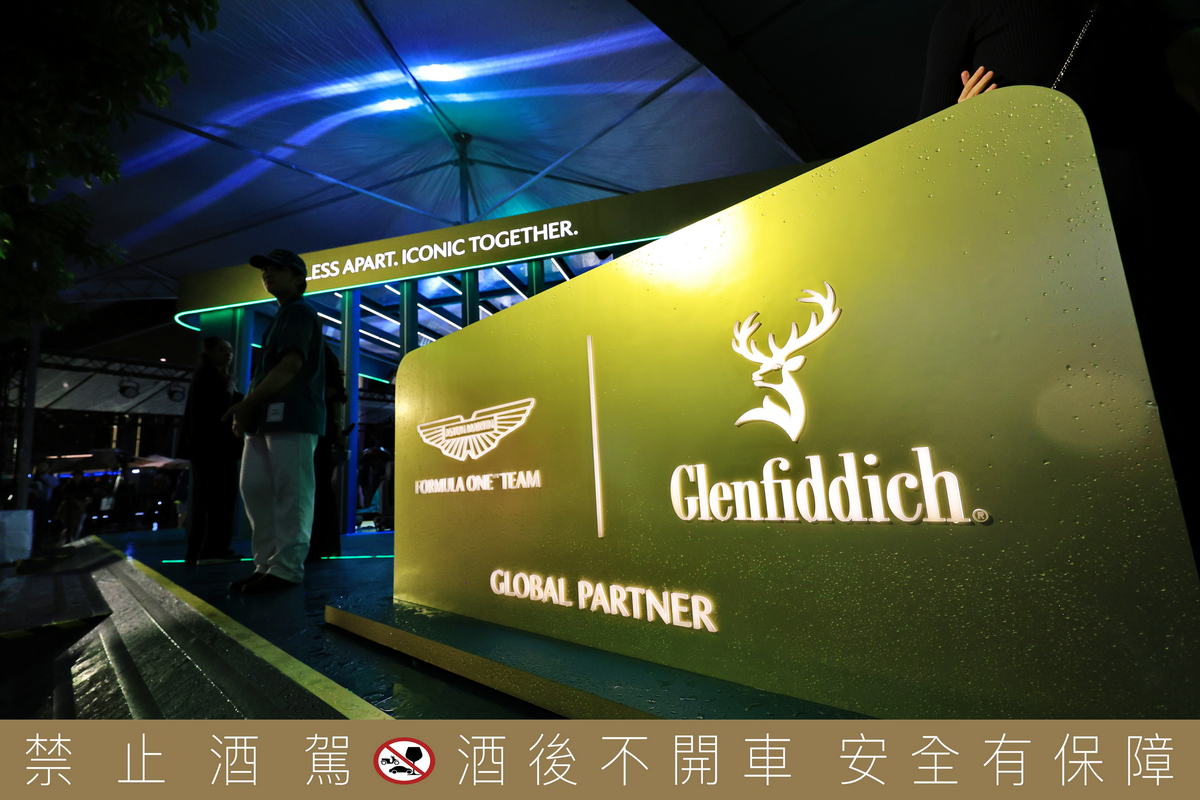 抵達會場後,隨著像是勾勒著金邊的格蘭菲迪與Aston Martin Formula One® Team引領著報到處,此時期待欣賞的1:1 Aston Martin Formula One® Team Replica Car正在經典英倫賽車綠的車幕下靜靜地等著活動正式開啟序幕的到來,而這樣以英倫賽車綠搭配著燈光照耀下的金色基底,更是充滿時尚迷幻的質感展現,搭配著這場時而滂沱時而迷濛的雨天氣候,一切真的太有昔日在英國旅行的雨夜氛圍了,讓我好期待活動趕快開始呢!