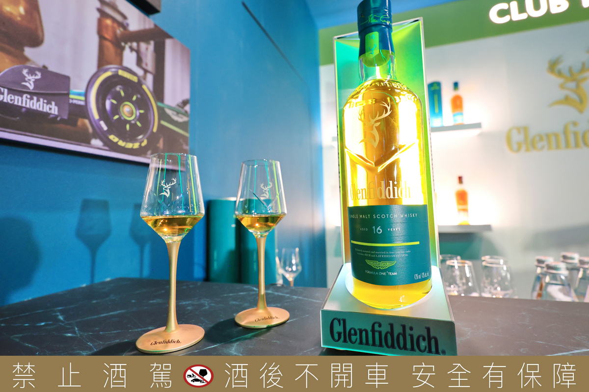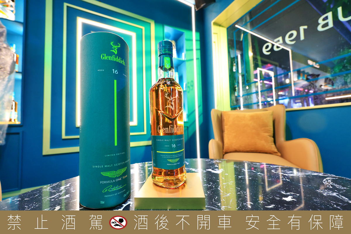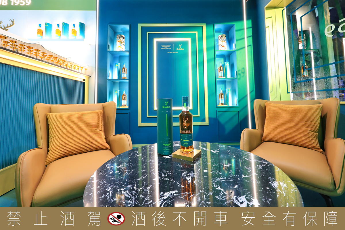 格蘭菲迪16年單一麥芽蘇格蘭威士忌ASTON MARTIN FORMULA ONE® TEAM聯名款在此作為空間裝飾的一環,更富沉浸式的品味質感。