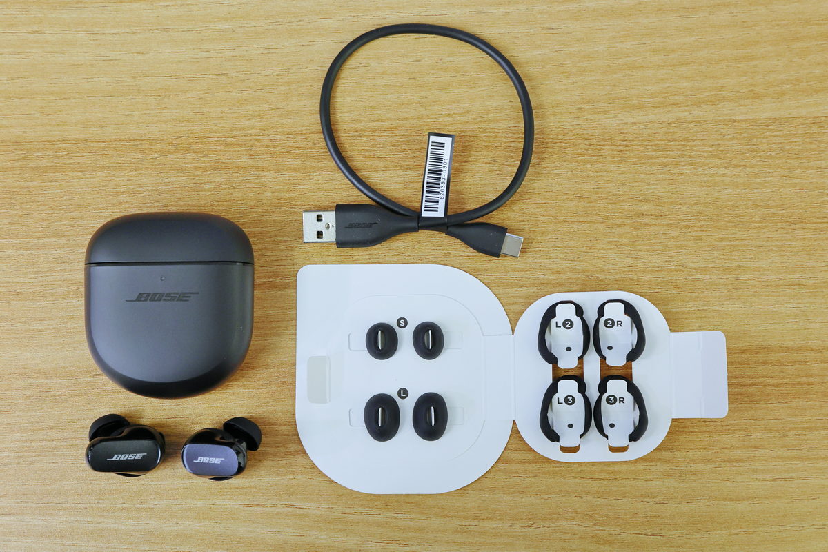 拿到全新的Bose QuietComfort Earbuds II消噪耳塞(以下簡稱Bose消噪耳塞)後,與第一代的消噪耳塞一同相比,不僅耳機本體縮小近1/3、就連充電盒也變得更易於一手掌握的袖珍,同時也比過往輕盈許多,同時包裝內附的S、L號傘型耳套與穩固環配件,以及包含耳機本體上預先裝上的M號尺寸,若針對每個使用者天生左右耳道的些微不同,進而調整專屬於左右耳道最為舒適服貼的尺寸時,其傘型耳套與穩固環與耳機本體更可達驚人的91種組合模式。