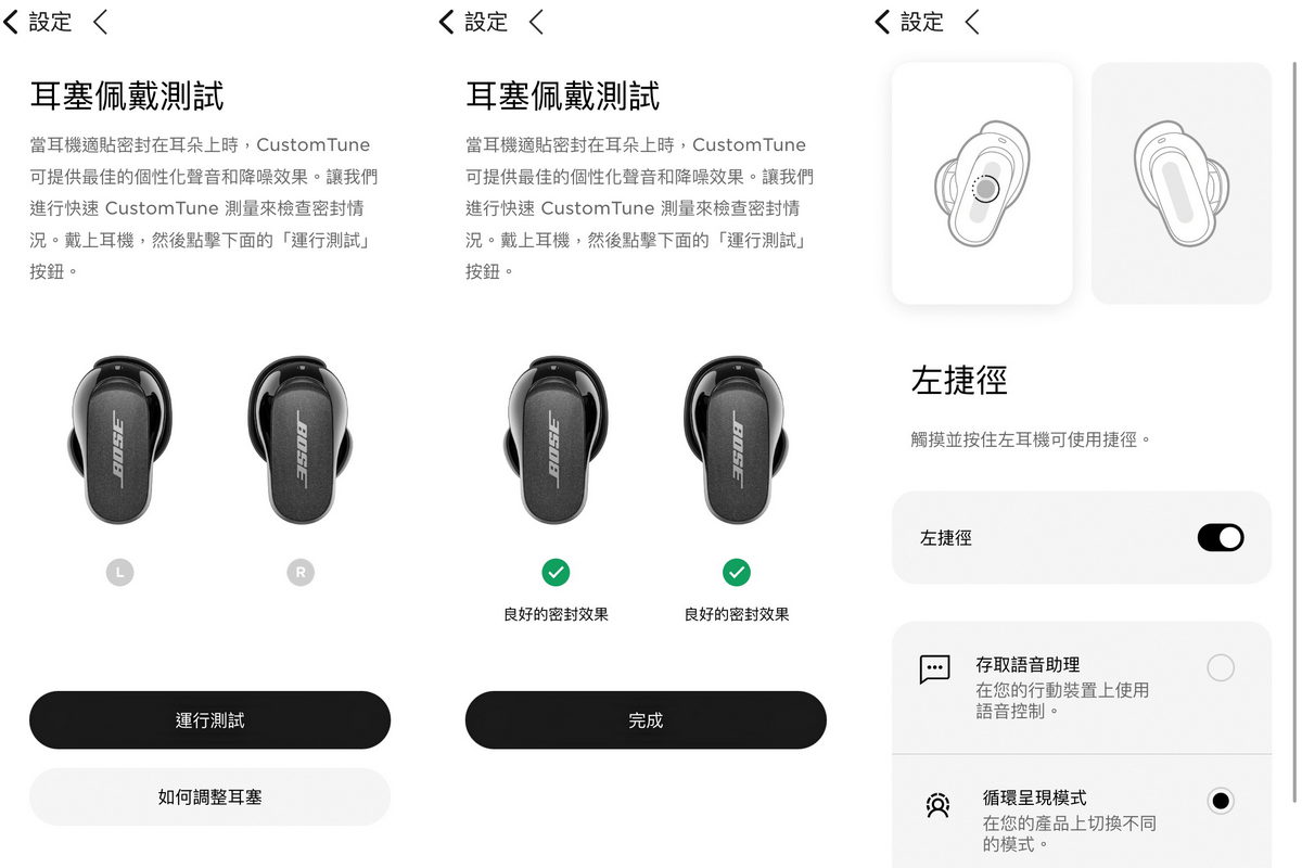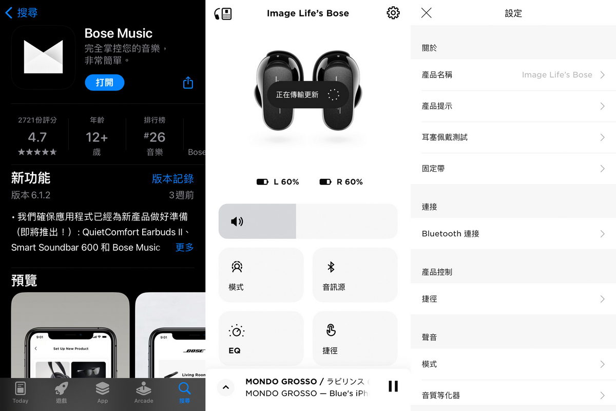 將Bose消噪耳塞充電盒充滿電後,隨即與手機預先下載好的“Bose Music”App進行配對註冊,透過藍牙連線與APP的配對指引說明,即可輕鬆完成連線。當連線配對完畢後,APP隨即開始為Bose消噪耳塞進行最新版的韌體更新,同時可於這段時間內進行左右耳的佩戴測試,讓Bose消噪耳塞得以針對左右耳的配戴回饋進而有著最完美的消噪功能,在耳機操作使用的功能中,更可針對左右耳分別設定接聽電話、音量大小甚至是消噪模式等不同操作設定。