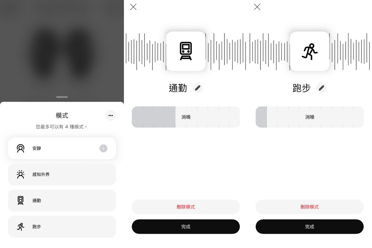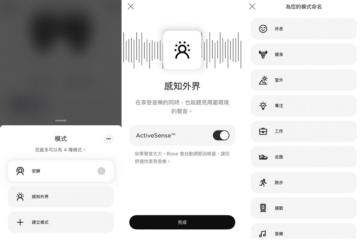 特別是在消噪模式中,除了預設模式中包含完全消噪的安靜模式之外,以及能將外界白噪音消弭同時讓配戴者也能感知外界環境氛圍的ActiveSense功能之外,還能針對不同的使用模式,進行額外2組模式註冊並微調耳機消噪強度,像是戶外運動時,我需要在享受音樂帶給我向前邁進之熱血動力的同時,保有些許外界交通、環境的聲音回饋,確保運動時的安全,此時就能將有著完全消噪的10級強度,降低為1-2級的消噪強度,各種模式皆可依照自己的使用需求隨時調整所需的消噪強度。