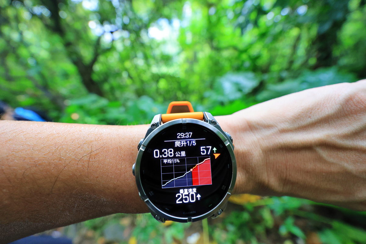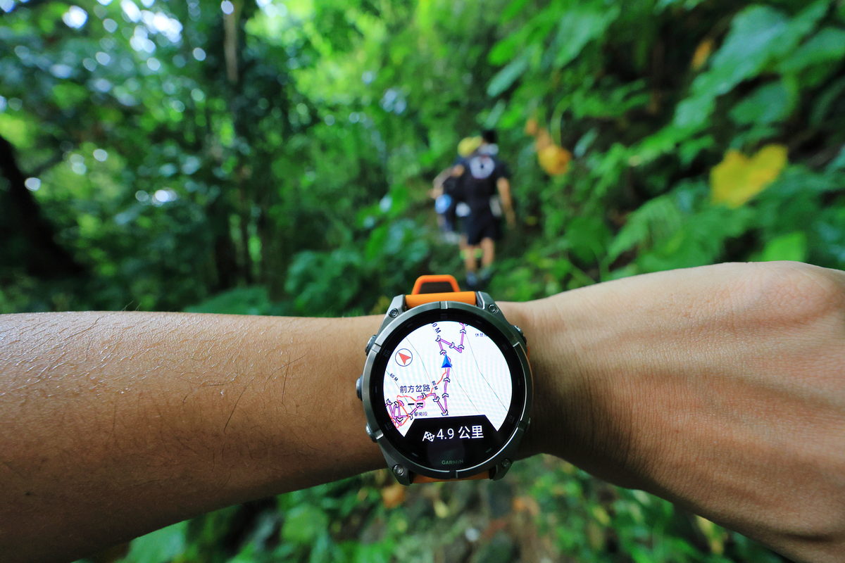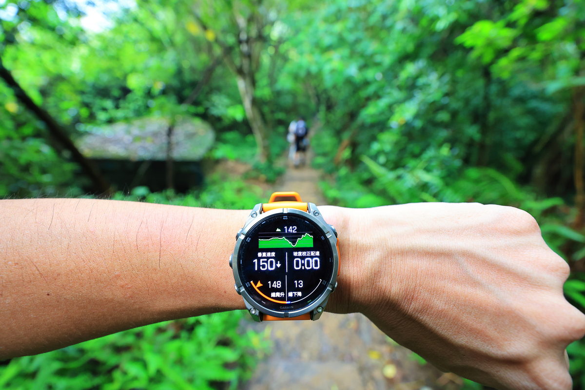 接著,FĒNIX 8開始響鈴震動提示,原來我們準備進入一段難度不低的攀繩段,由於這天碰巧為大雨過後的傍晚,濕漉漉的土石路面以及台北盆地裡山林特有的悶熱,讓除了讓攀繩增添挑戰性之外,同時也讓心率逐漸攀升至Zone 3有氧運動區間,而在爬山時,除了氣喘吁吁之外,最常伴隨著到底還要爬多久的負面想法,透過錶面的爬坡規劃器,除了能一目了然自己當下於全段路程中是屬於上升或下降路段之外,同時還能依照單一區段,直接了解還需要攀爬或下降多少距離,讓爬山不再是想像中的“快到了”口號,而是可以隨著資訊頁面下,仔細調配自己的腳程節奏與體力,讓這段運動變得更有效率。