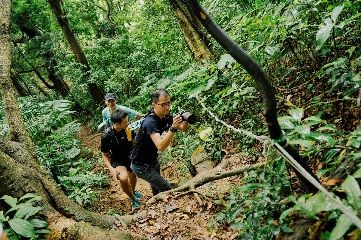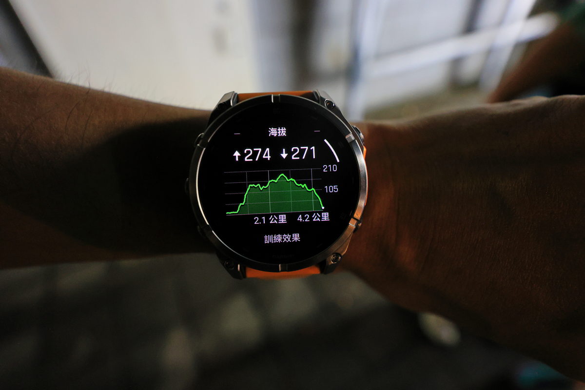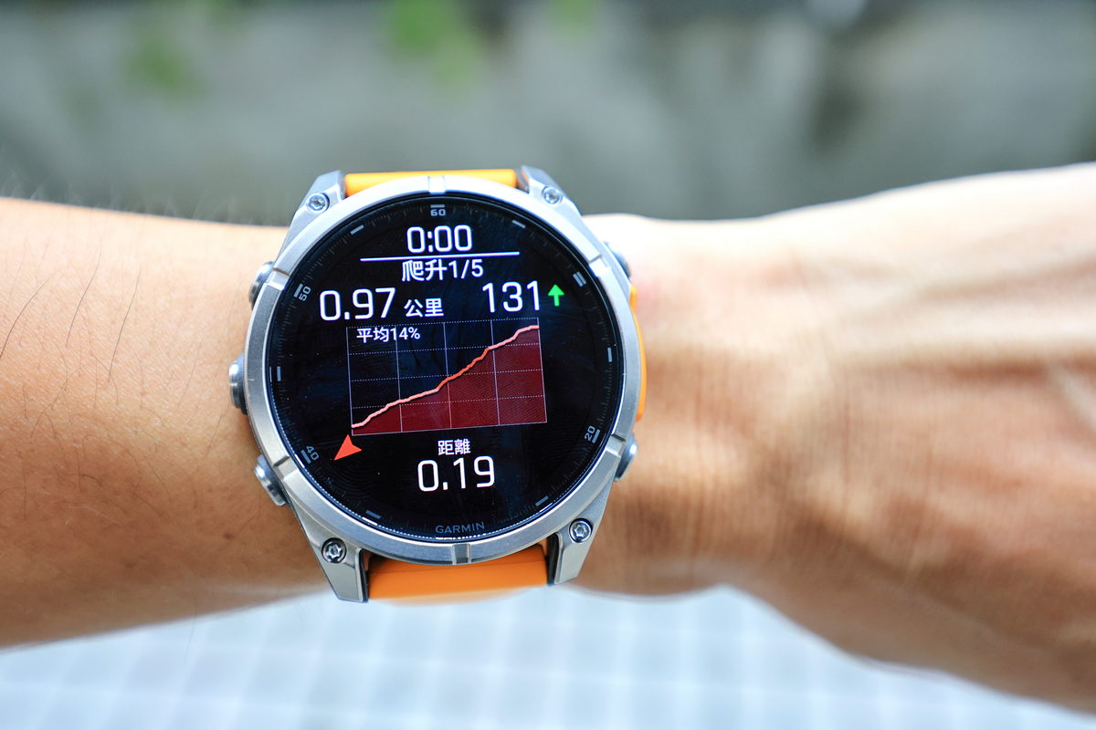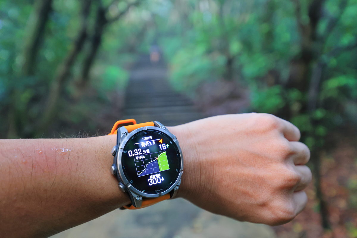 接著,FĒNIX 8開始響鈴震動提示,原來我們準備進入一段難度不低的攀繩段,由於這天碰巧為大雨過後的傍晚,濕漉漉的土石路面以及台北盆地裡山林特有的悶熱,讓除了讓攀繩增添挑戰性之外,同時也讓心率逐漸攀升至Zone 3有氧運動區間,而在爬山時,除了氣喘吁吁之外,最常伴隨著到底還要爬多久的負面想法,透過錶面的爬坡規劃器,除了能一目了然自己當下於全段路程中是屬於上升或下降路段之外,同時還能依照單一區段,直接了解還需要攀爬或下降多少距離,讓爬山不再是想像中的“快到了”口號,而是可以隨著資訊頁面下,仔細調配自己的腳程節奏與體力,讓這段運動變得更有效率。