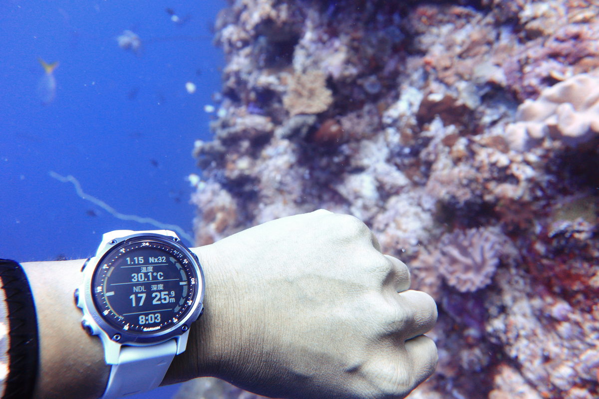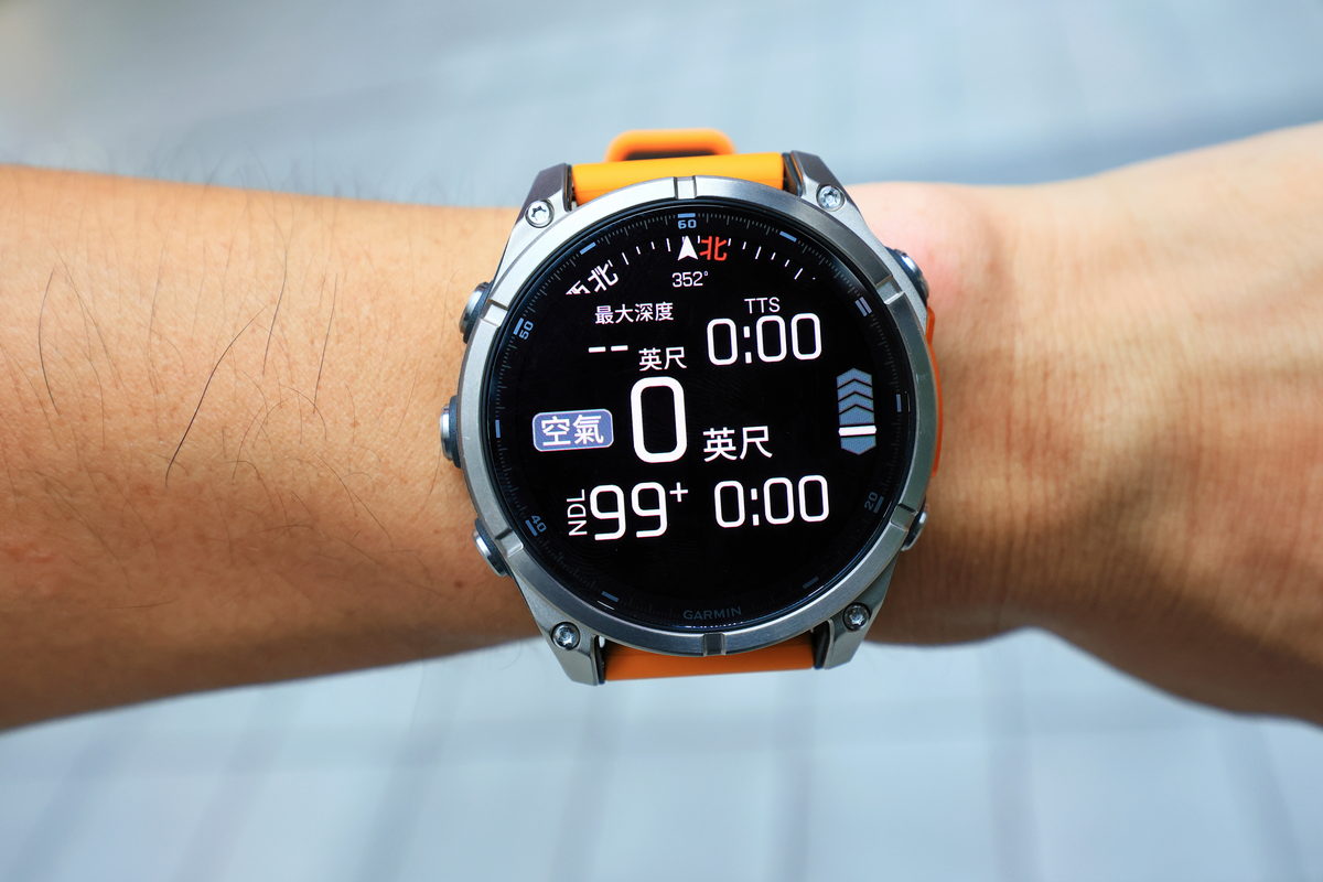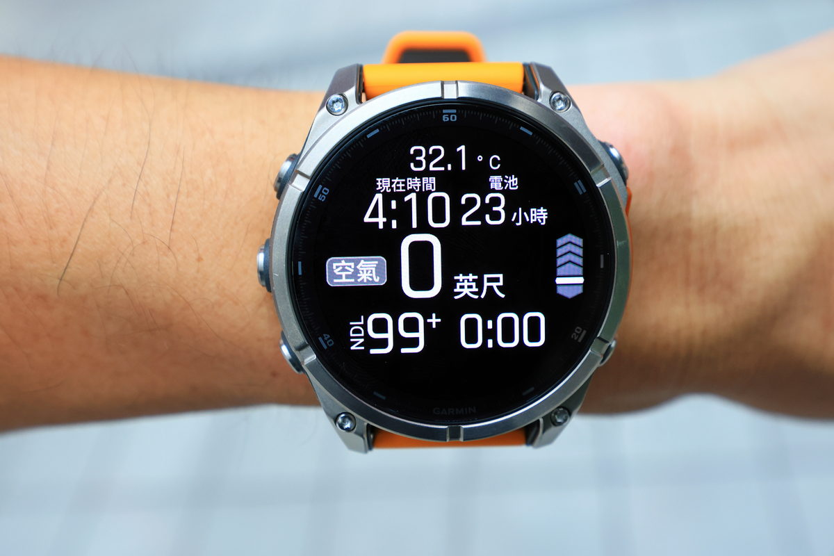 雖然這次沒能以水肺潛水感受FĒNIX 8的休閒潛水模式,但還是好奇的打開APP感受其介面與手中的Descent MK3i有何差異?而在常用的水肺潛水之單一氣體模式中,對比MK3i多達3頁的豐富資訊頁面,FĒNIX 8則是將其濃縮成2頁的上下顯示選單,同時將潛水時常需要注意的深度、免減壓時間(NDL)、羅盤方位、潛水時間等重要資訊以相當醒目的大字做為標示,卻同時巧妙的整合於單一頁面之中,如此一來在水下更能直覺迅速判讀數據,更是輕鬆又安全呢!