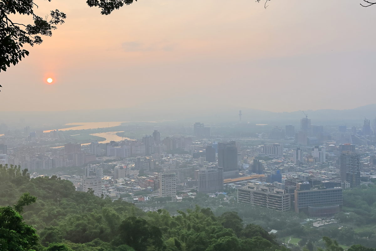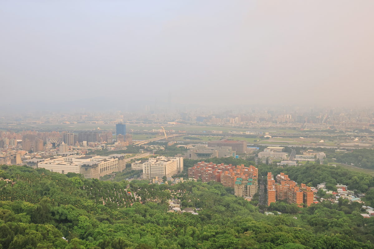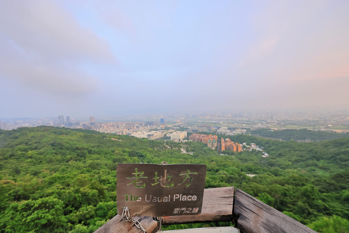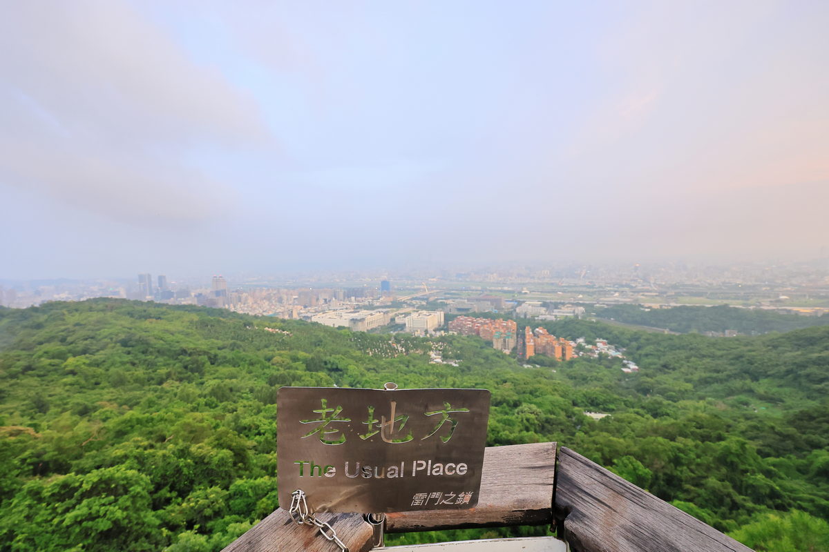 經過1.5小時的健行,終於抵達此行終點,海拔約187m的“老地方觀機平台”,雖然這天能見度稍差,但卻反而將晚霞以更為柔美的色調嶄露開來,此時眼前的翠綠劍潭山、遠方的大直橋與松山機場所交織而成的景緻,好像一幅油畫一般的柔和舒暢。