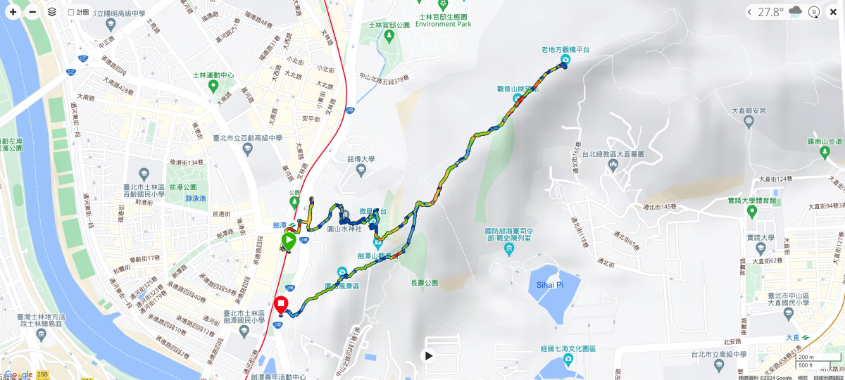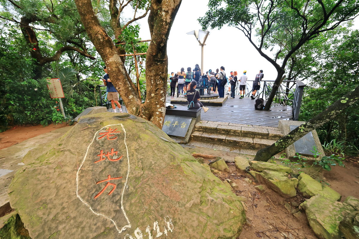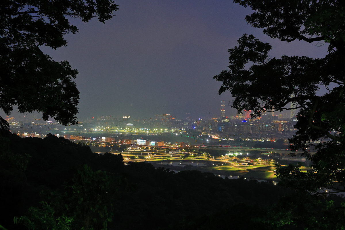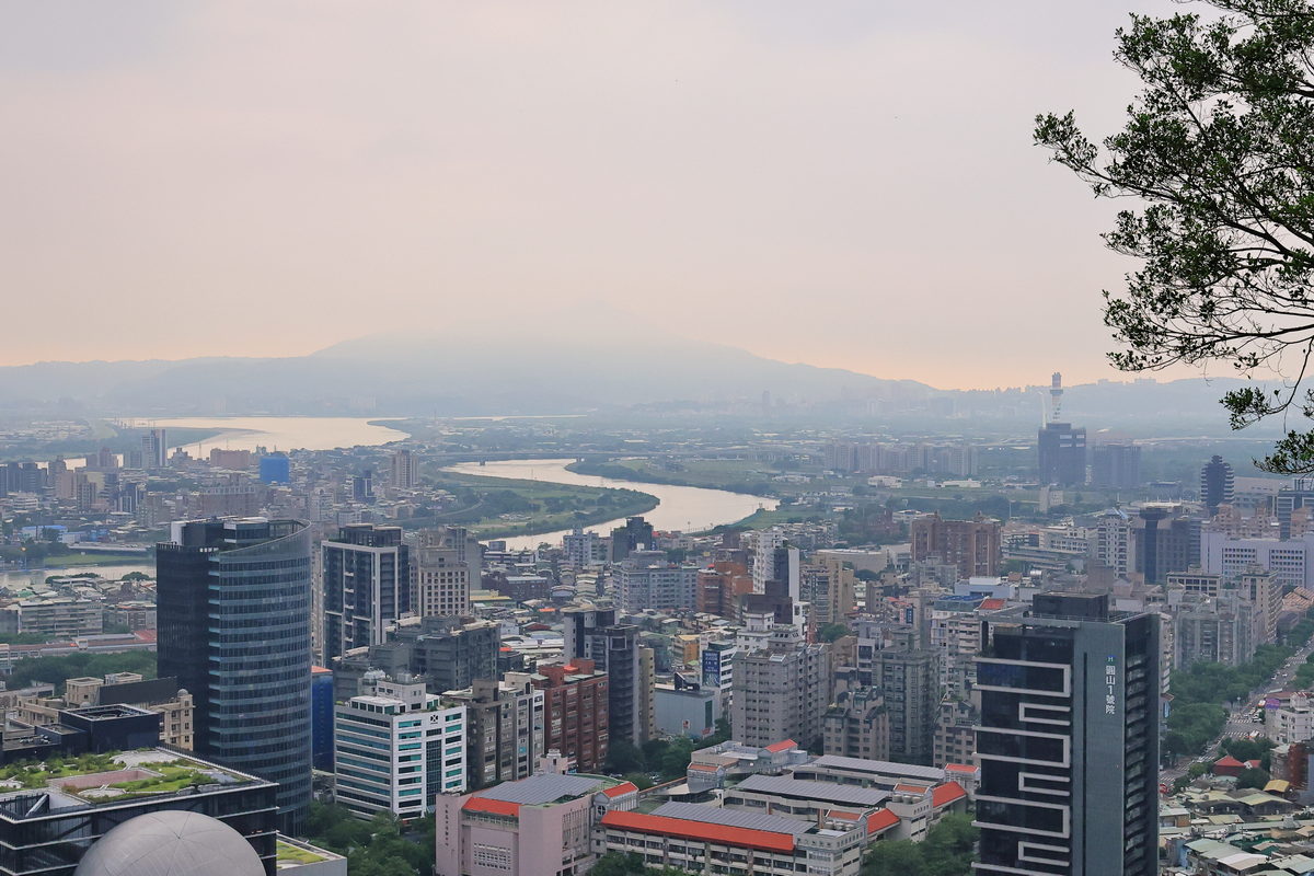 經過1.5小時的健行,終於抵達此行終點,海拔約187m的“老地方觀機平台”,雖然這天能見度稍差,但卻反而將晚霞以更為柔美的色調嶄露開來,此時眼前的翠綠劍潭山、遠方的大直橋與松山機場所交織而成的景緻,好像一幅油畫一般的柔和舒暢。