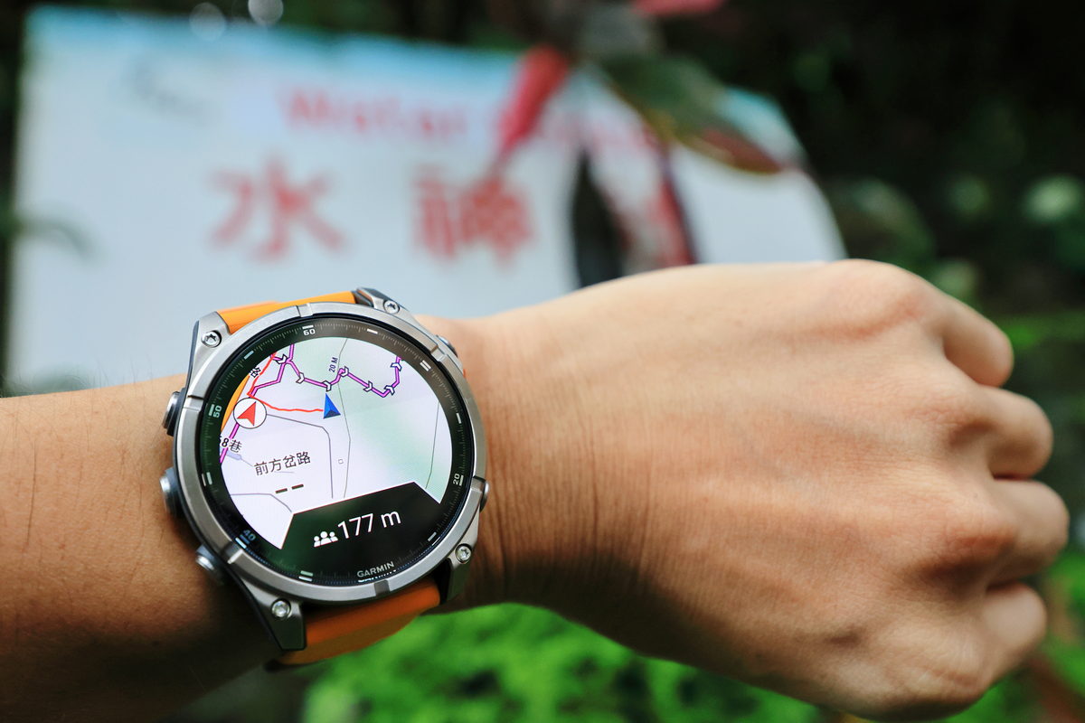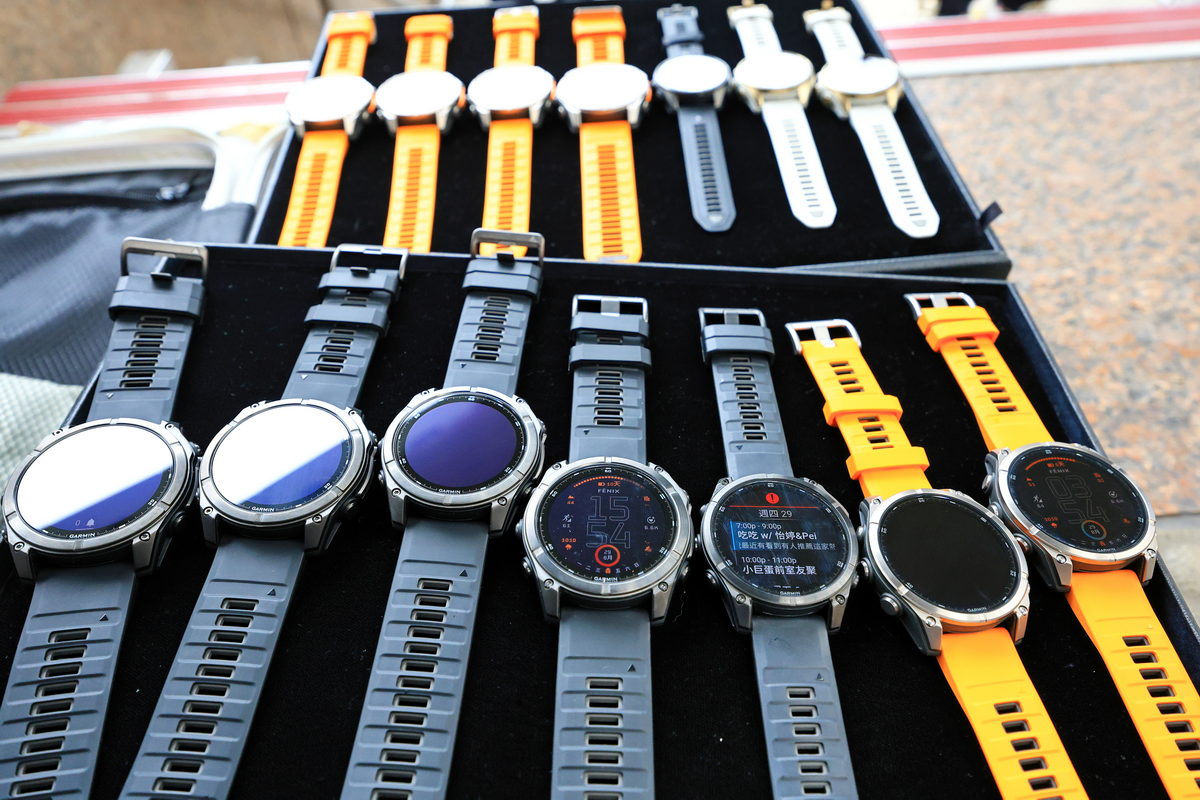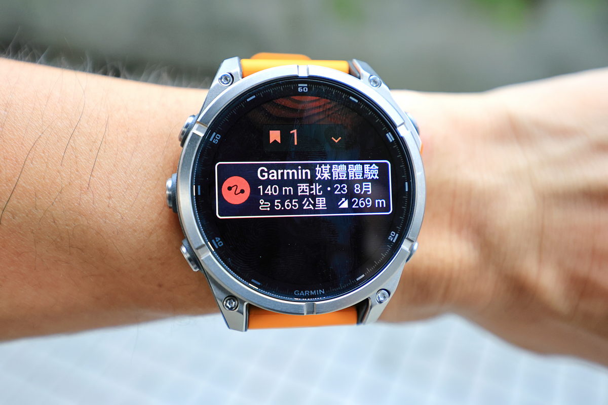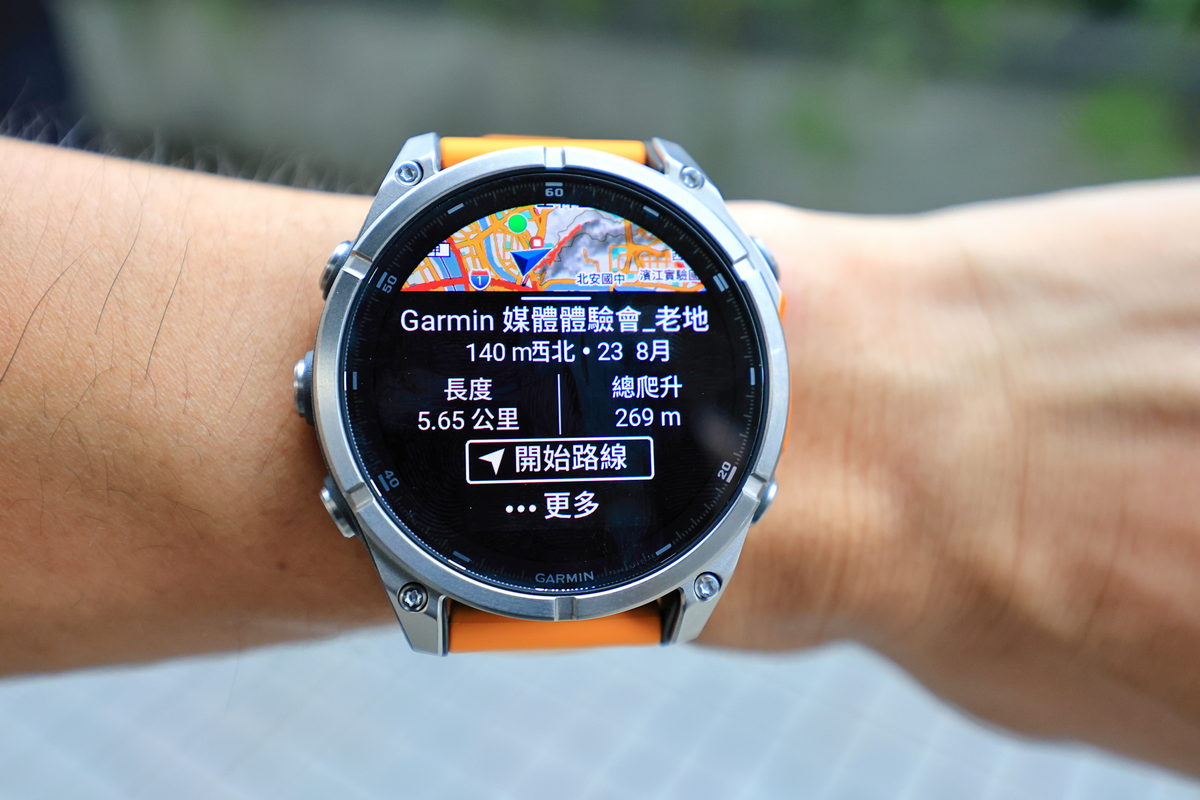 到了接近傍晚時分,抵達捷運劍潭站2號出口與大家會合後,首先Garmin的夥伴隨即拿出43mm、47mm、51mm各種錶徑尺寸的FĒNIX 8,讓此行與會的旅伴們能依照自己的手腕身形,挑選適合自己配戴比例的尺寸,因此我選擇完整服貼自己手腕的47mm,做為此行體驗的佩戴選擇。同時在這此體驗全新上市的FĒNIX 8中,而手中這只有著相當亮眼鮮明的火花橙錶帶,與質感相當洗鍊的DLC鈦錶圈一同搭配下,不僅能在運動過程中有著極具個性化的視覺感受之外,同時對上班時間需要參加各種會議與活動的我來說,搭配正裝也相當有自己的鮮明品味。此外FĒNIX 8除了依照各種錶徑尺寸所涵蓋香頌灰、獵影黑、火花橙三種矽膠錶帶配色之外,也能依照自己的喜好,透過Quickfit錶帶多元繽紛的各式錶帶,隨著自己的心情與場合,一鍵快速更換適合的錶帶,相當便利快意。