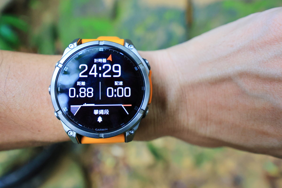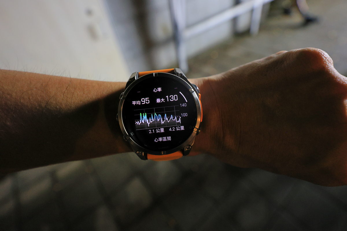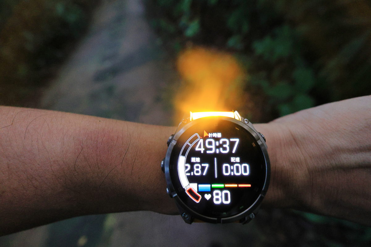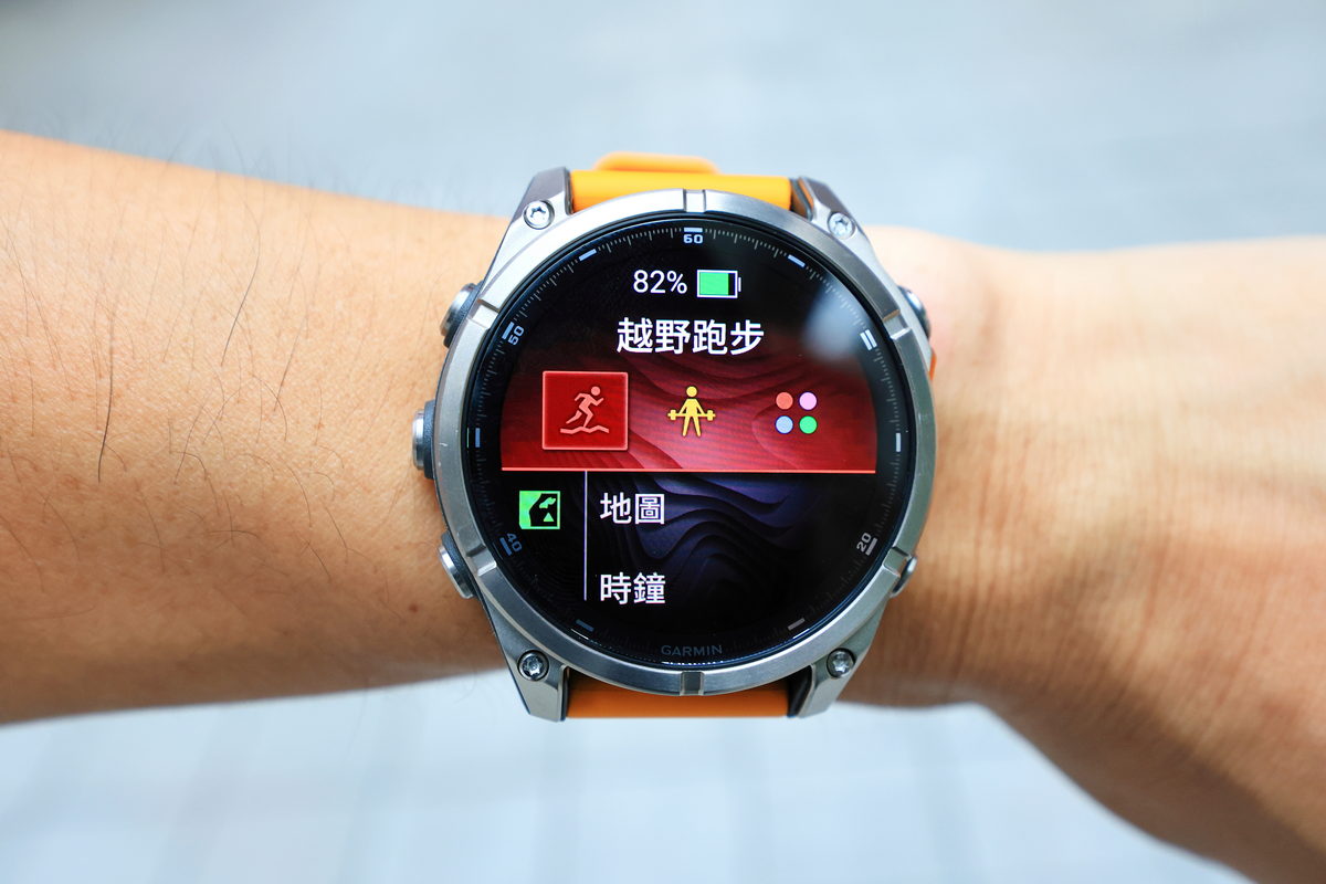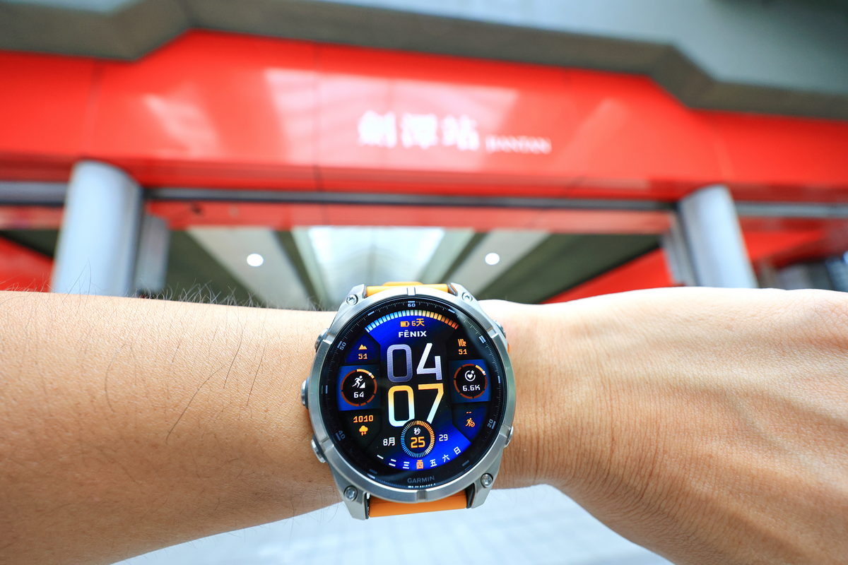 將FĒNIX 8戴在手上後,除了鮮明的錶帶配色之外,這次體驗的錶款更是首次搭載AMOLED螢幕的版本,因此錶面不僅呈現更繽紛絢麗的飽和度與對比度之外,同時FĒNIX系列向來強調錶有著有多元資訊顯示的性能,也因AMOLED螢幕的加持下,無論主要資訊的大字,或是輔助資訊的小字,皆有著清晰細緻的顯示呈現,這對於隨著年齡增長,視力逐漸老化的我來說,更是相當舒服辨識的暢快感受。