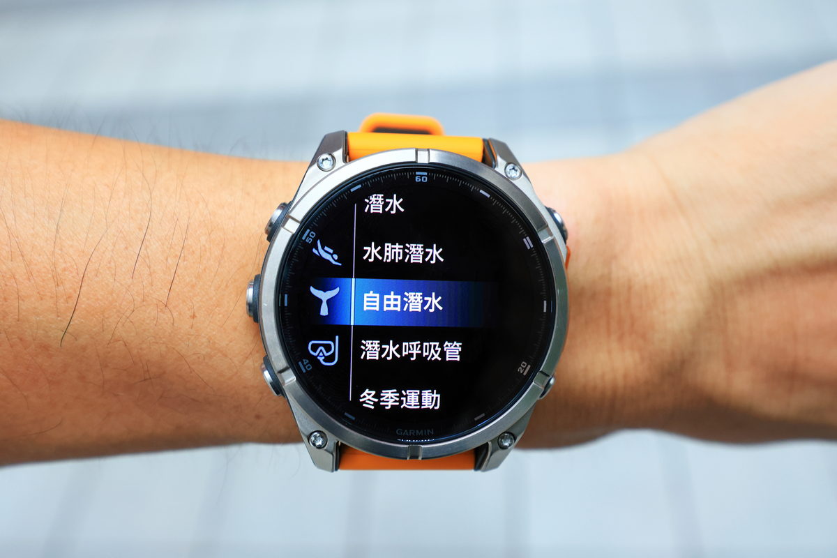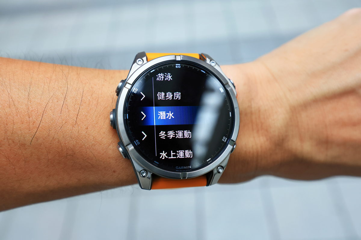 接著按下錶盤右上角的Start/Stop按鍵,檢視FĒNIX 8各項運動APP的顯示畫面,除了接下來準備以越野跑步模式來體驗全新錶款之外,在運動APP中更承襲過往陸上運動、水面運動甚至是健身房肌力訓練超過百項的豐富運動APP可輔助運動時所需的各項資訊,而且FĒNIX 8更是針對喜歡潛水運動的我,首次搭載符合休閒潛水規範中,最大深度40m的休閒潛水模式。