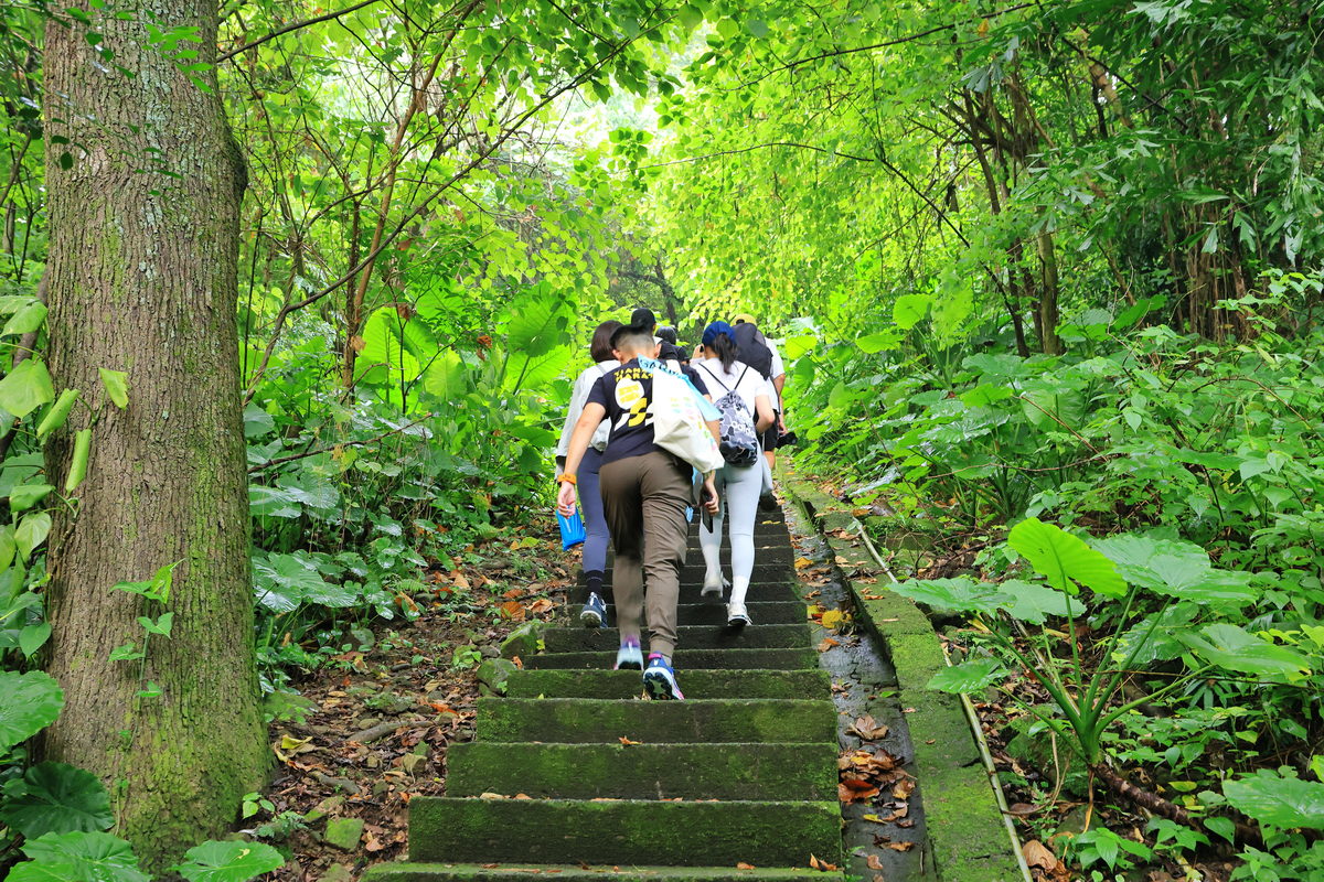 大約走了1.2k,我們抵達了第一個休息點“微風平台”,在平台欣賞著眼前醒目的台北表演藝術中心為前景,一覽由基隆河、淡水河這兩條流域所交匯沖積而成的社子島地形,同時遠方因雨霧而若隱若現的觀音山,更是不曾見過的獨特台北景致呢!