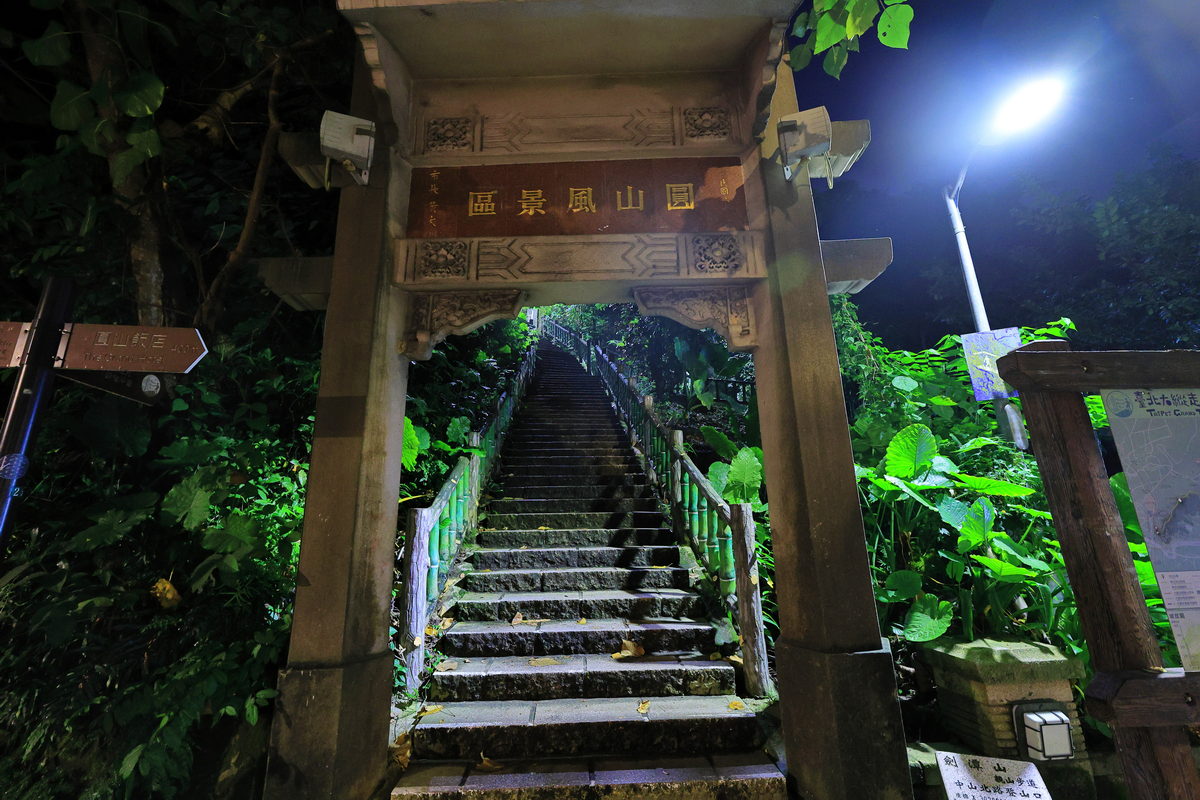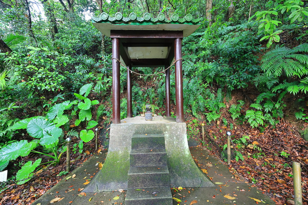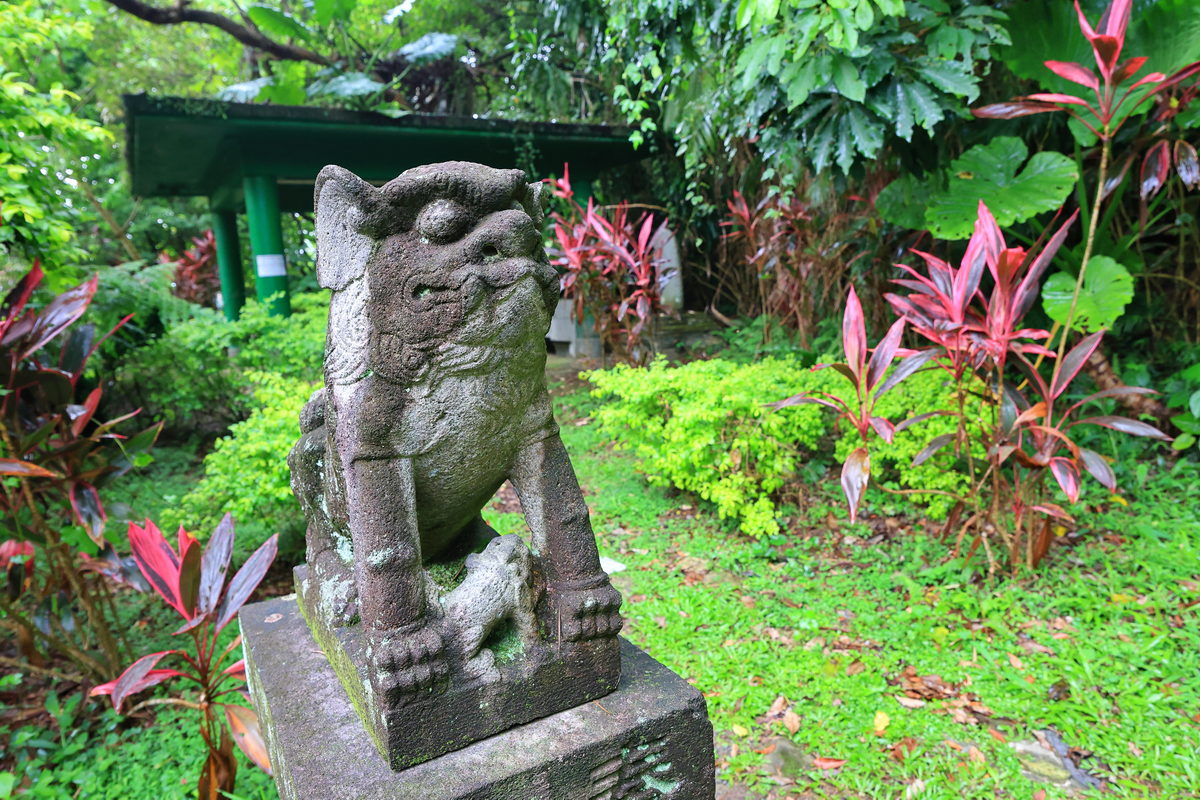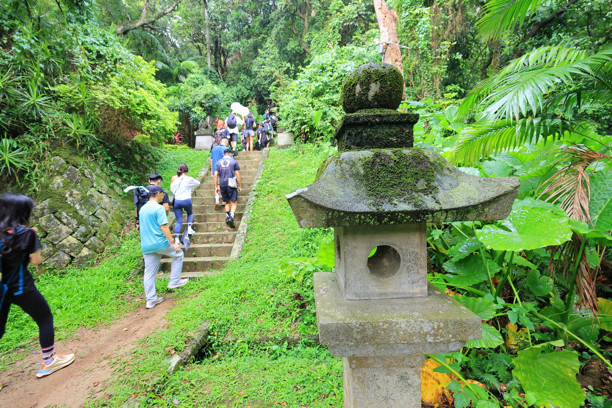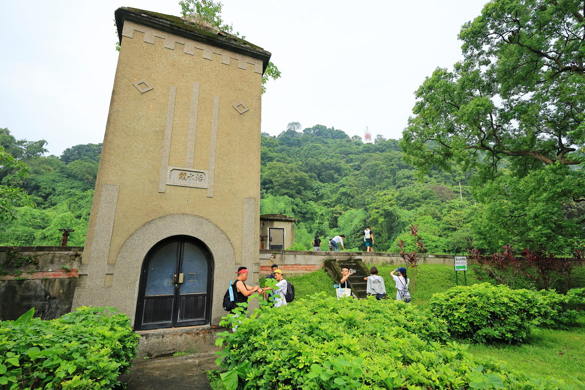 於是隨著地圖指引,找到進入劍潭山的登山口後,我們開始向上攀登前往圓山水神社邁進,大約走了800m,穿過有著活水頭字樣建築的台北最早儲水池遺跡,隨即可見在日本神社中常見的狛犬,而此處即是日治時代所留存迄今的圓山水神社,此時透過儲水池與昔日祭祀水神的神社,更能感受日治時代台北地區自來水系統建置並逐漸發展為迄今台灣自來水事業的歷程。