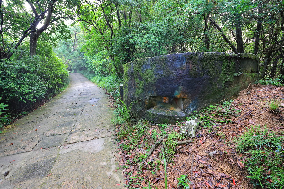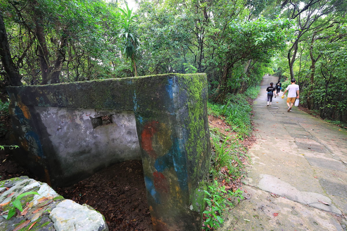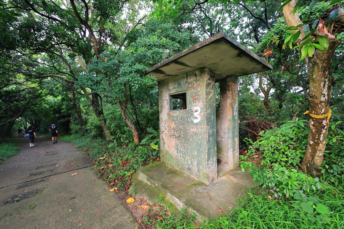在微風平台欣賞風景,同時讓自己的心率回復以及消除穿梭雨後林間的悶熱感後,接著,我們繼續朝向老地方觀機平台邁進,對比一開始較為陡上攀升的路程,這一段更是相當平緩好走,同時寬敞的步道,不僅通風涼爽許多,沿途不時有著昔日軍事哨所的遺跡,而且在準備入夜前的黃昏時刻,還能在“觀音山眺望點”欣賞不同角度的社子島河岸、觀音山日落夕照之美。