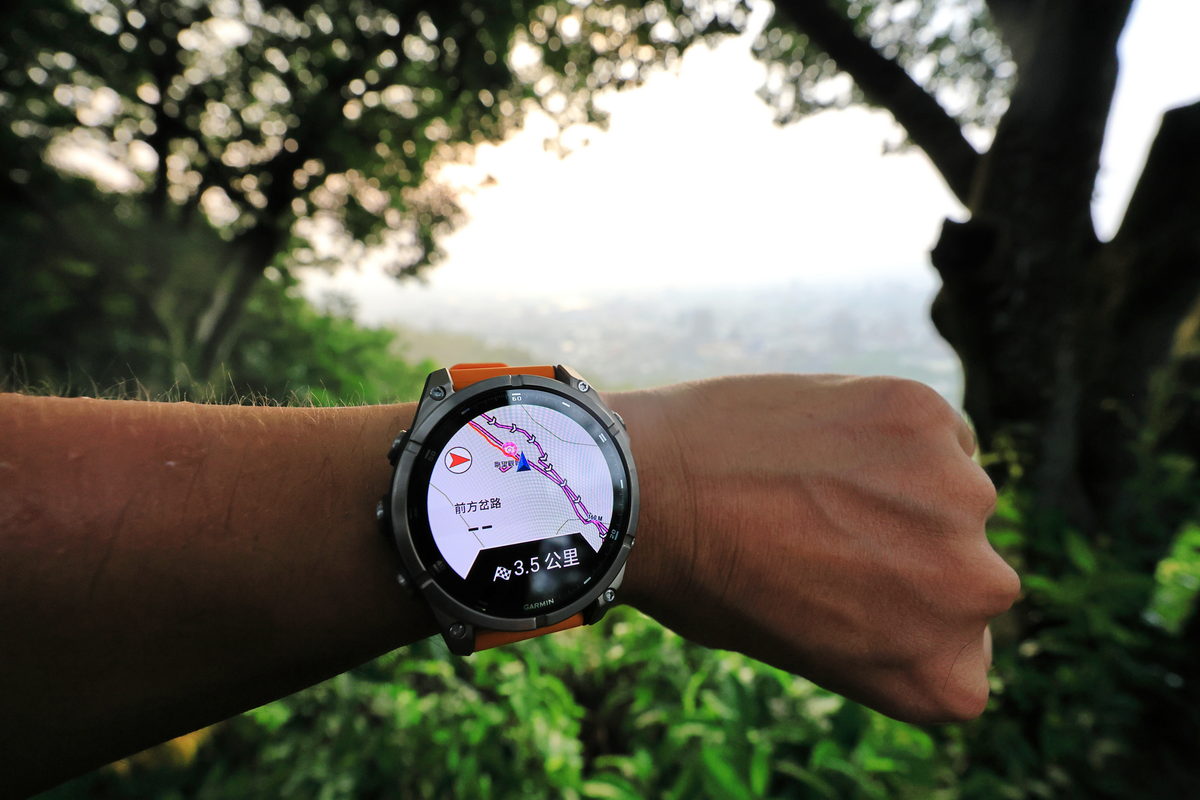 分享完路徑後,按下開始路線,這趟體驗旅程就此正式展開,此時錶面的活動資訊上,從運動時間、距離/配速、心率、上升/下降的海拔、與當下時間以及日落時間對應等在野外相當實用的資訊,同時在地圖頁面中,更可隨著路徑指引的導航安心地前進,而且當我們走錯路時,FĒNIX 8隨著震動與聲音提示之外,同時在導航頁面中的路線也會呈現紅色的行經路徑,讓使用者可以相當明確的找回正確的路徑,相當實用。