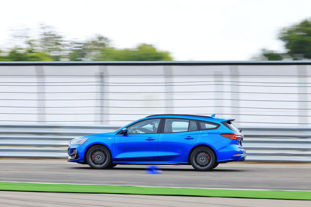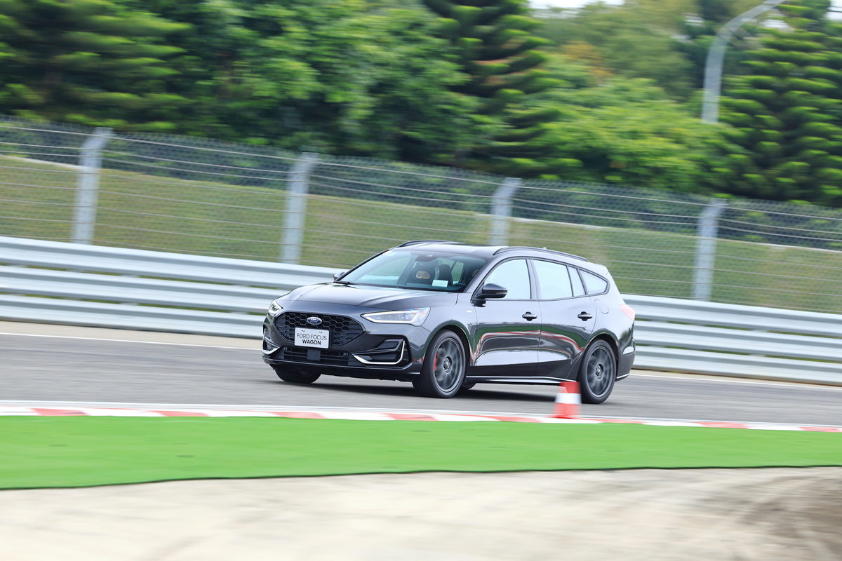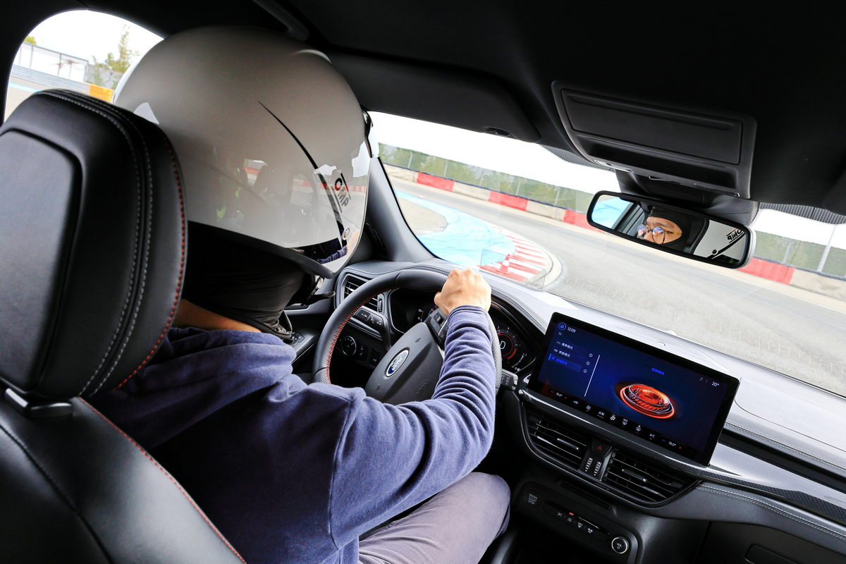 首先我們這組以Ford Focus旅行車行進行彎道操控為駕駛體驗開端,在此關卡的體驗重點為G2賽道的3號彎作為出發點,藉著4號髮夾彎與5-8號的長距離複合彎體驗Ford Focus旅行車進彎時前後軸的穩定性,同時於減速進彎後出彎再加速之動力湧現的加速延續性為體驗重點。輪到我戴上安全帽,坐上車、調整好座椅與方向盤的正確駕駛位置,並開啟運動駕駛模式,在教練的引導下大腳油門朝4號髮夾彎奔馳,本來預期車長將近4.7m的Ford Focus旅行車會因為短距離的加速衝刺後隨即踩下煞車減速進彎,其呈現的重心轉移慣性會因為近4.7m的車長,讓後軸無法像僅4.4m車長的掀背車有著如此敏銳的跟進性,沒想到在這一趟下來卻是令人意外的有趣,因為Ford Focus旅行車透過Ford C2底盤給予的紮實剛性,搭配含有副車架、防傾桿之後獨立多連桿懸吊結構,同時ST-Line調校後的車高10mm降低之設計,過往旅行車於過彎時常會覺得後座與前座距離相當遙遠的隔閡感,透過上述的設計更是一掃而空,不會因為轉彎後,覺得前座已出彎,後座卻還擁有入彎時向外側傾的離心感,同時在搭配這顆EcoBoost 182的1.5L三缸渦輪增壓引擎,其輕巧的小排氣量給予出彎時24.5kg-m的加速扭力,讓看似不靈活的旅行車,也不負Ford Focus向來強調的靈活刁鑽之盛名,連Ford Focus旅行車也能在享受寬敞乘坐、裝載空間的同時,享受操之在手的駕馭樂趣。