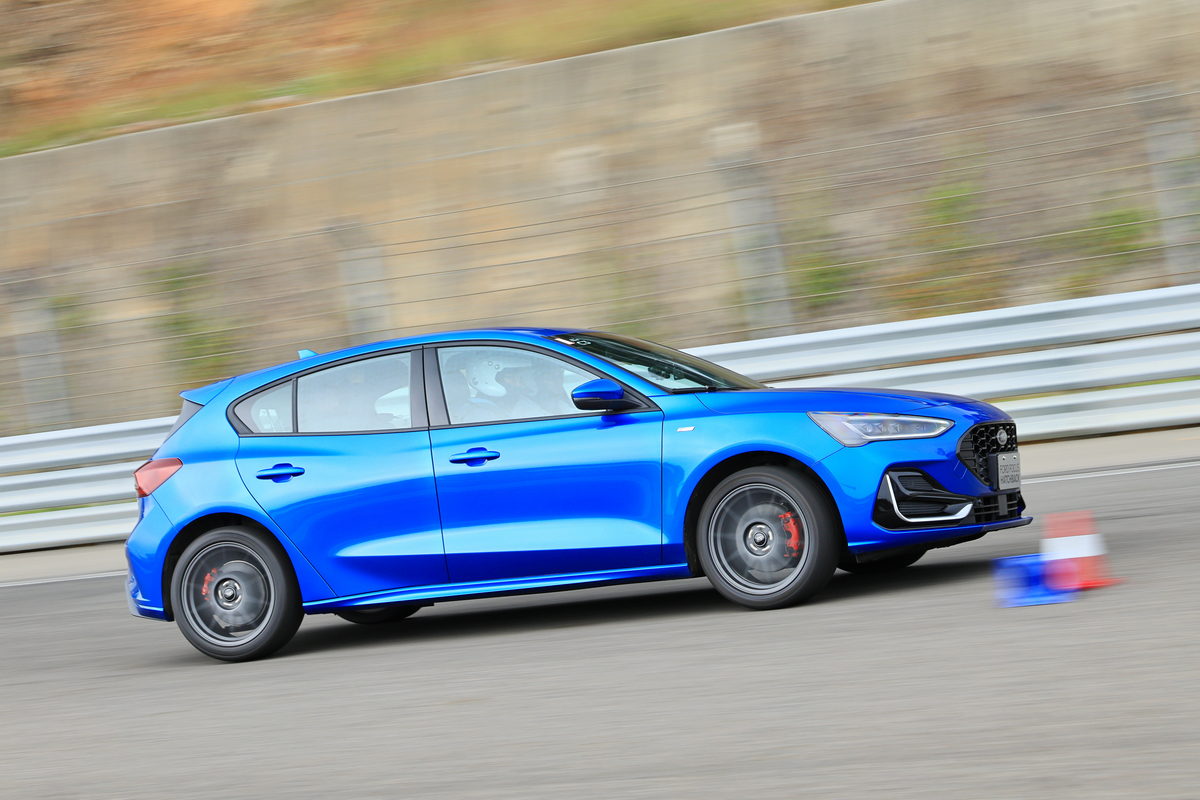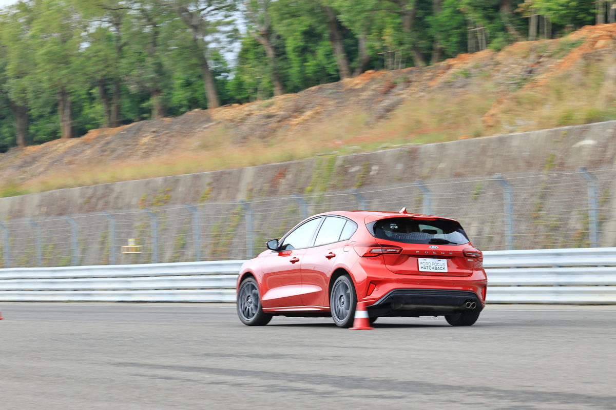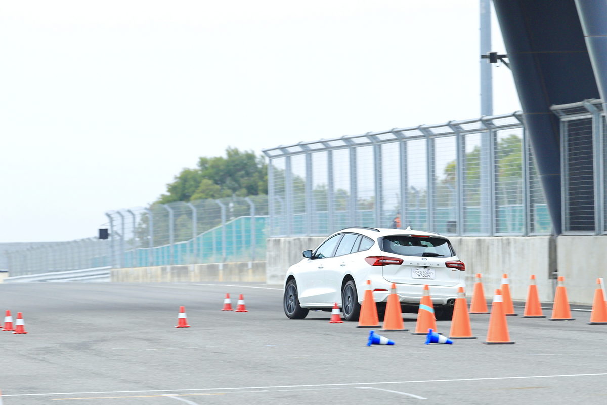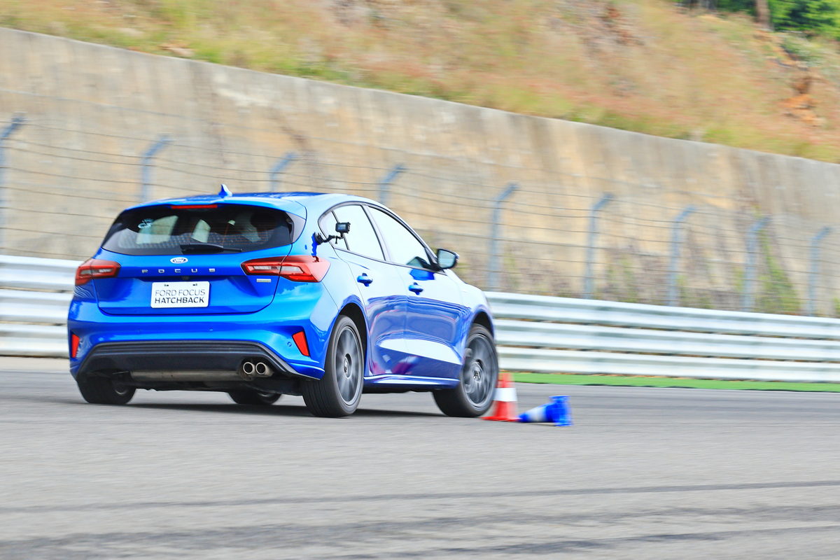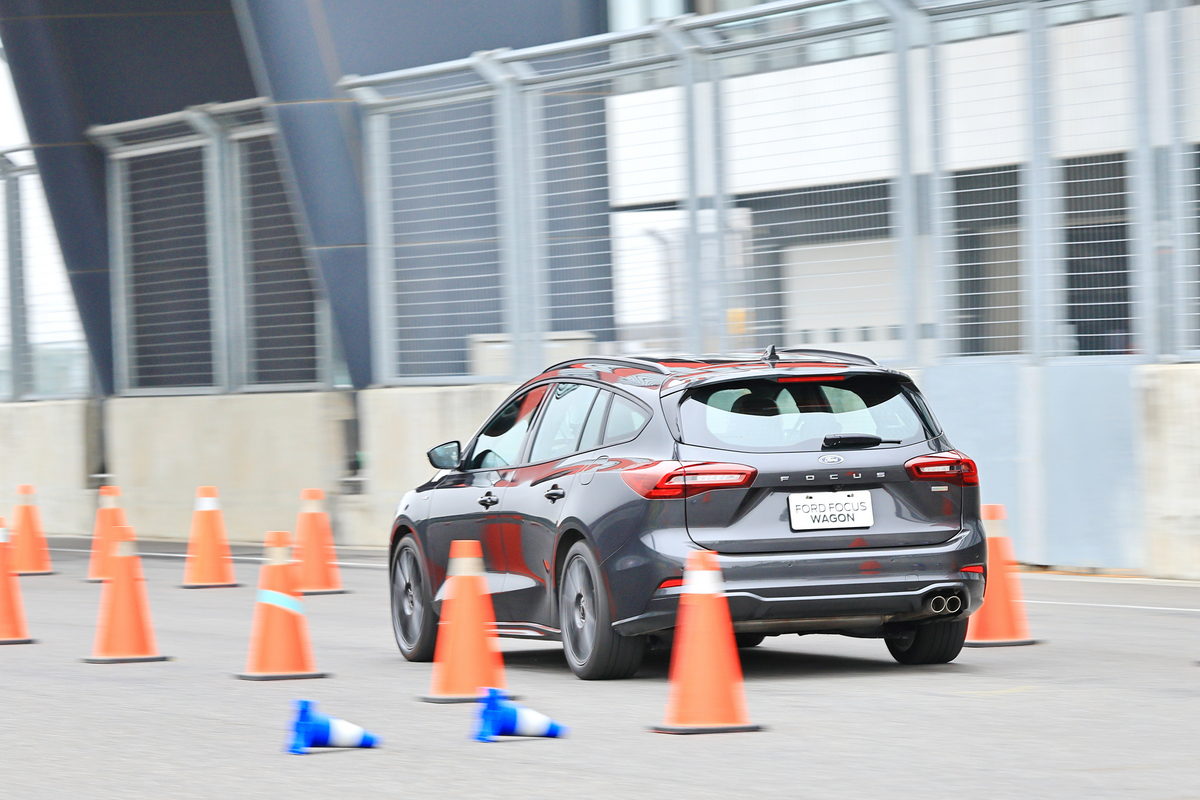 最後我們回到賽道大直線的龍門架下,開著Ford Focus旅行車進行高速換道體驗,在這一段體驗,不僅結合了彎道操控與連續繞錐的駕駛技巧,同時增添大腳油門向前奔馳時,遇見前方突如其來的障礙物(如動物、前車貨物掉落等),透過快速轉動方向盤進行閃避反應後並回正,特別是在這個緊急狀況下,無經驗的駕駛人多會下意識地在轉動方向盤同時踩下煞車,這個動作卻是大幅增加輪胎側向慣性負擔並失去抓地力而有著極高的失控風險,因此在這安全的環境下體驗日後行駛於高速公路時可能發生的狀況,更是難得的經驗,大膽的將右腳放在油門上,而不要踩著煞車,轉動方向盤進入閃避點時,放心交給C2底盤的Ford Focus,不僅底盤帶來的紮實感之外,同時藉由ETS、ESP、TCS甚至是ESA閃避轉向輔助等電子系統的輔助,緊急閃避變得更為輕鬆寫意,同時大幅確保高速行駛中瞬間大幅轉動方向盤進行閃避的車身穩定性,不僅在賽道內感受了Ford Focus轉向時如同熱刀切奶油的快意樂趣,同時也增添日後一般道路駕駛時更安定的反應經驗呢!