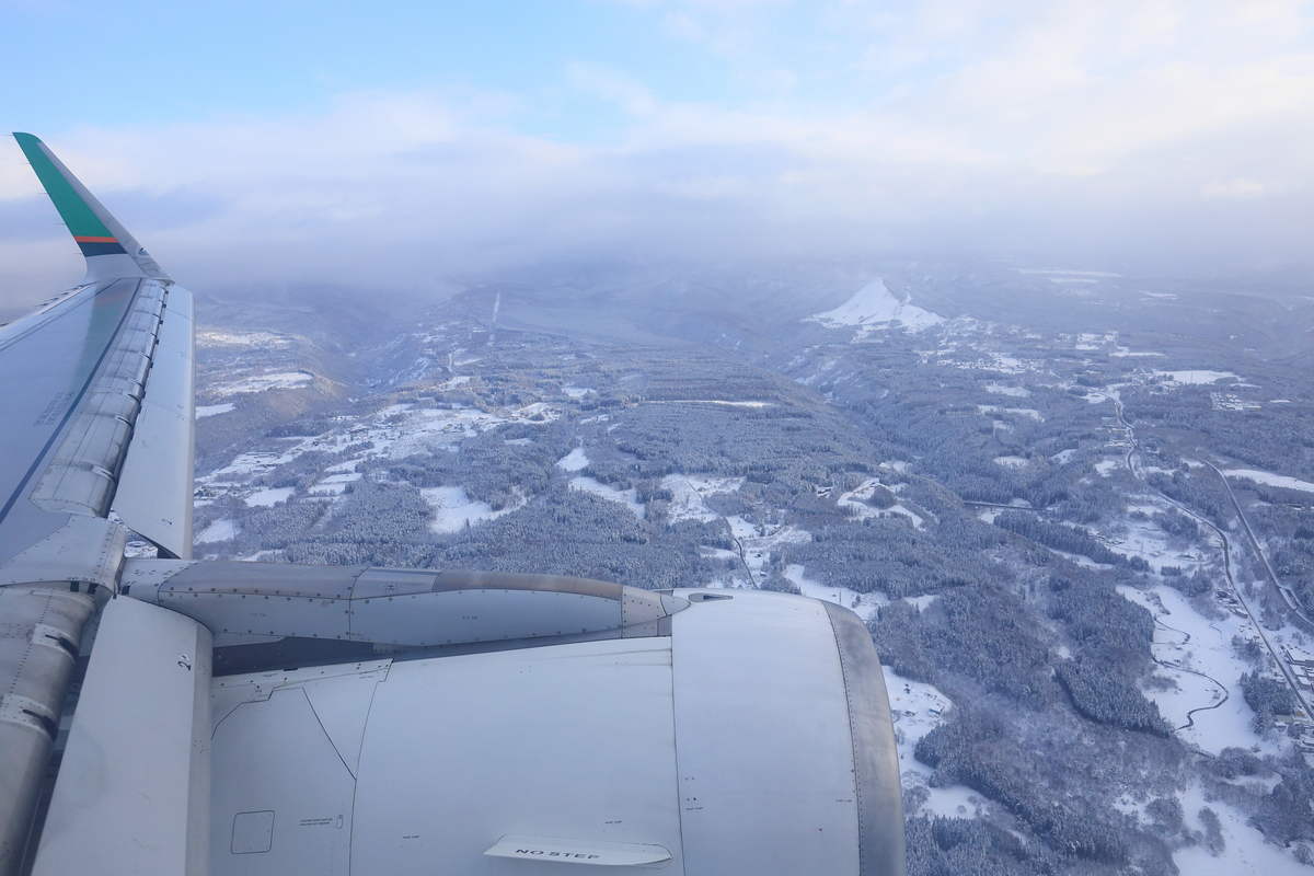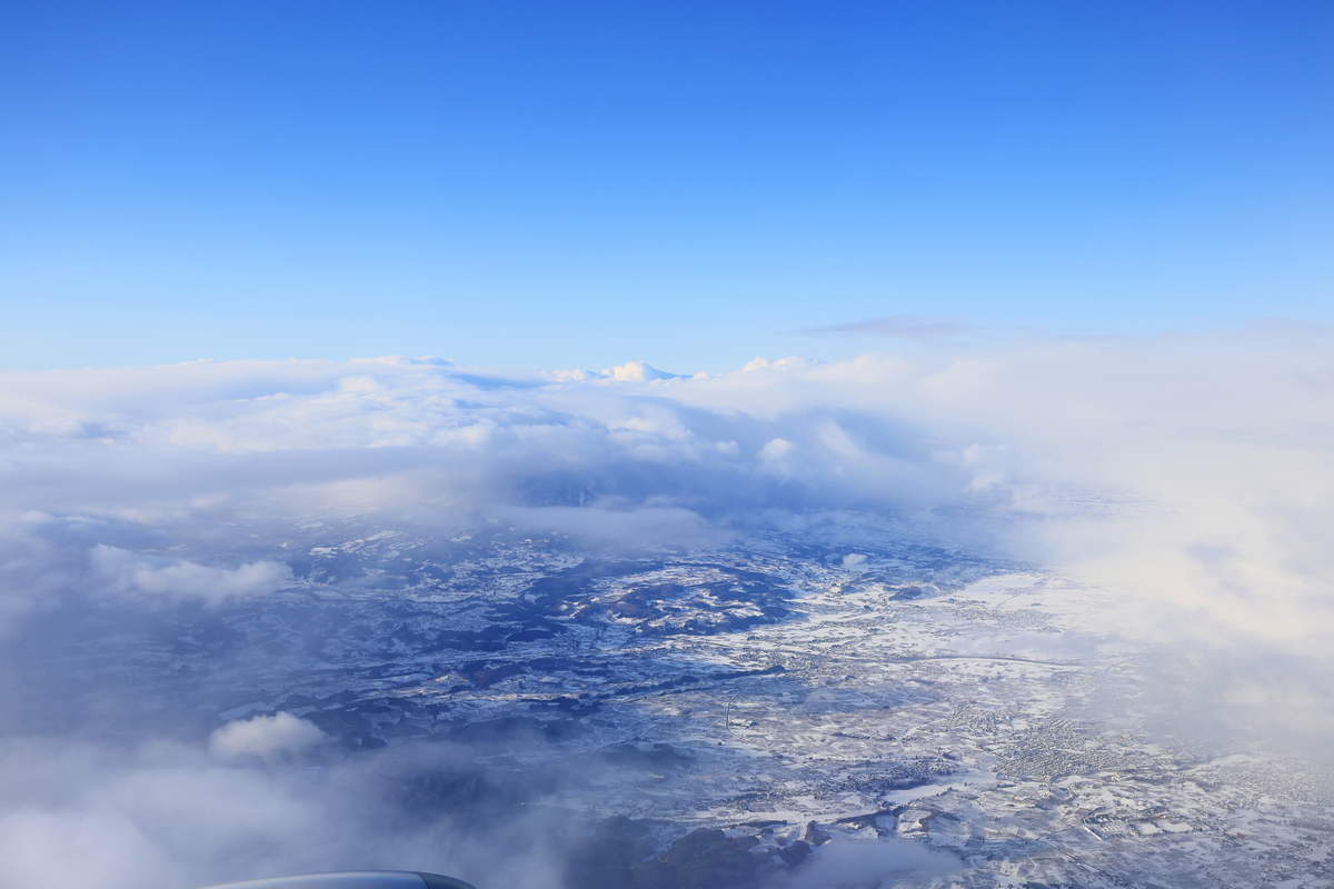抵達桃園機場,進入機艙隨著飛機一路起飛穿過冬季厚重的雲層,抵達近4萬英呎的高空巡航,盡覽湛藍天空映襯著日本九州島上冒著冉冉煙霧的壯麗櫻島火山,以及靠近本州北邊時,帶著陽光暖黃色溫的雲海與地面被大雪覆蓋而成的銀白色山嵐景色,讓這段前往日本青森的3.5小時飛行時間變得相當唯美舒適。