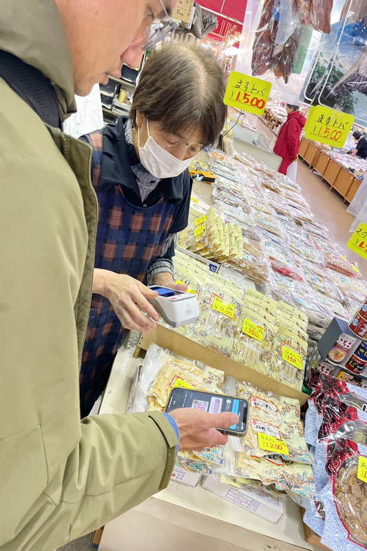 本以為在這些行程中,像是土產、漁市場等級為在地的小店無法使用行動支付,沒想到結帳櫃台上有著偌大的PayPay標示,以及標示旁的QR Code,才發現原來PayPay有著如此高的普及化,當我在土產店中向祖母等級的老闆告知我能否使用PayPay支付時,她也相當乾脆且俐落的拿起機器掃描我手機中iPASS Money APP 的PayPay QR Code來完成支付,她的熟稔動作,一點也沒有覺得麻煩或是不順暢的排斥感,整個消費過程,更是非常快速的輕鬆寫意。