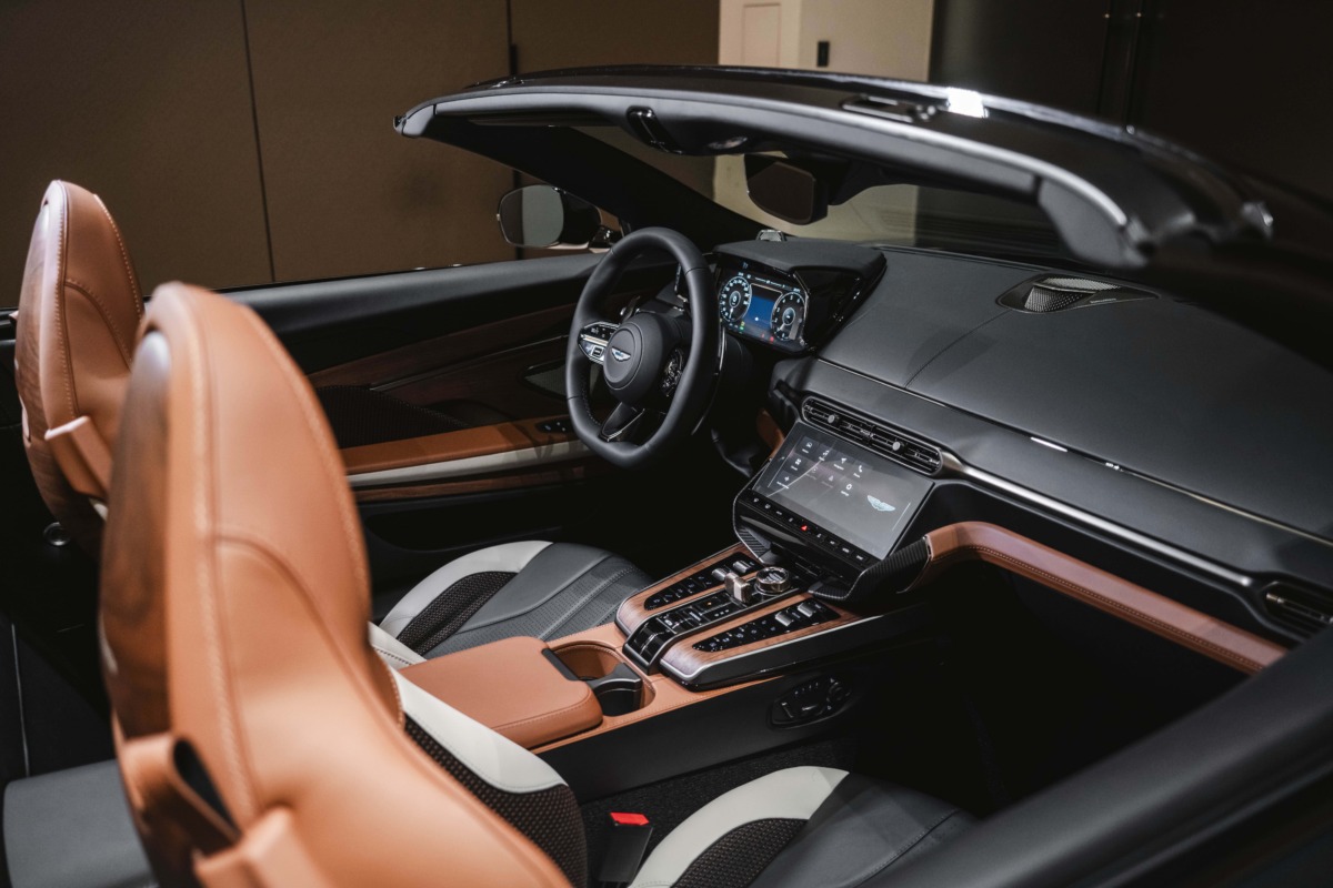 車室內裝採專屬三色配置,結合 Centenary Saddle Tan 馬鞍棕、Ivory 象牙白與細緻手工編織皮革,搭以深色胡桃木飾板與古銅金金屬控制旋鈕,並融入 60 週年專屬頭枕徽飾與胡桃木椅背工藝,營造層次豐富且極致奢華的座艙氛圍透過 Volante 60 週年紀念的到來,結合 Vanquish Volante 之 V12 純粹動力與 Q 客製化部門的精湛工藝,打造出兼具性能與藝術價值的非凡大作。