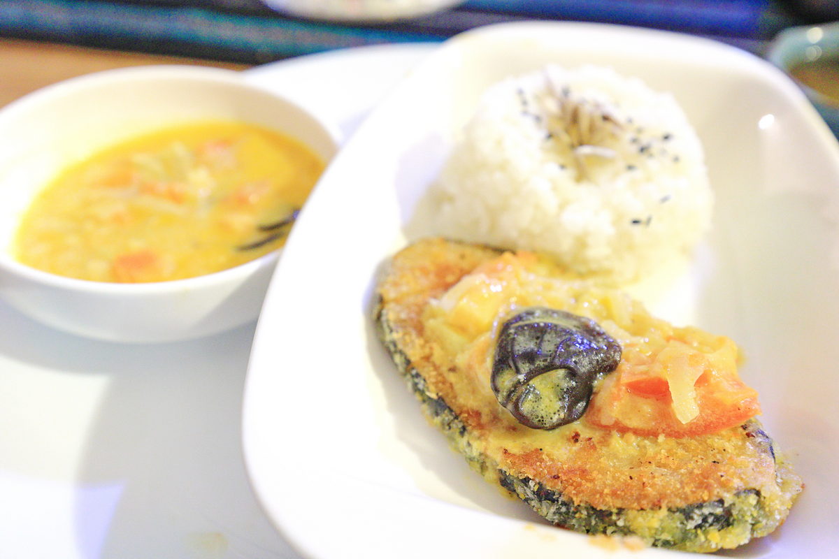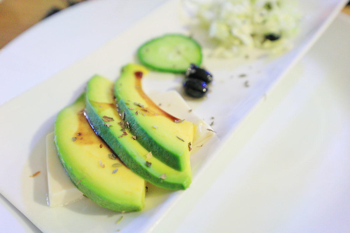 其實此行拜訪Yuli,除了欣賞她收藏摩卡壺的樂趣與精湛的織布皮包技巧之外,更是來感受她“全素”的無菜單料理,對餐餐皆有肉的我來說,過往品嘗全素的餐食不外乎為佛道的信仰餐食體驗,而這類的餐食料理方式多為將豆類加工品以更為濃郁的醬料、油脂進行拌炒、煮食而成,也因此在用餐前我也有著先入為主的觀念,抱持著有點敬謝不敏的心情迎接Yuli準備端出的全素餐。卻沒想到開胃菜居然是令人意外的鮭魚生魚片?這道鮭魚生魚片可不是真的鮭魚,卻也不是豆類加工製成的素魚所刻意製造而成的鮭魚味,而是一片片鮮切的酪梨佐上芥末醬油而成的一道開胃菜,說道這邊你一定很懷疑,鮭魚哪裡來?當下我也相當懷疑,而在Yuli提及曾不吃素的她,在她相當會做菜且為虔誠佛教徒而吃素的先生,為了讓Yuli也能感受充滿鮭魚口感的素食而創造的料理,將酪梨片沾上些許的芥末醬油,準備入口品嚐前,輕閉雙眼後細細品嚐後,所有的疑惑一切豁然開朗,又稱牛油果的酪梨,本身富含油脂的滑口氣息,搭配軟嫩的口感以及芥末醬油些微醒腦的鹹香,對!這就是我們平時在日料店所品嚐的鮭魚生魚片,真是太神奇了。