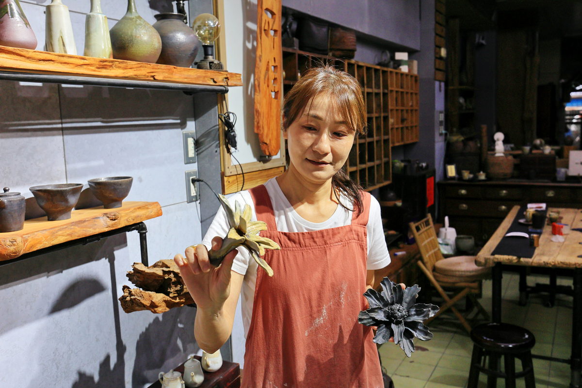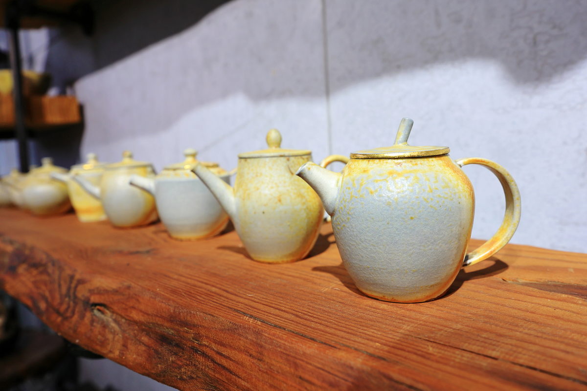 欣賞完一幅幅令人讚嘆台灣之美的空拍鉅作,隨著老街步行漫遊,其中一處【斯土有情陶燒工房】更讓這條古樸的街道增添現代藝術的點綴風貌,走進工房內,主理人溫怡宏與王秀嫻這對夫妻以家鄉旁的立霧溪泥為材捏陶成形,以不上釉藥的技法,讓陶土藝品藉著窯爐內燃燒柴火產生的高溫、落灰隨之沾附,進而有著如同釉藥的光澤卻更多了獨一無二的花紋與質感,不僅像是藝術家與大自然緩慢對話後的精美結晶,更是品味藝品享受品茗生活的最佳體現呢,很可惜此行造訪的時間不足,若能與他們一同體驗捏陶窯燒,製作專屬自己獨一無二的柴燒茶具,一定更充滿來自立霧溪風土的魅力呢。
