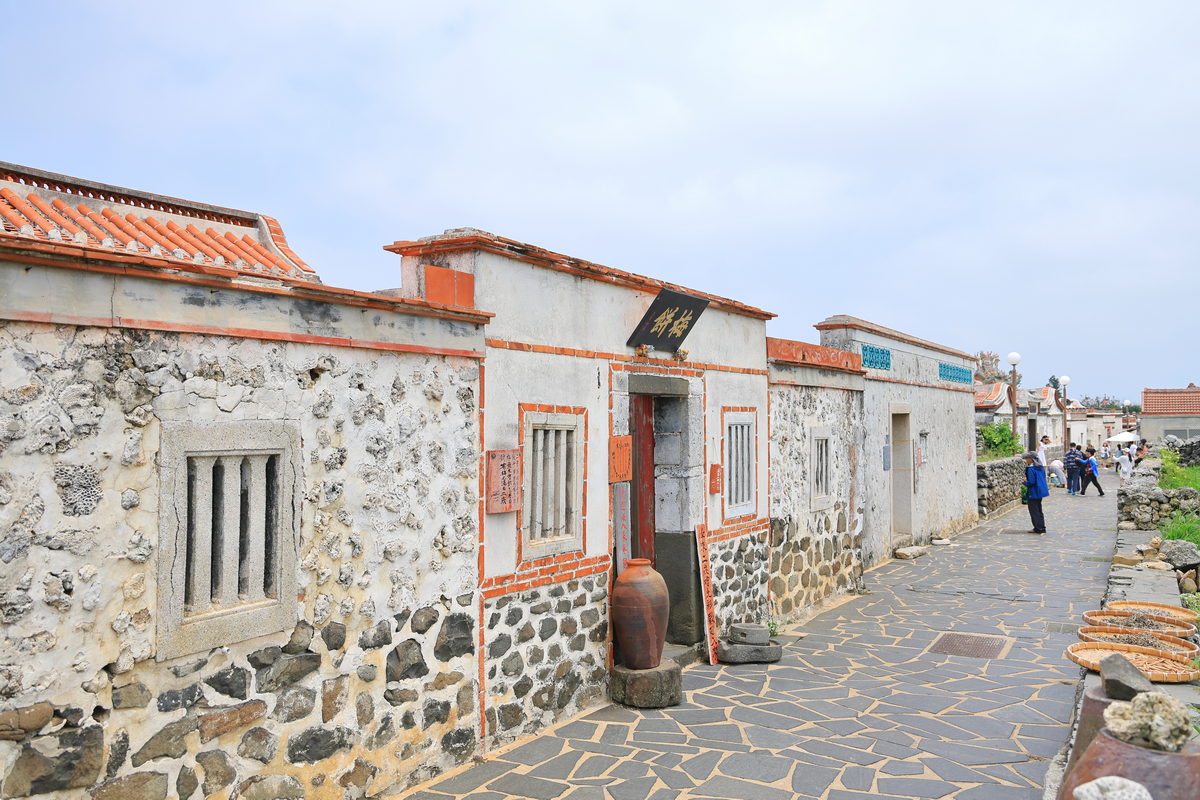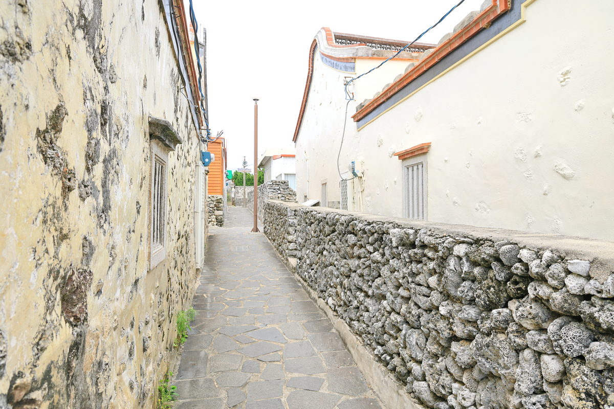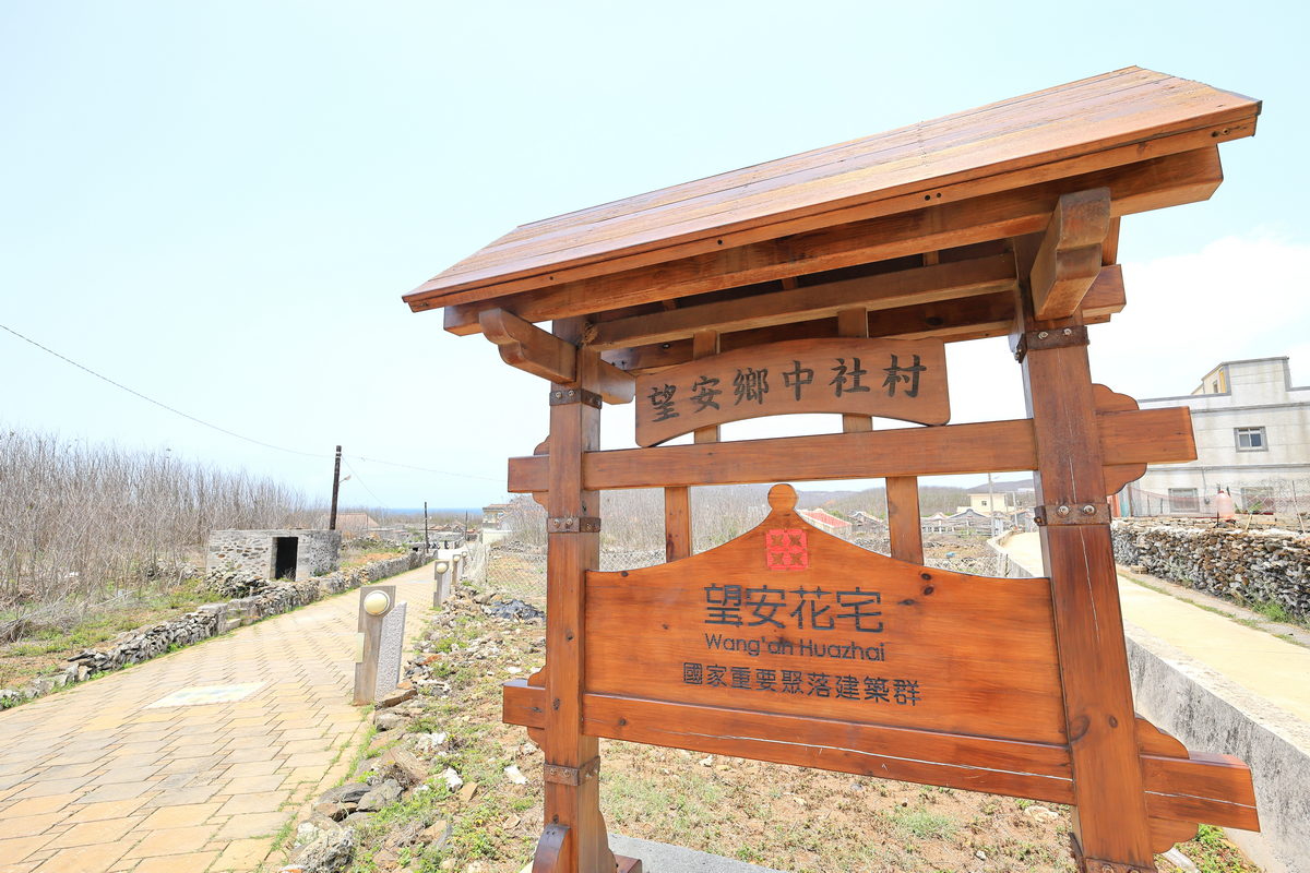 在七美短暫的到此一遊後,我們回到碼頭搭船轉往望安鄉接續下半段行程,對比在七美的陰天,抵達望安時頓時天氣晴朗,回歸海島獨有的湛藍光彩,抵達望安的首站,我們便隨著遊覽車前往有著300年歷史的花宅聚落,對比在本島的老宅聚落,花宅聚落不僅將咕咾石以更為細緻工整的堆疊方式構築牆面,同時隨著腳步漫遊其中,欣賞聚落中雙喜字樣的牆面、斑駁的青銅獅門環、門牌抵達透澈碧綠的中社海堤,即可感受昔日稱作網垵的這座島嶼,人們在此靠著豐富的漁業資源而興盛繁榮,構築如此櫛比鱗次的聚落形式,同時在閒暇之餘在沙灘上曬網的漁村熱鬧光景呢!