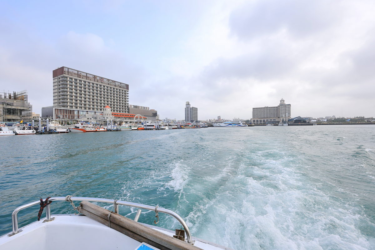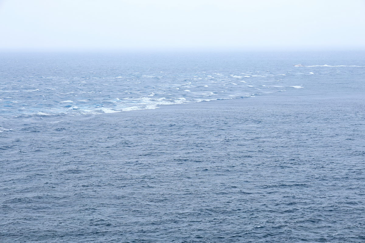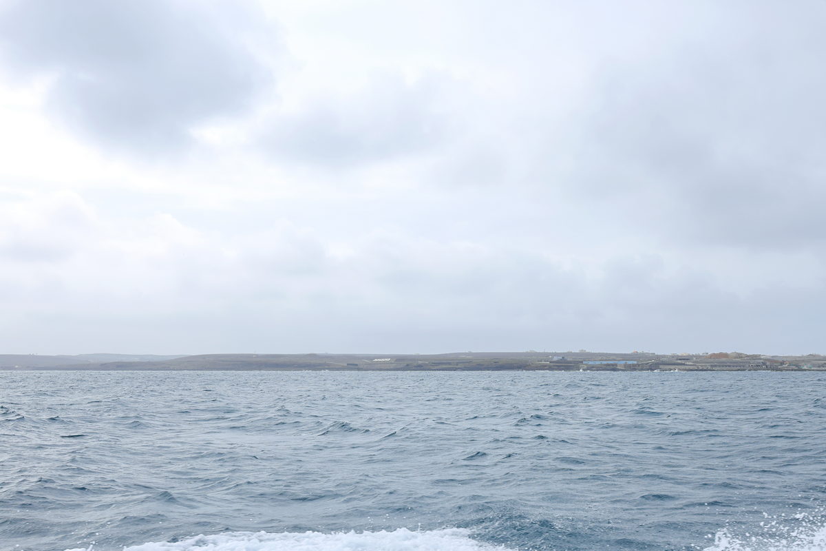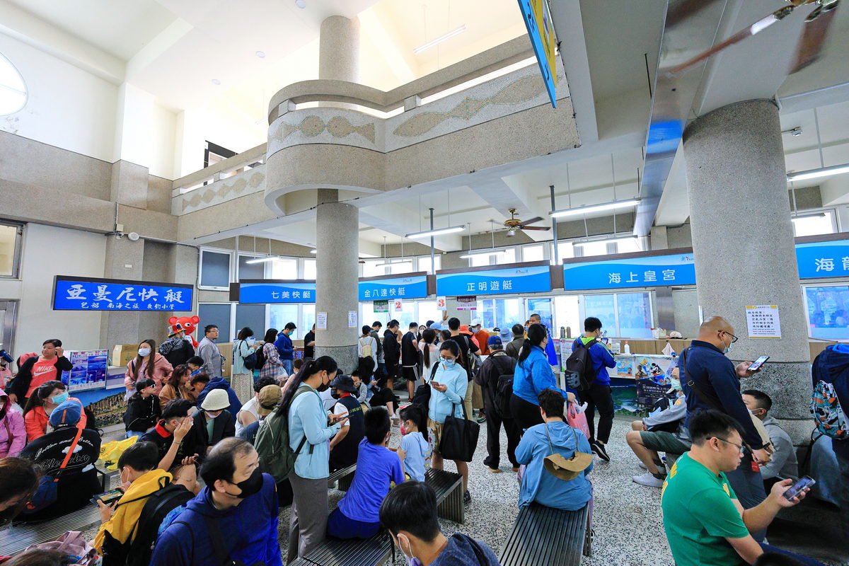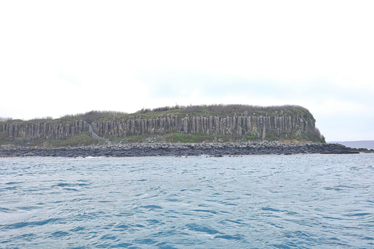在早晨8點前,我們抵達南海遊客中心準備報到時,遊客中心內已擠滿人山人海的熱潮,看來大家都被連續幾日強風因而取消的行程悶壞了,在櫃台完成報到手續後,隨著工作人員一同進入碼頭準備登船前往跳島首站七美嶼,只是,雖然風勢轉小得以出航,但天空依舊維持烏雲密布的陰暗,在駛離馬公港時,行經澎湖內海還沒有感覺,直到隨著交通船欣賞桶盤嶼、虎井嶼的沿岸筆直抬升的玄武岩地形後,船程約90分鐘的七美嶼航線,開始有著相當大的波濤起伏,搭配著陰鬱的天氣,實在令人感到可惜與不快,但也顧不得這些,讓自己坐在最為平穩的船尾處,保持著最佳的精神狀態抵達七美嶼,才不會因為暈船而盡情暢遊呢!