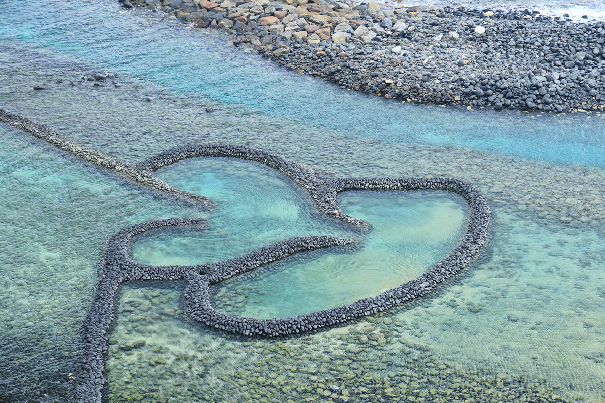 抵達七美嶼後,隨著工作人員引導前往觀光巴士進行七美嶼的導覽,首站我們來到最為知名的地標【雙心石滬】,石滬~這利用海水漲退潮以及魚群洄游特性所構築而成的捕魚陷阱,在多達580個石滬的澎湖可能是有著世界最為密集的地方,也因此得以一窺澎湖近海漁業資訊相當豐富的狀態,其中最具知名度的雙心石滬,在當時以玄武岩、珊瑚礁(咕咾石)為建材,趁著每日僅兩次退潮的寶貴時間,逐漸堆疊成型,也因設計師以貌似兩個心型堆疊的滬房設計,讓這座石滬被譽為世界上最美石滬呢,雖然很可惜在陰天下欣賞這座石滬,但抵達時卻是身形最為凸顯的退潮之時,因此在觀景台俯瞰雙心石滬,不僅能完整欣賞石頭堆疊所形成的路徑陷阱,同時映襯著清澈見底的碧綠水色,更是相當優雅呢!