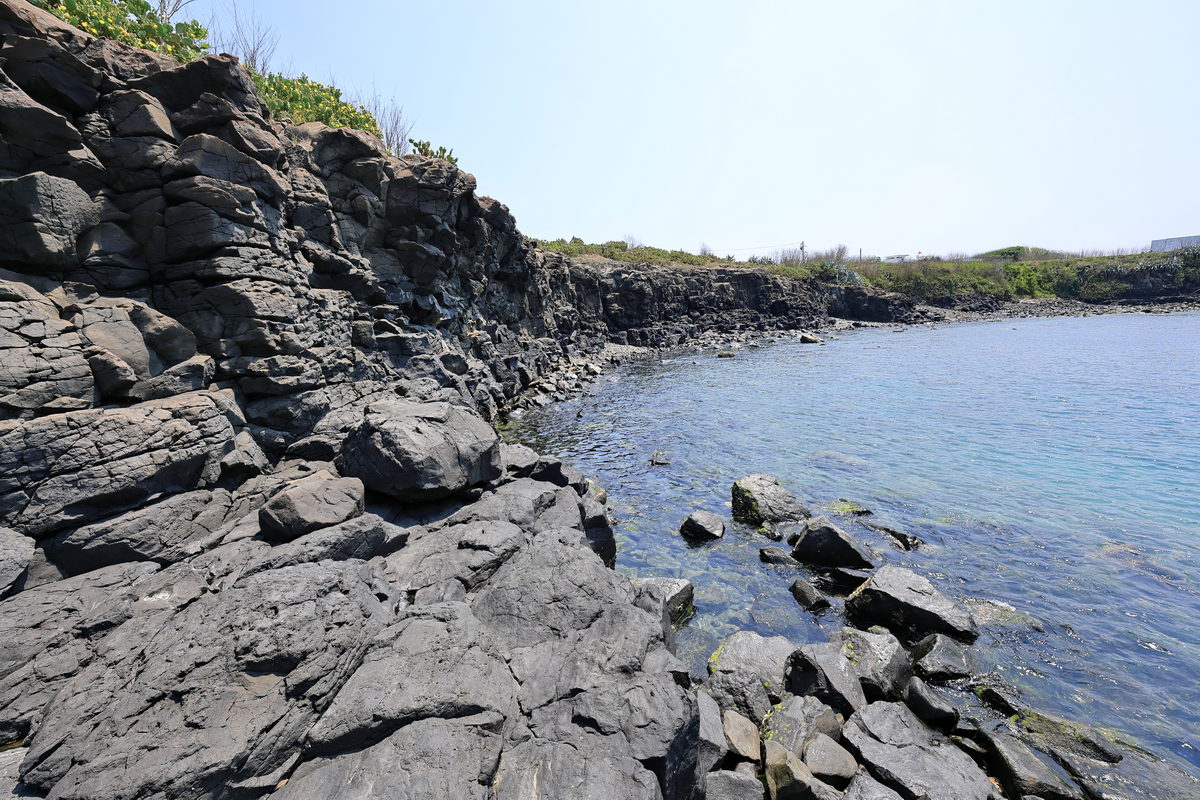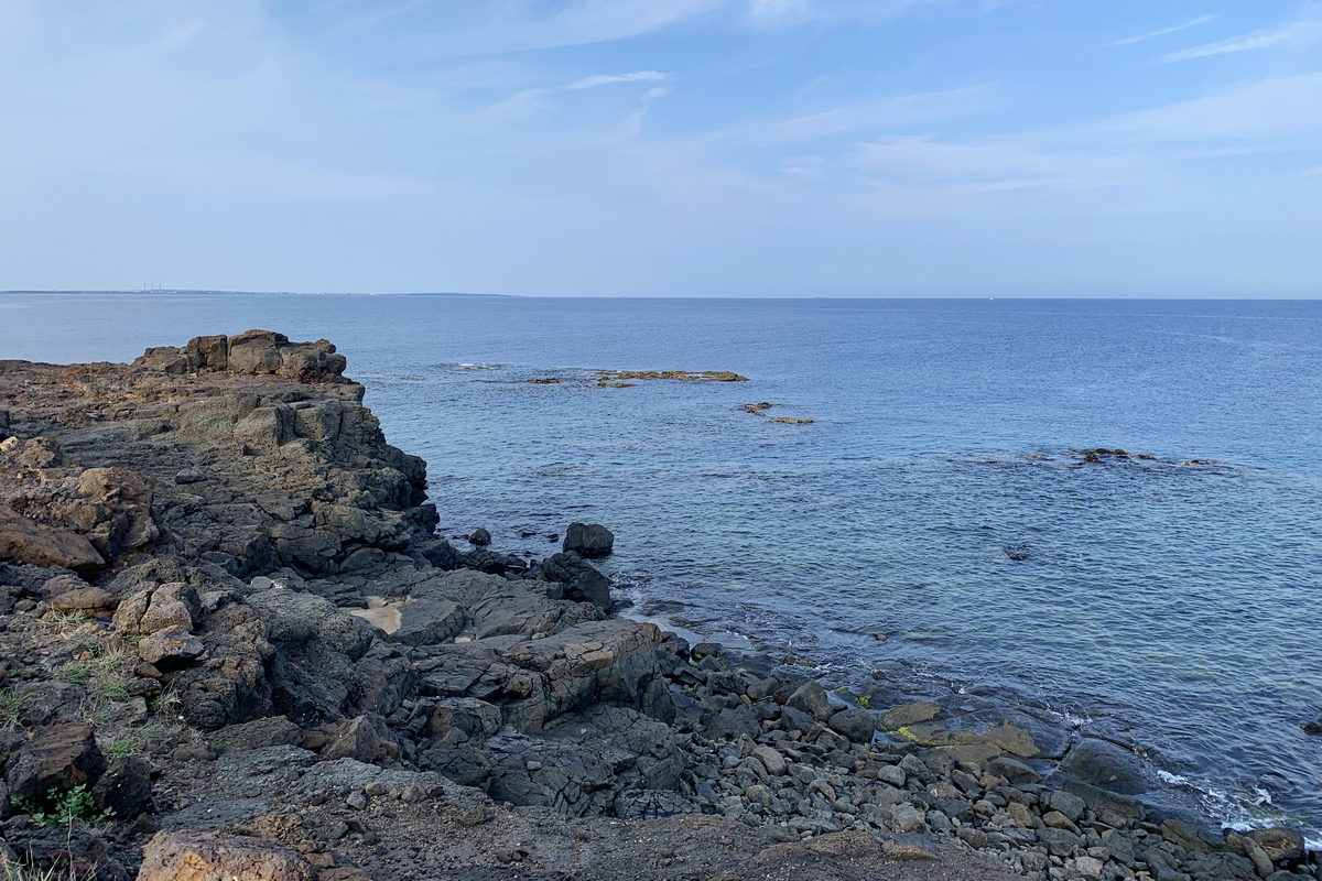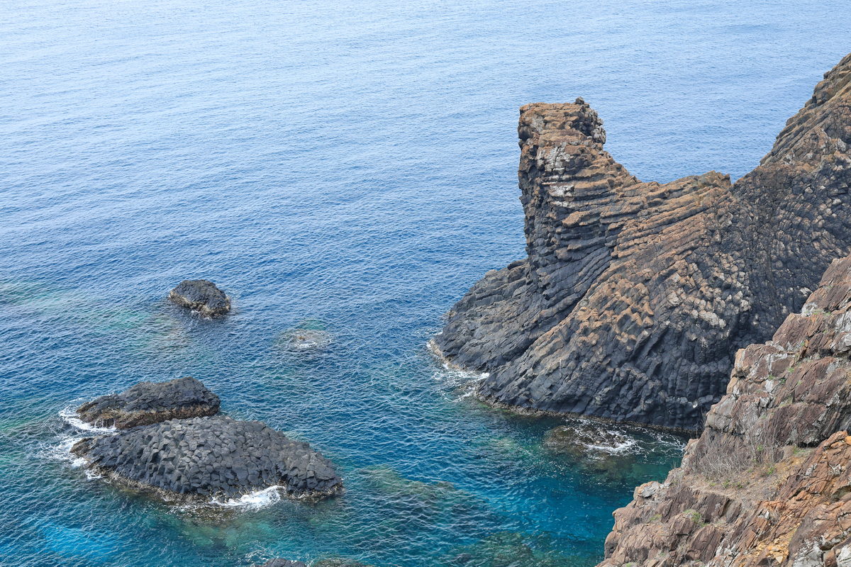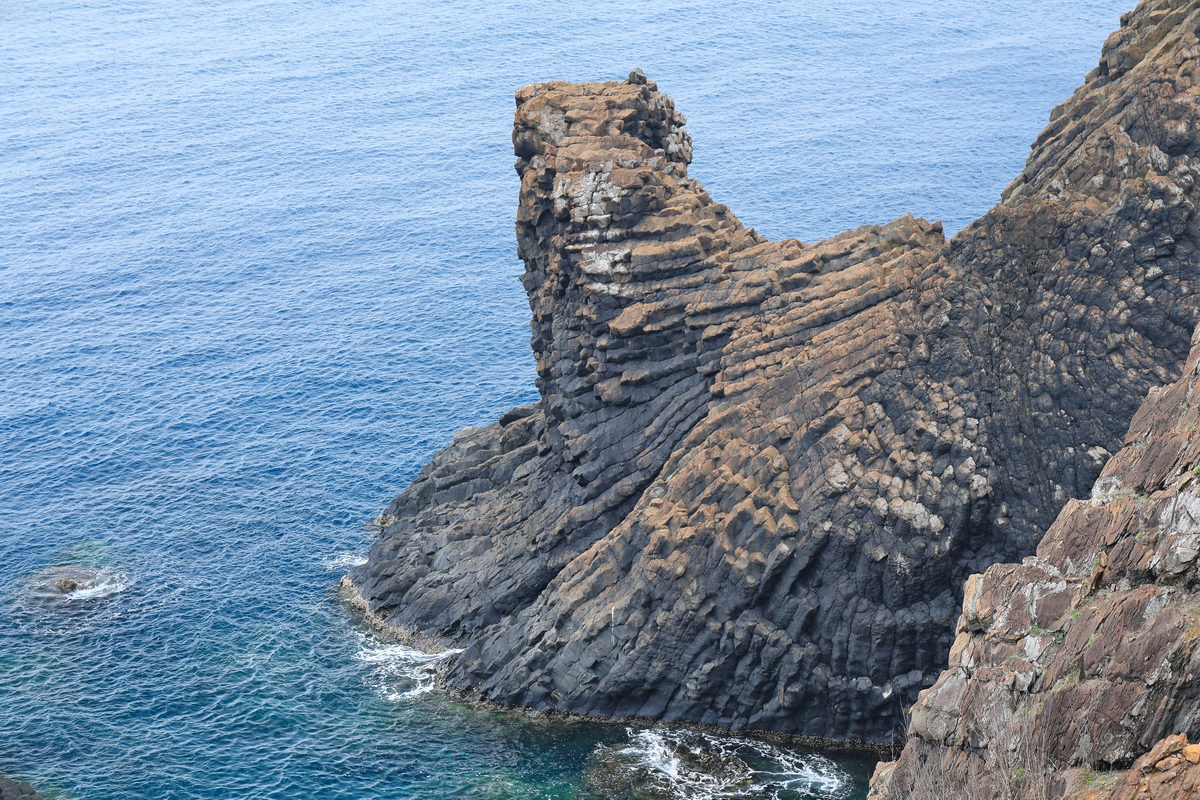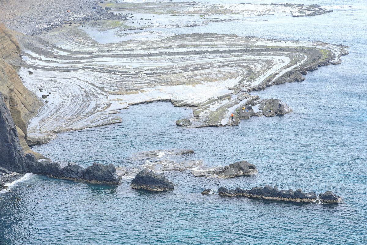 短暫停留新賞雙心石滬後,我們隨著遊覽車轉往【大獅龍埕風景區】,此處所稱的大獅龍埕,其實就如同台灣眾多離島一樣,藉著無比的想像空間,欣賞眼前的奇岩怪石,而由火山熔岩噴發後凝結而成玄武岩地形的七美嶼,在此處更能一覽玄武岩獨特的節理構造,其中所謂的大獅,即是眼前的懸崖,因長年海水侵蝕質地較軟的岩層,造就崖上猶如一隻石獅蹲伏望向大海之姿,同時石獅左側的海平面上,有著一片連結懸崖並緊貼著海面的岩盤,有趣的是這片岩盤的波浪造型,搭配著中間的斷差,隨著海浪拍打於此,是否也覺得很像蛟龍入海盤據於此的意象呢?雖然造訪七美嶼的天氣如此不美麗,但站在大獅龍埕風景區俯瞰眼前這片海岸,粗曠肌理的玄武岩地形,映襯著透澈見底的海水,卻是相當舒適靜謐,也因此讓我期待下一次選個晴朗的豔陽天,再次造訪七美嶼呢!